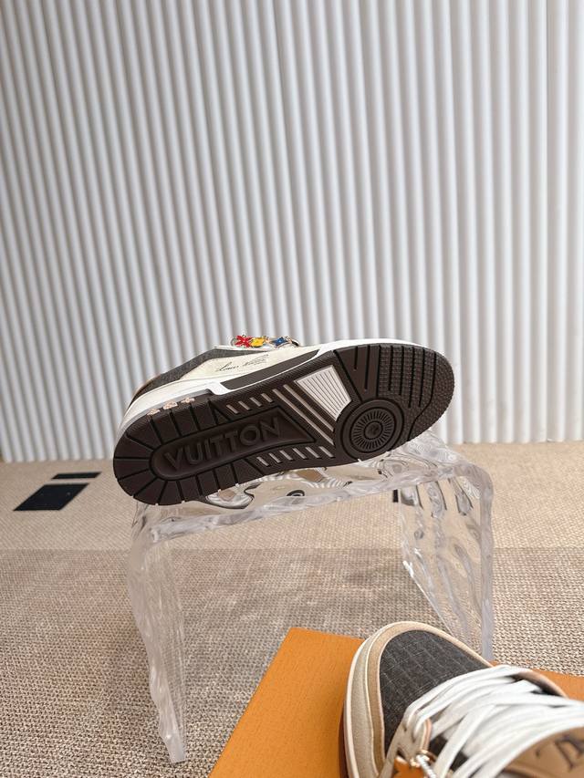 Lv Trainer Sneakers Are A Classic Creation Inspired By Retro Basketball Shoes By Designer Virgil Abloh. This Time, Smooth Cowhide And Monogram Embossed Grain Cowhide Are Spliced, And Monogram Flowers Are Used To Embellish The Rubber Outsole, Reflecting The Eye-Catching Jump In Color.
