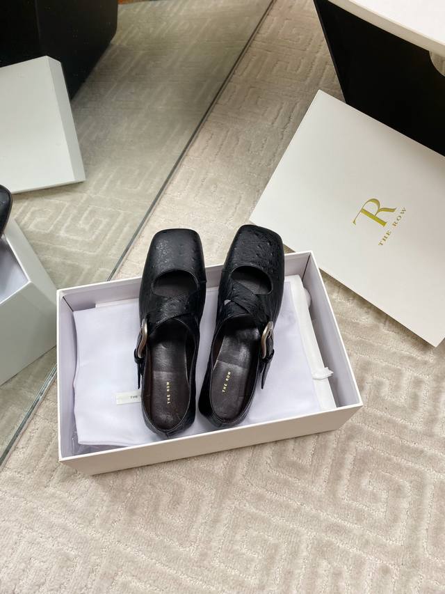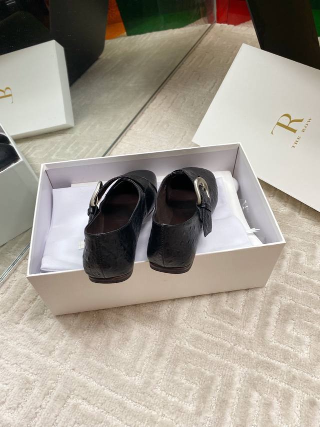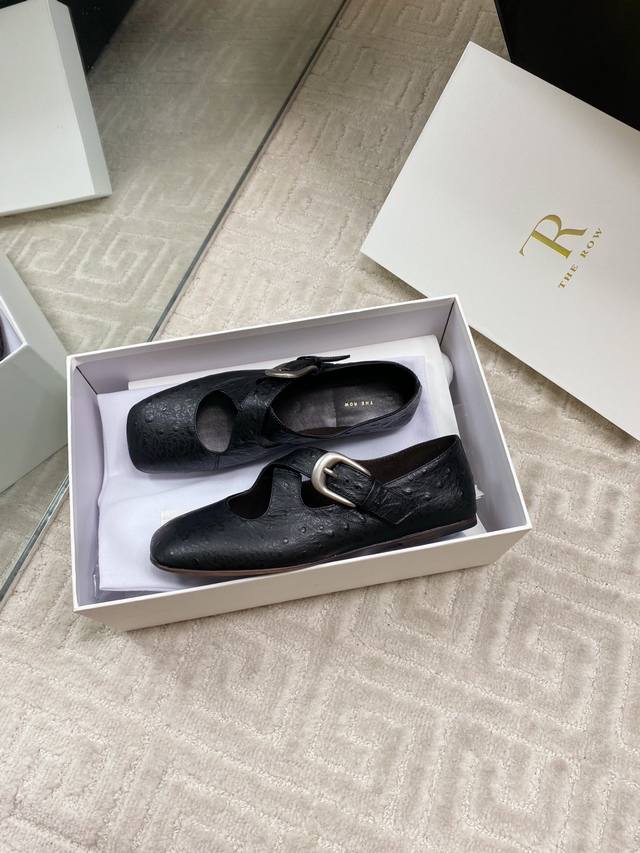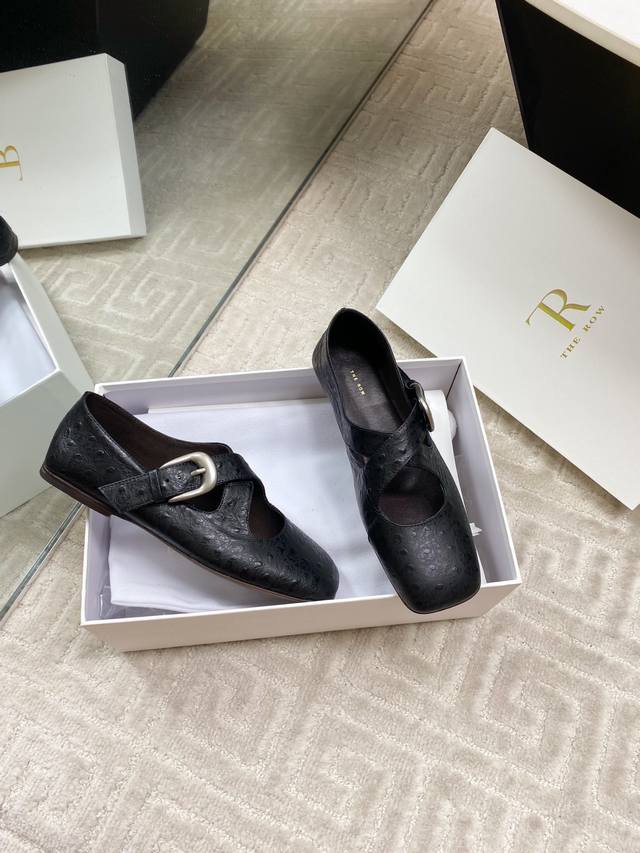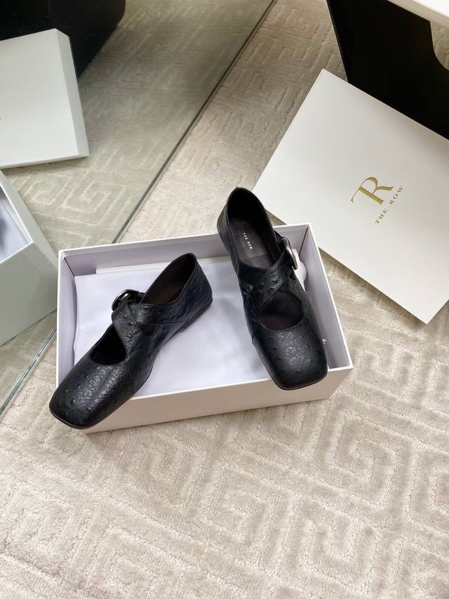 Factory The Row 25S Spring And Summer New Tr Minimalist Ostrich Pattern Small Square Head Mary Jane Flats Cross Strap Single Shoes