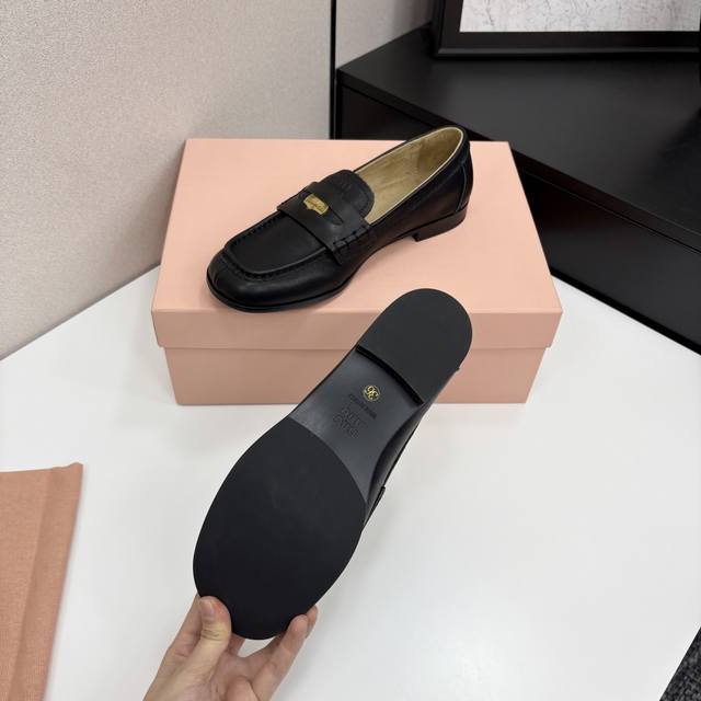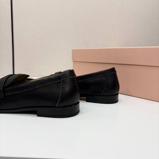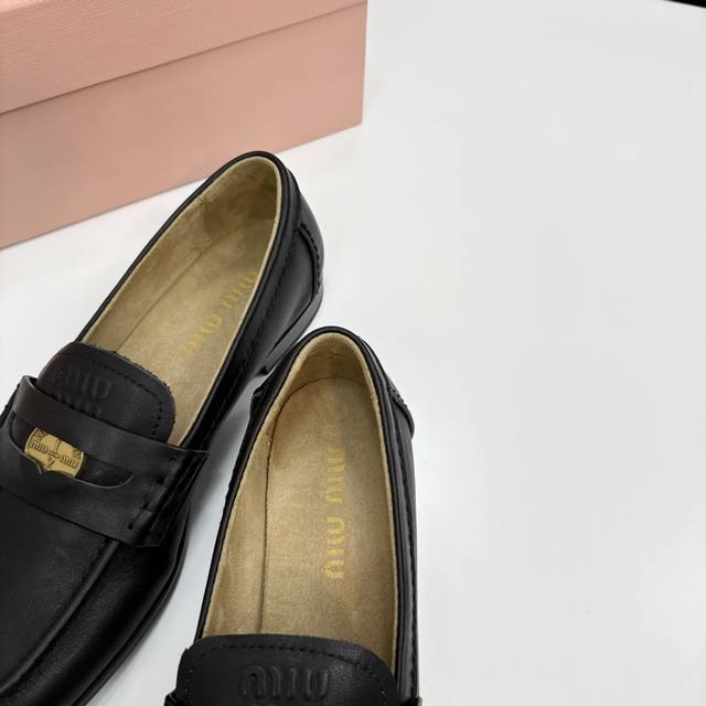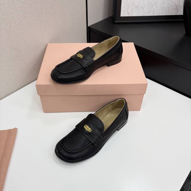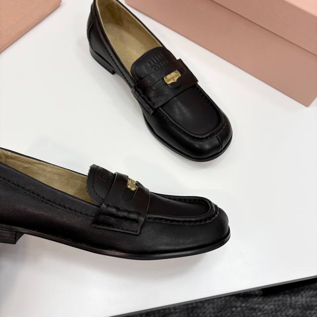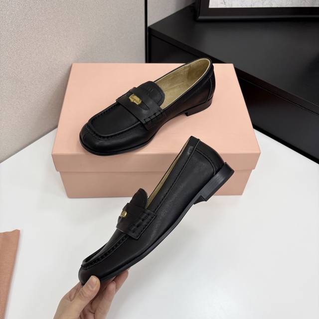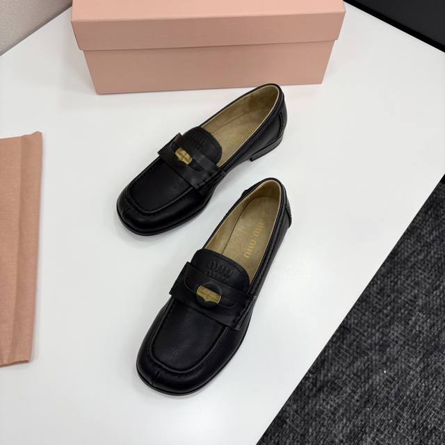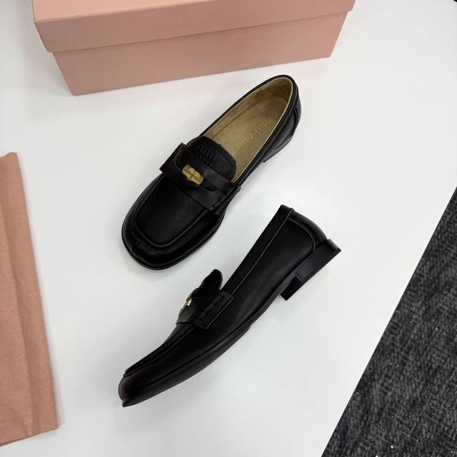 miu Miu 25Ss Miu Miu New Spring And Summer Square-Toed Loafers, Coin-Shaped Flat Leather Shoes