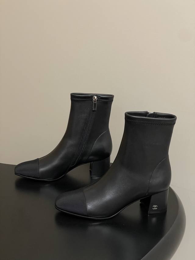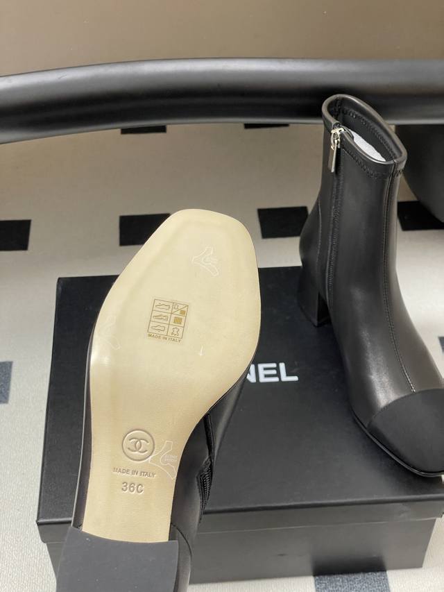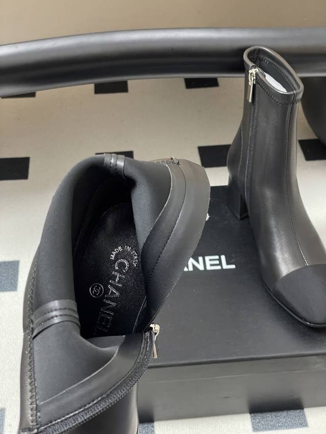 A timeless classic Chanel style. These square-toed, side-zippered stretch ankle boots with a chunky heel and a chunky heel are a runway style statement from the iconic Chanel collection. The side zipper allows for easy on and off! The stretch leather fabric is incredibly soft and provides a snug fit, creating a comfortable and elegant look. They'll elongate your legs! Upper: Custom stretch sheepskin Lining: Imported stretch Lycra Footbed: Goatskin Sole: Italian Grade A leather outsole Heel Height: 5cm Sizes: 35-39 34, 40, 41, 42 Made to order, no returns or exchanges