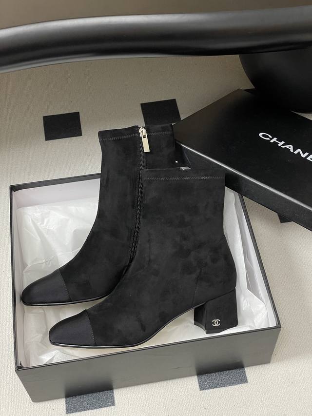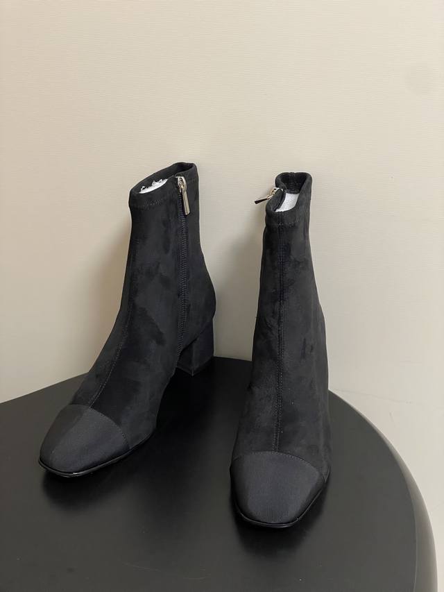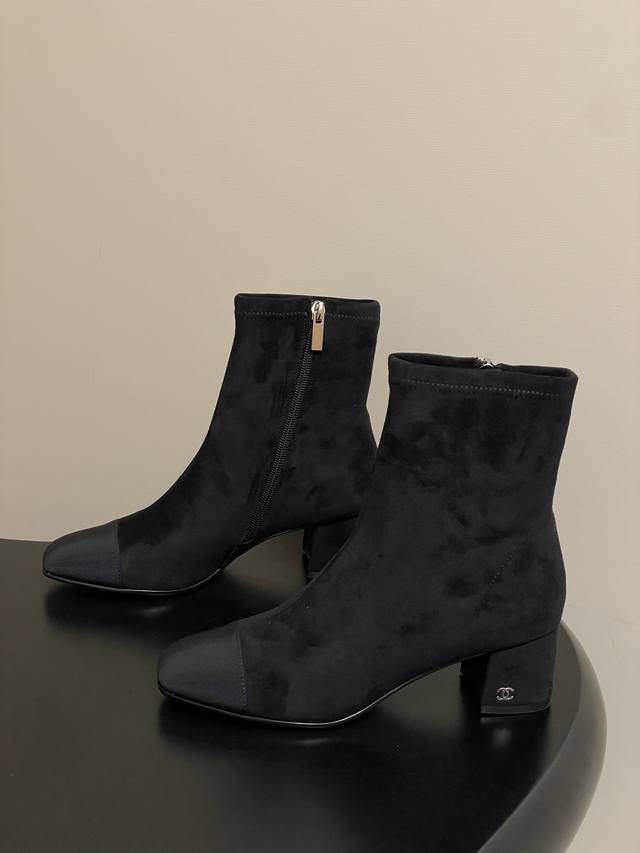 A timeless classic Chanel style. These square-toed, side-zippered stretch ankle
