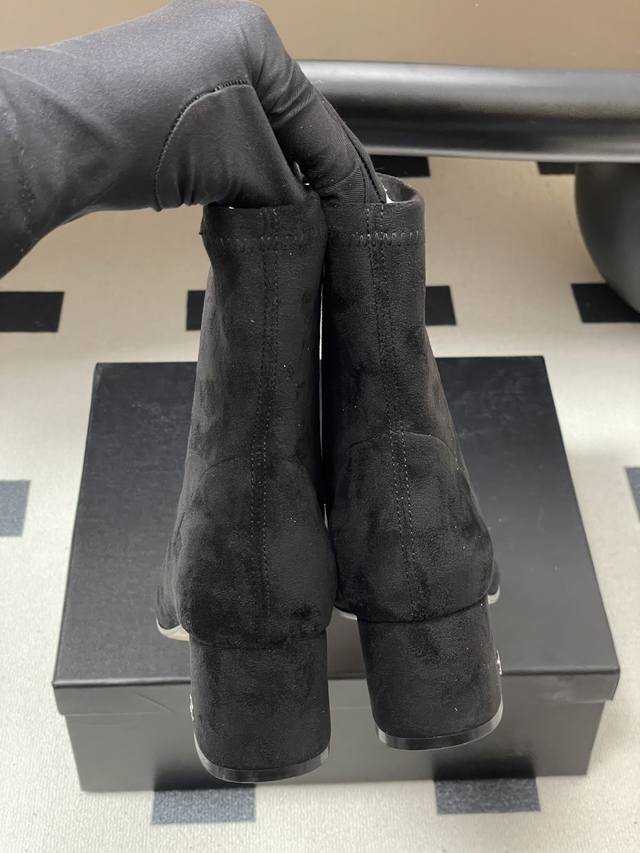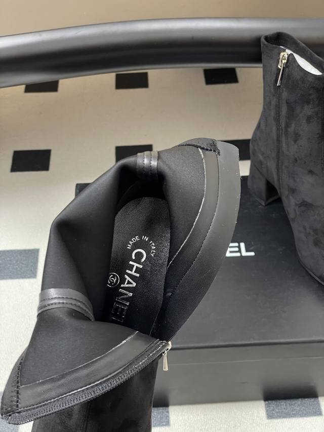 A timeless classic Chanel style. These square-toed, side-zippered stretch ankle boots with a chunky heel and a chunky heel are a runway style statement from the iconic Chanel collection. The side zipper allows for easy on and off! The stretch leather fabric is incredibly soft and provides a snug fit, creating a comfortable and elegant look. They'll elongate your legs! Upper: Custom stretch sheepskin Lining: Imported stretch Lycra Footbed: Goatskin Sole: Italian Grade A leather outsole Heel Height: 5cm Sizes: 35-39 34, 40, 41, 42 Made to order, no returns or exchanges