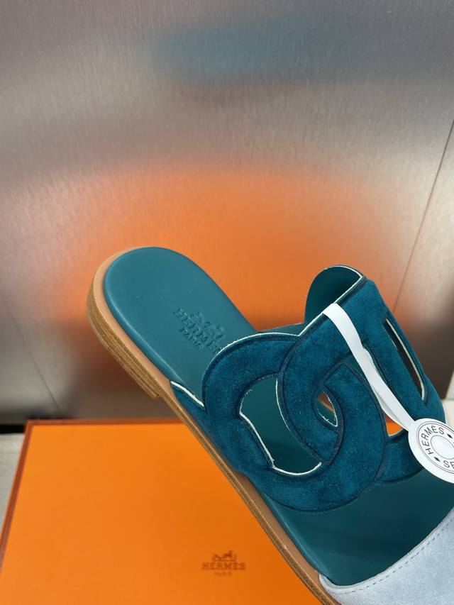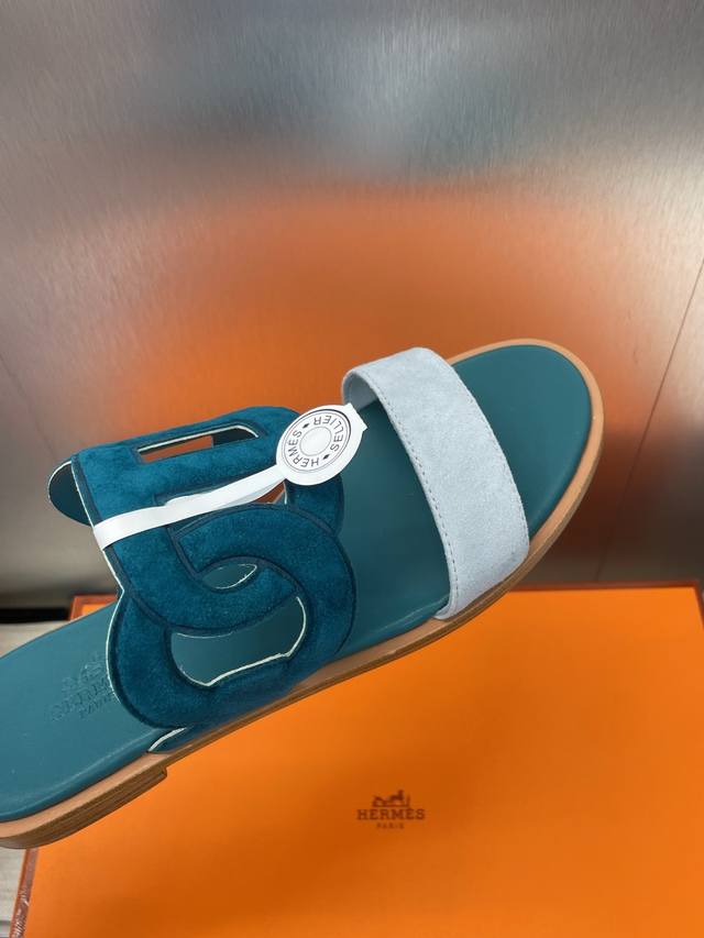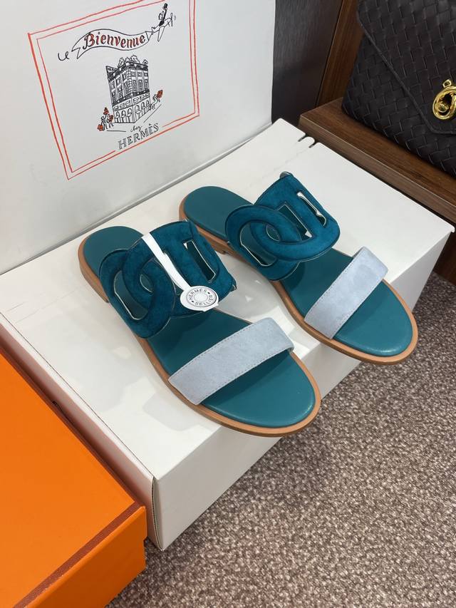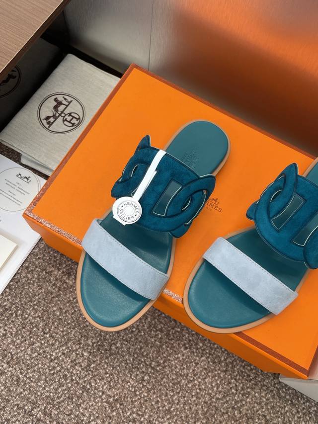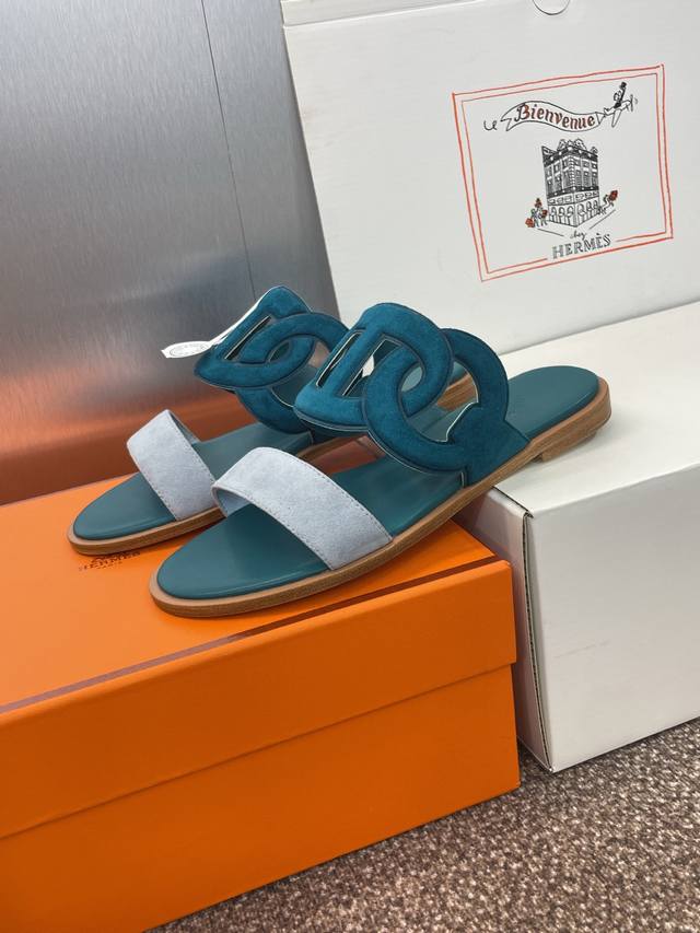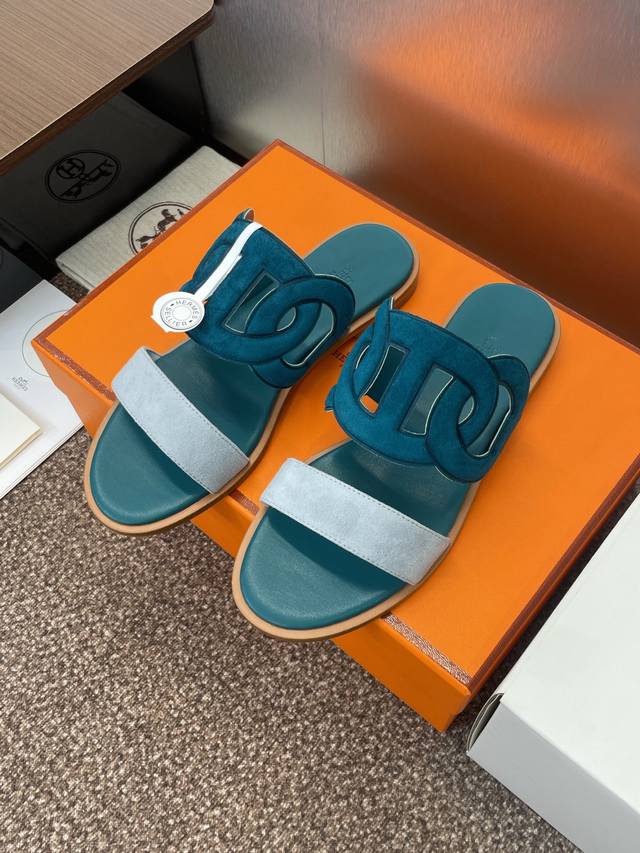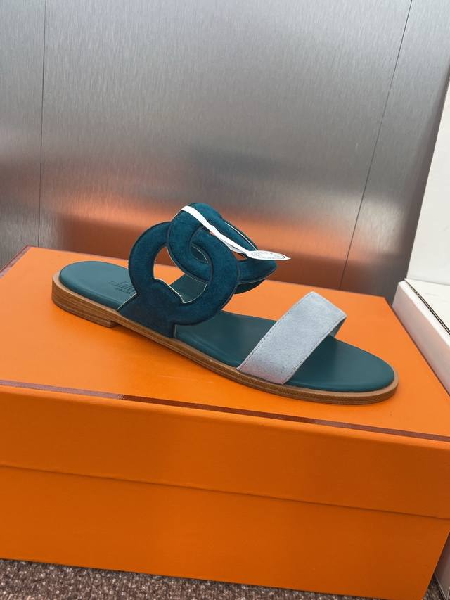 Dongguan goods purchasing Hermes 2025 Spring/Summer new Lagune series Chaine d'Ancre pig nose chain pattern women's shoes H family flat heel color matching round toe open toe beach sandals