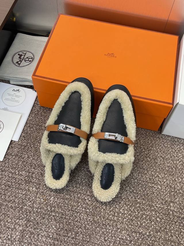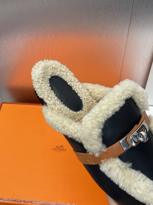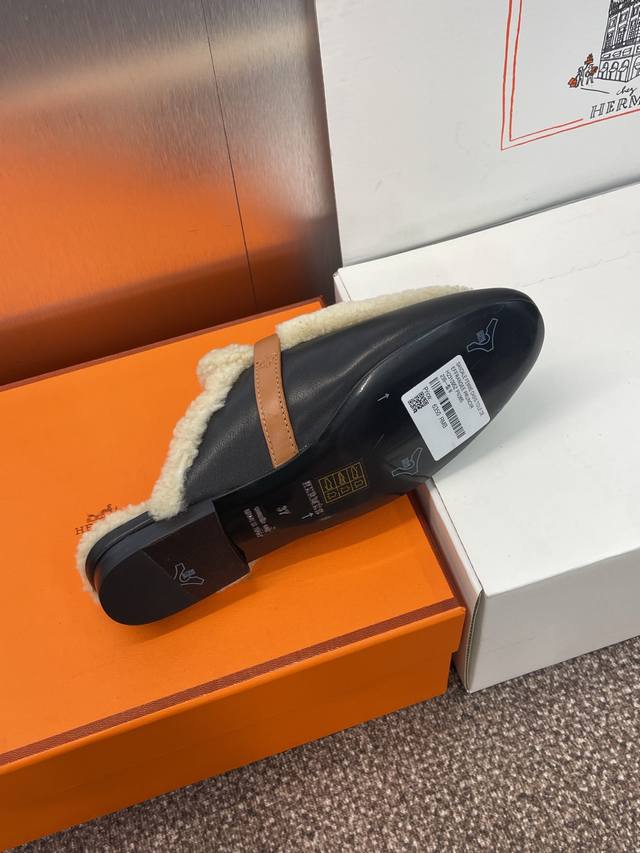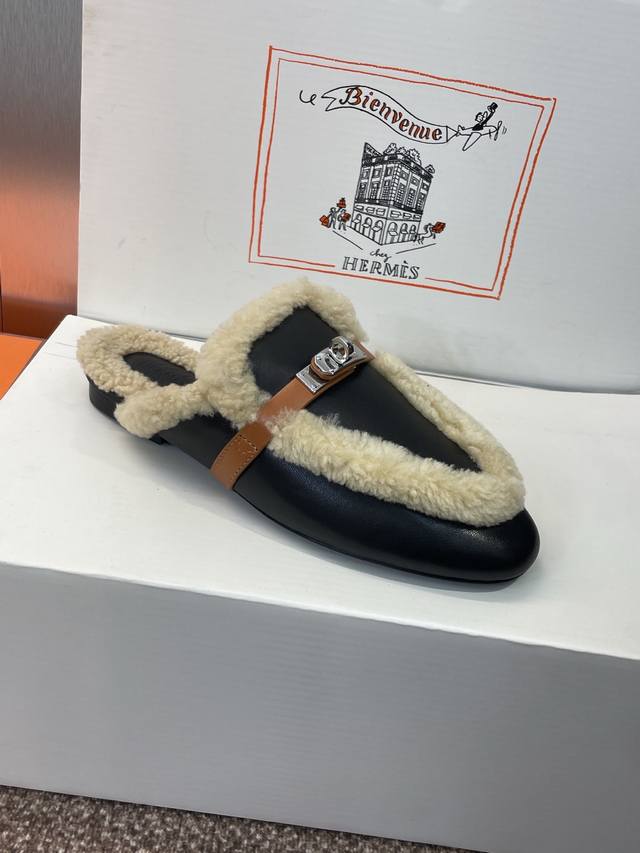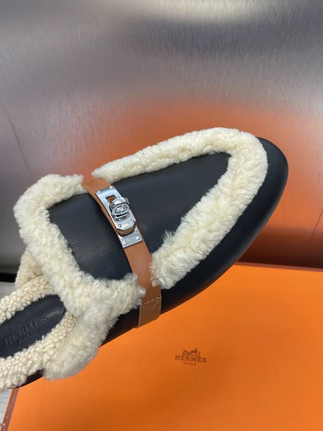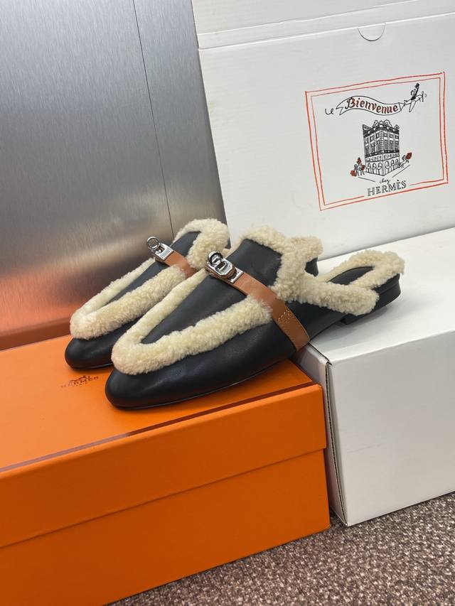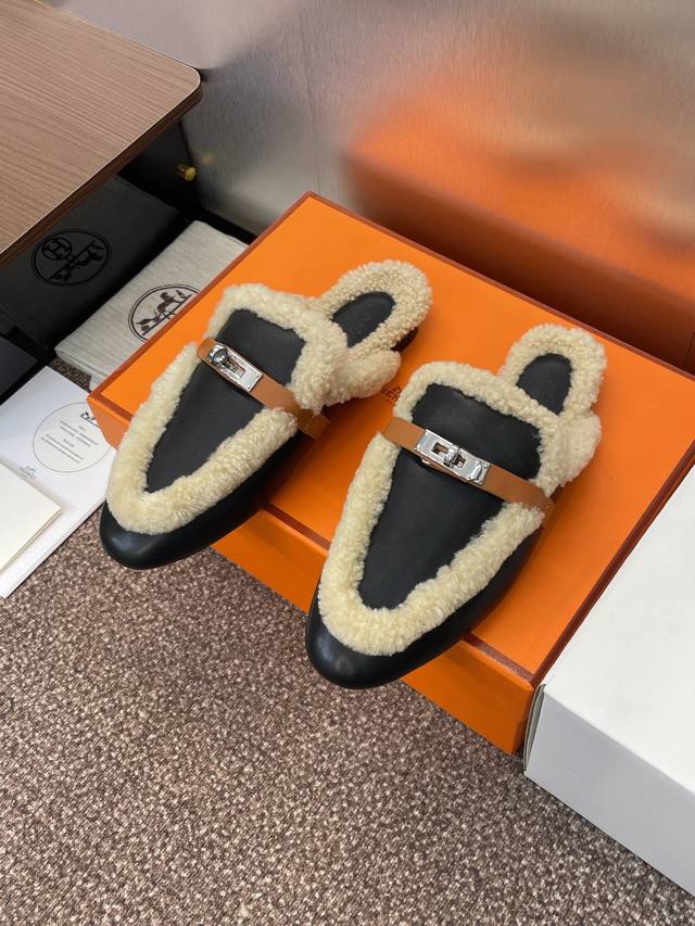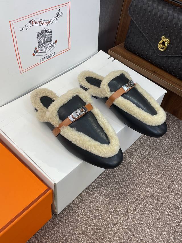 Dongguan goods purchasing Hermes autumn and winter classic Kelly buckle Oz color matching leather and fur women's shoes H family flat round toe mule slippers
