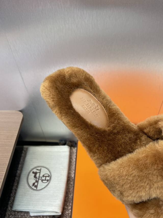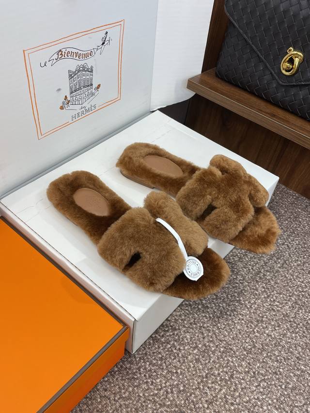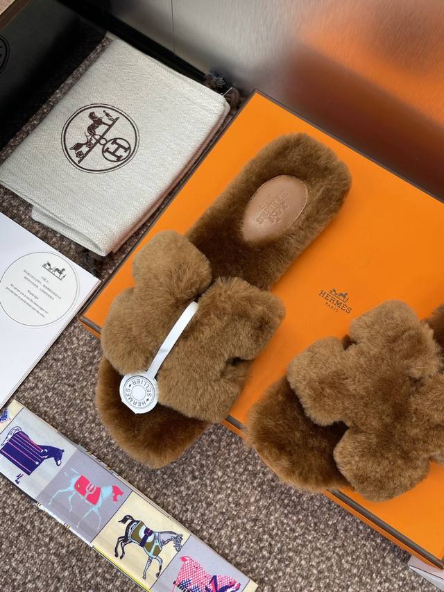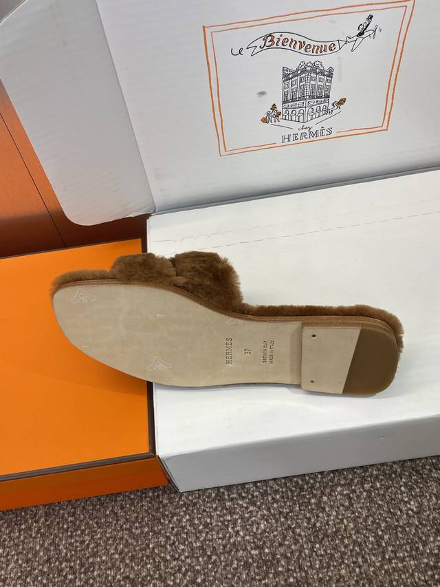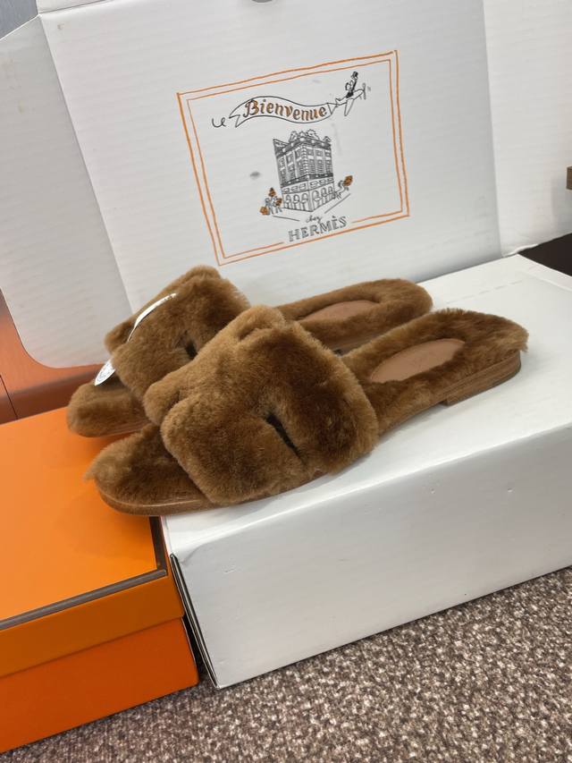 Dongguan goods purchasing Hermes Autumn and Winter Classic Oran Candy Color Flip Flops Women's Shoes H Home Classic Flat Round Toe Open Toe Lambswool Slippers