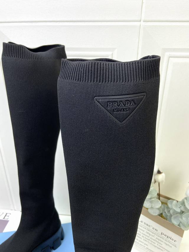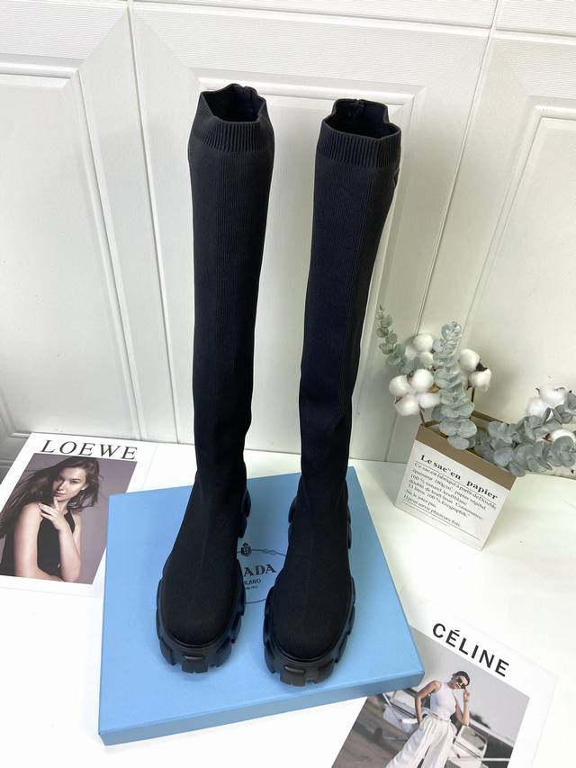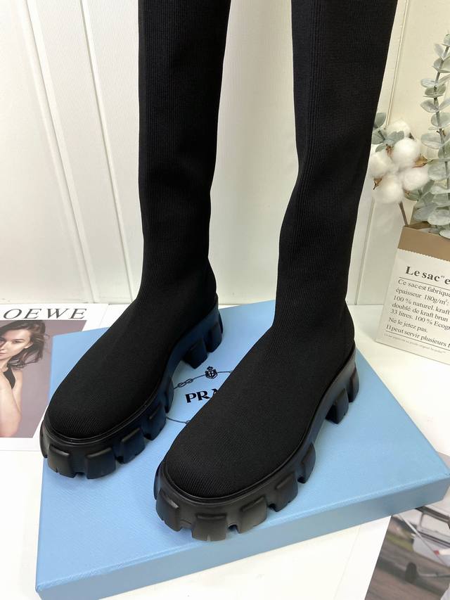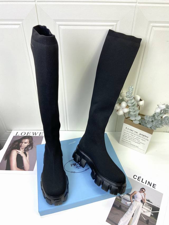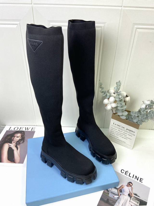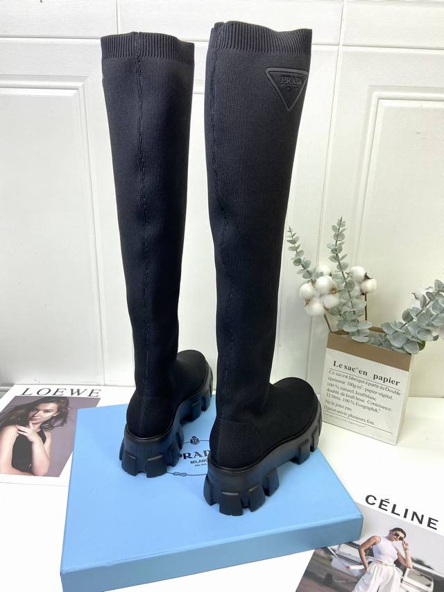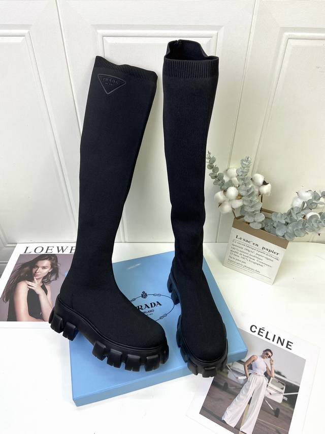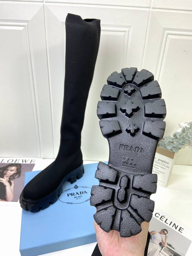 Prada sock boots, originally purchased and developed. The large-toed sole has a retro feel, creating a strong visual impact when paired together! It also represents the latest popular iconic color scheme. The custom paper label logo on the side of the shoe is of course the most eye-catching.