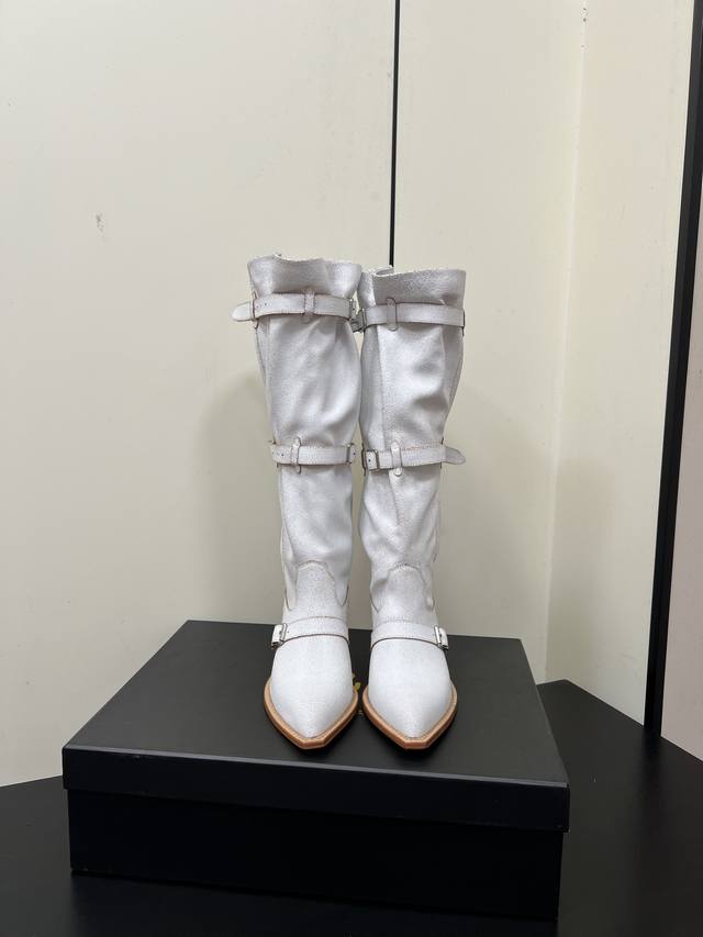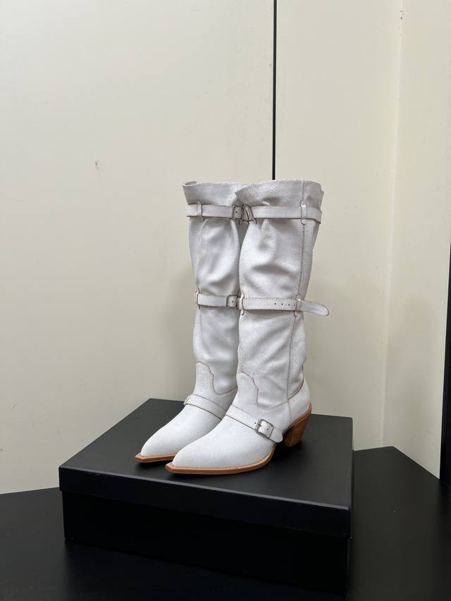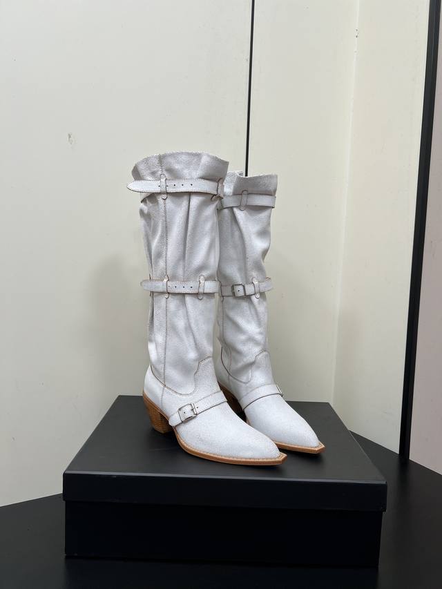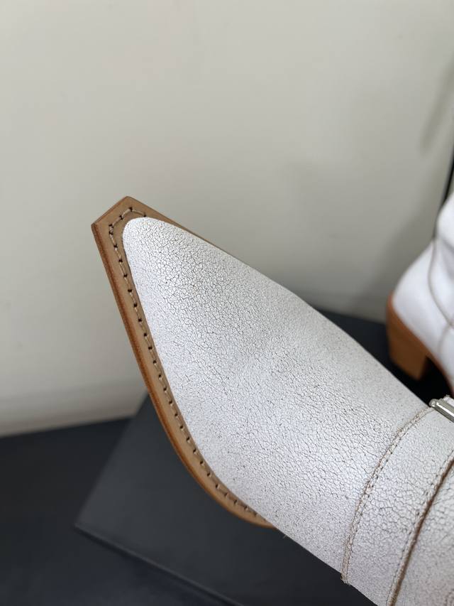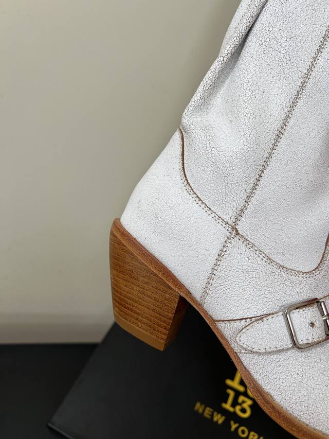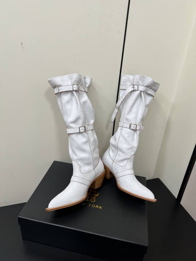 R13's new fall/winter mid-heeled knee-high boots. Design details: Western-inspired belt buckle design, slouchy wide-leg boots, adjustable belt buckle for a slimmer look, pointed toe, pull-on style, knee-high, chunky low heel. These new high-top western boots with pleated trousers might just be the coolest western boots of the year! I've always thought R13 jeans were a standout! I didn't expect them to go this far this year. A must-have trouser-length western boot for every fashionista! Get ready, ladies! They're absolutely stunning! The white exterior is made from specially treated cowhide, giving it a unique feel that I love the more I look at it! It's a truly striking design! It is very convenient to wear with one foot~