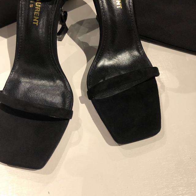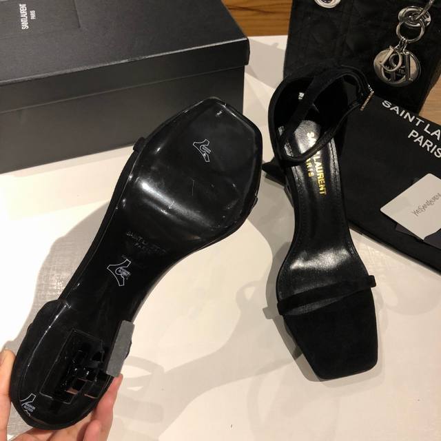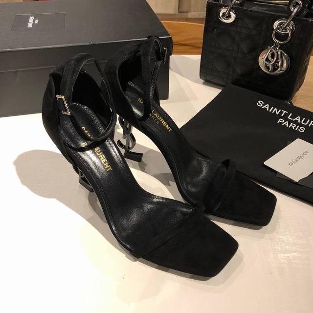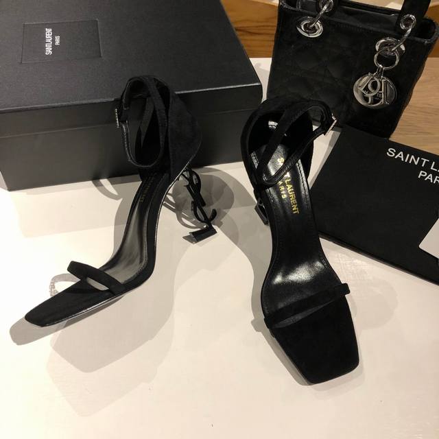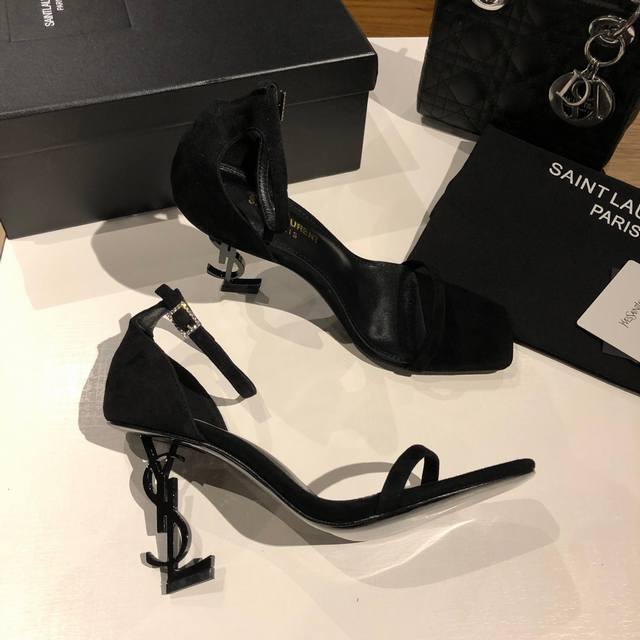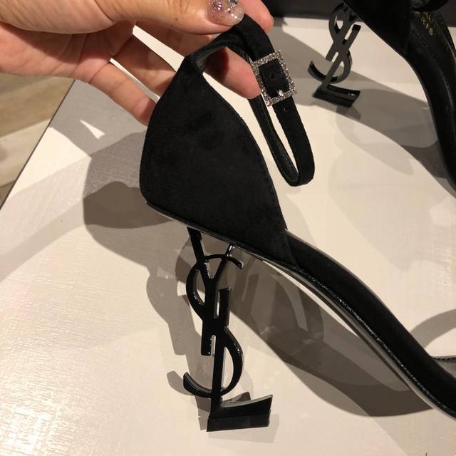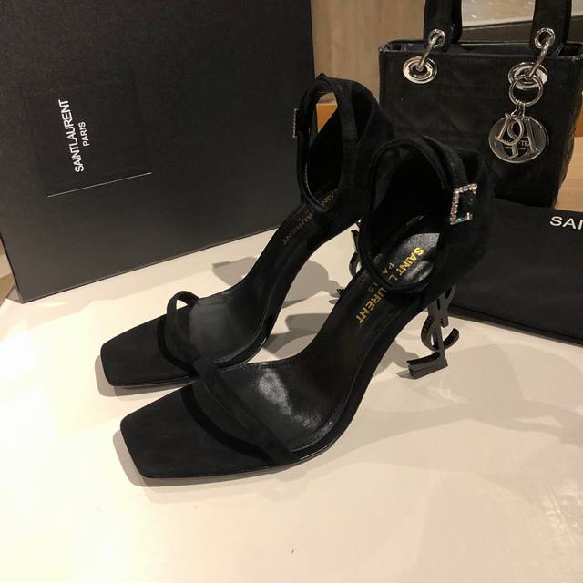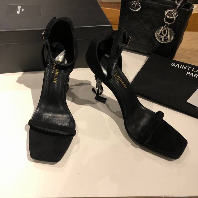 Saint Laurent YSL high-heeled sandals with metal buckle and lacquered YSL monogram heels. The distinctive monogram heel design creates a unique and striking look.