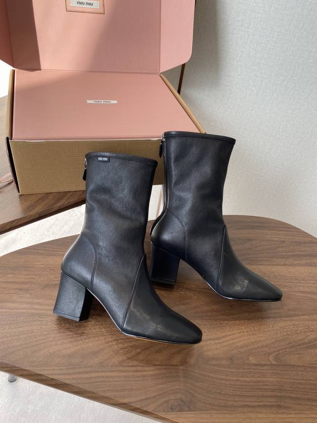 are crafted from sheepskin leather with a square toe design, evoking classic loafers. The striking yellow "Miu Miu" logo on the upper adds to the brand's distinctive identity. The slim, long-leg style features a side zipper for easy on and off, and the stretchy leather shaft contours to the leg. Pair these