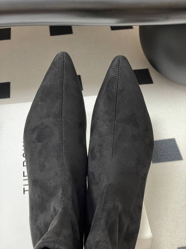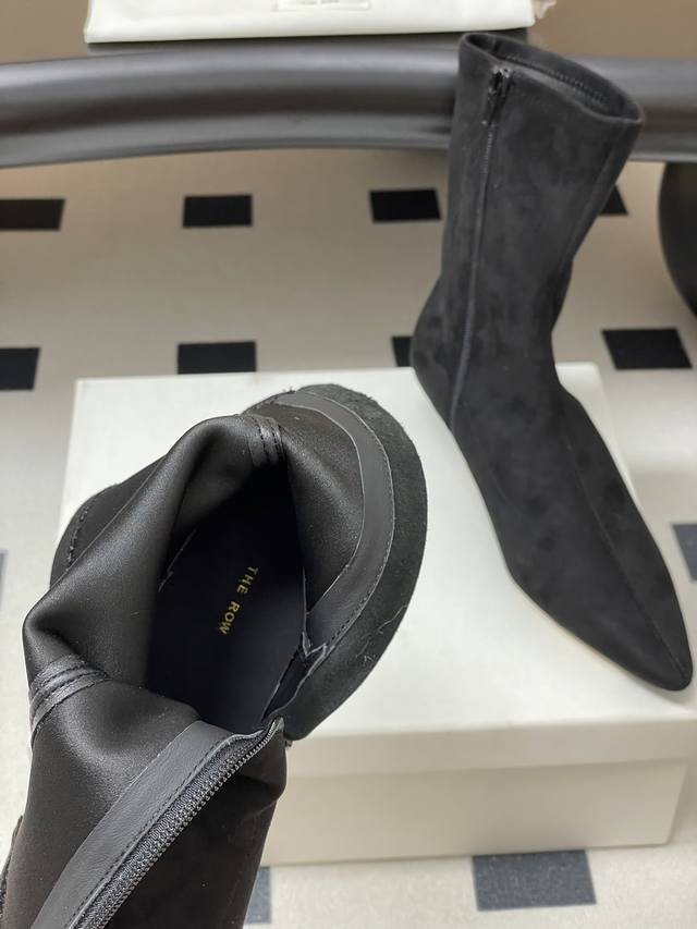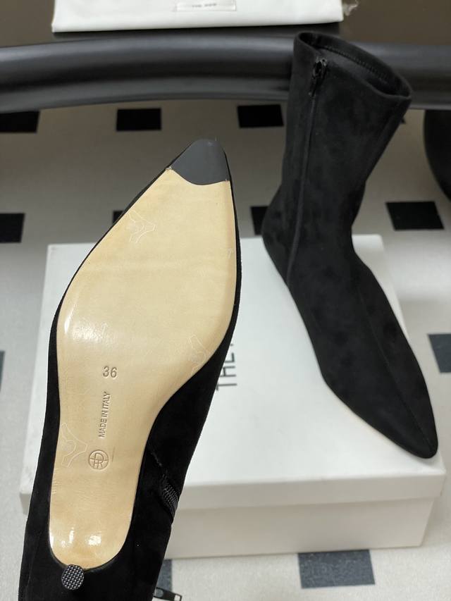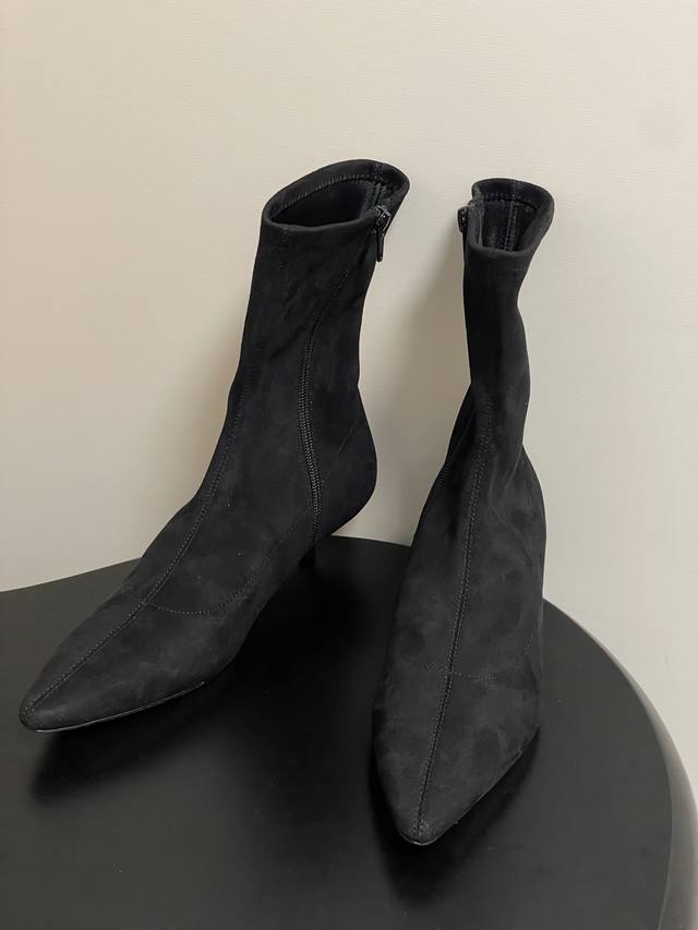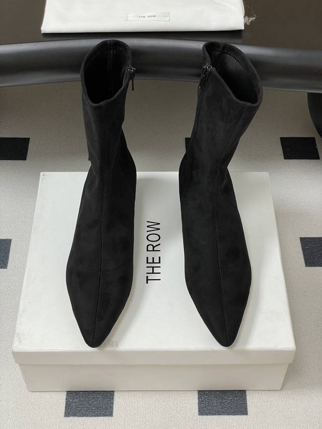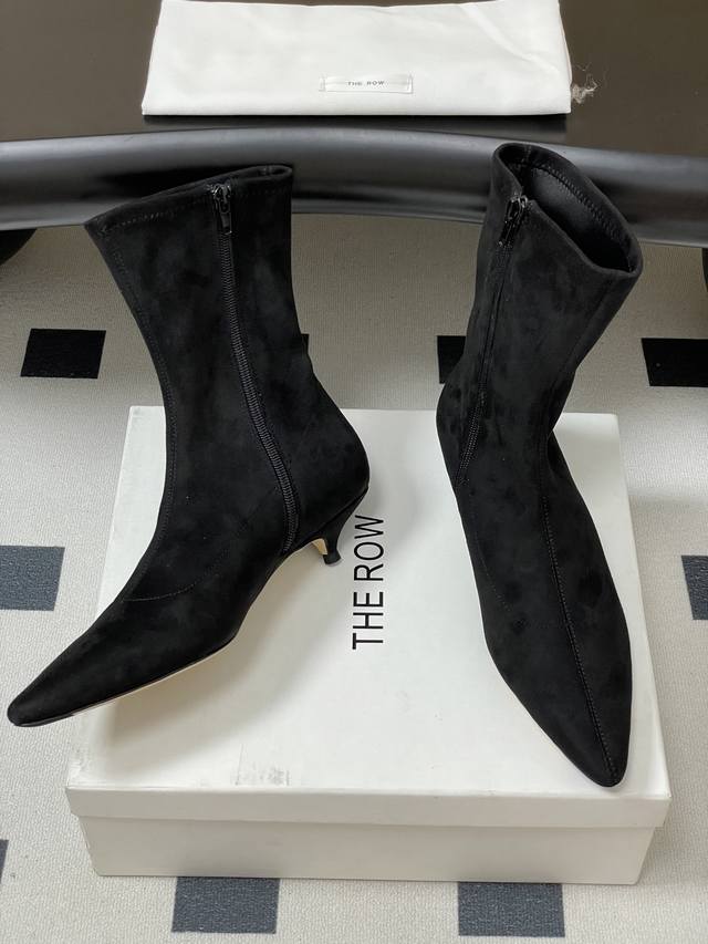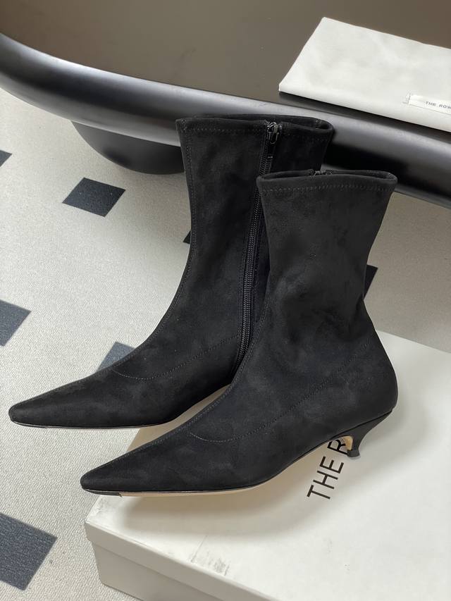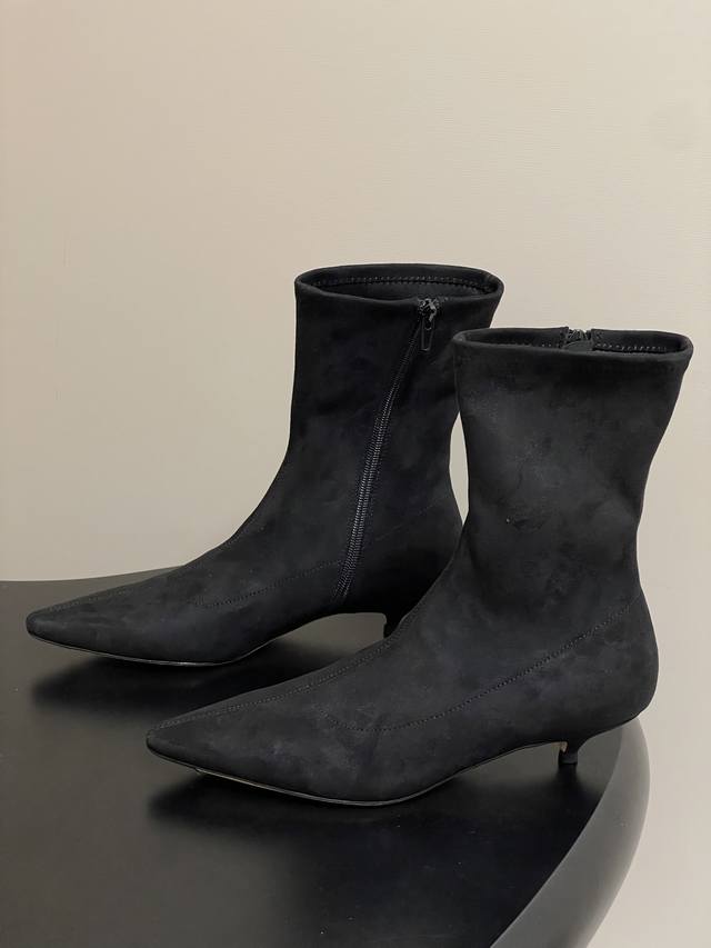 The Row's new Tr stretch ankle boots and kitten heel boots for Early Fall 2025. These boots offer an elegant yet distinctive style, combining the sophistication of a dress boot with a touch of modern edge. They're perfect for a variety of outfits, from simple daytime wear to statement evening looks. Made of stretch suede, this material not only contours to the leg, shaping it for a more elongated and streamlined look, but also boasts a premium matte finish that enhances the boot's luxurious, vintage feel. The boot's shaft is mid-high, reaching down to the calf for a flattering and contoured look. Upper: Custom stretch suede Lining: Stretch Lycra Sole: Italian leather outsole Heel height: 3cm - 8.5cm Sizes: 35-39, 40, 41 Made to order, non-refundable.