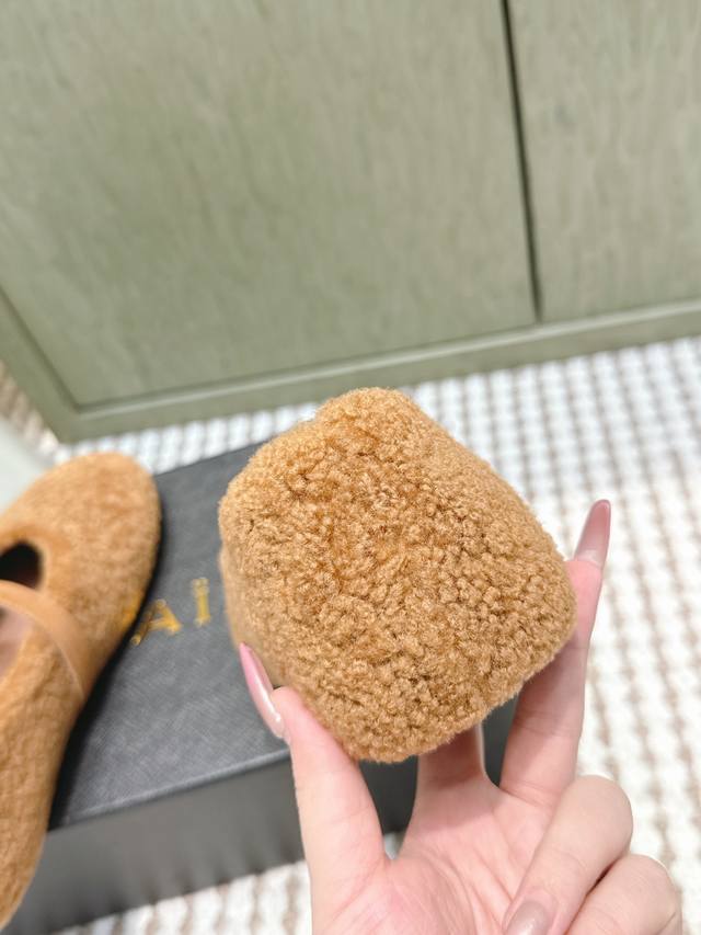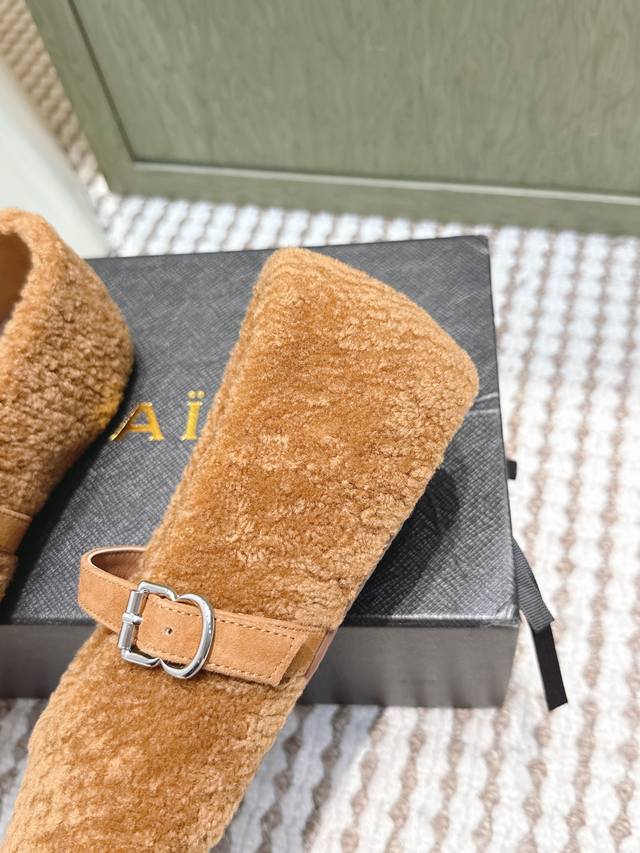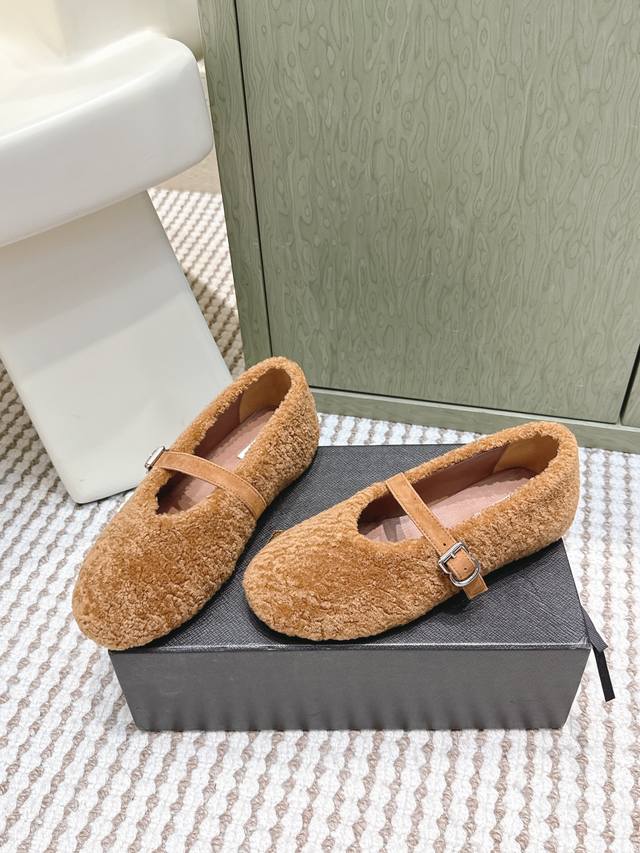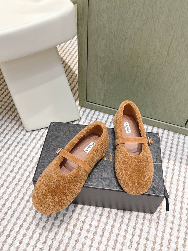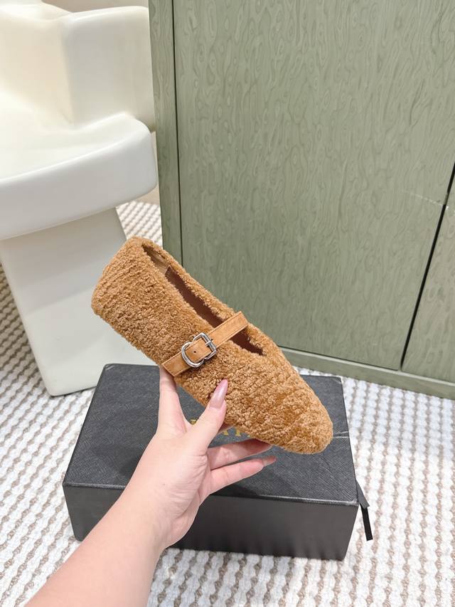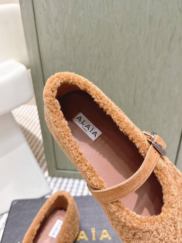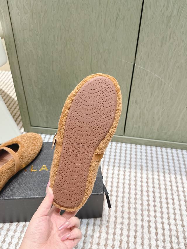 Alaia Autumn/Winter New Wool Mary Jane Ballet Shoes. Made with suede upper and lamb's wool lining for excellent warmth; features a single-strap design with metal buckle for added texture, combining retro and sophisticated style. The round toe is forgiving, and the flat sole ensures comfort. The plush edges at the opening are soft and cute, with a style that blends casual and retro. Upper: Suede upper; Lining: Wool; Outsole: Original rubber non-slip outsole; Size: 35-42 (40, 41, 42 - Custom sizes are non-refundable).
