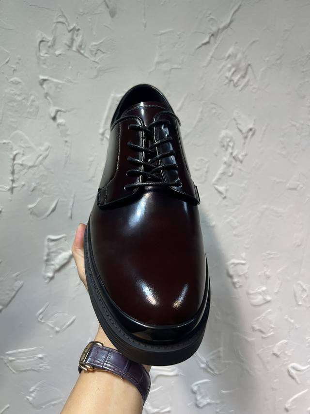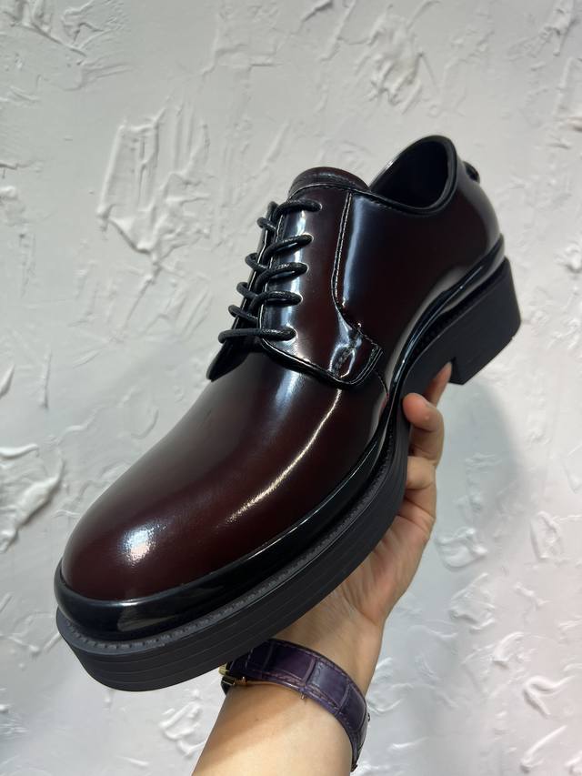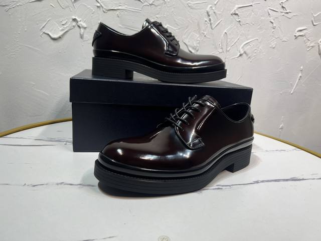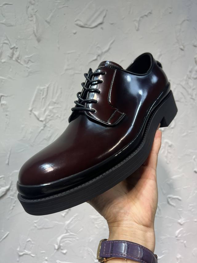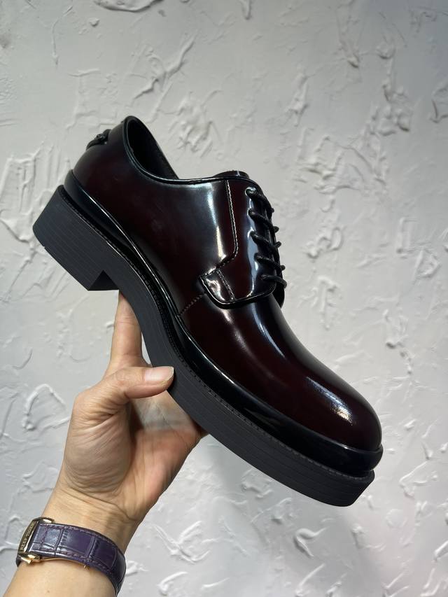 Prada Derby 2025 Spring New Arrival, Prada Distressed Retro Loafers, British Style Thin Strap Business Shoes, Top Version Thick Sole Triangle Logo Derby Shoes, Ken's Style, Rubber Outsole, Imported Edge Beads, Cowhide Lining, Cowhide Insole, Black, Red, and Blue Complete Set, Sizes 39-46