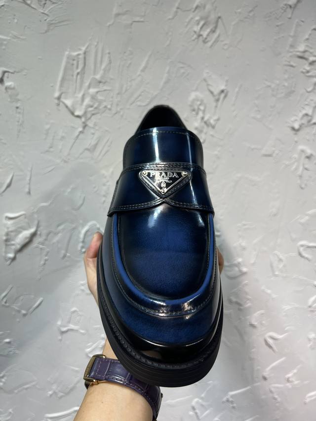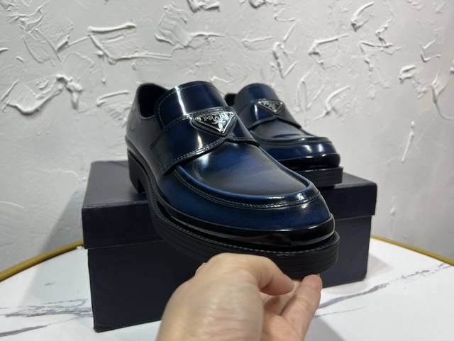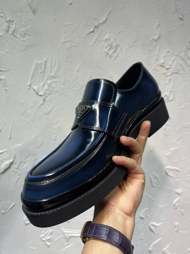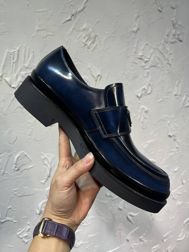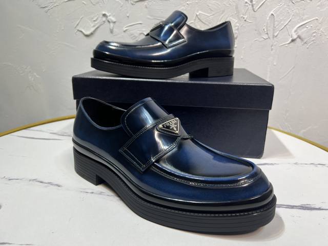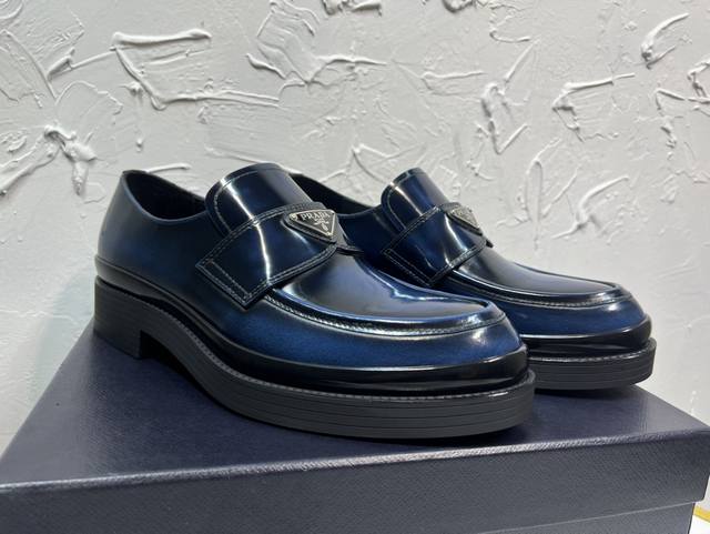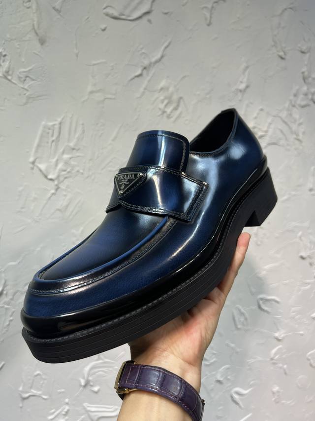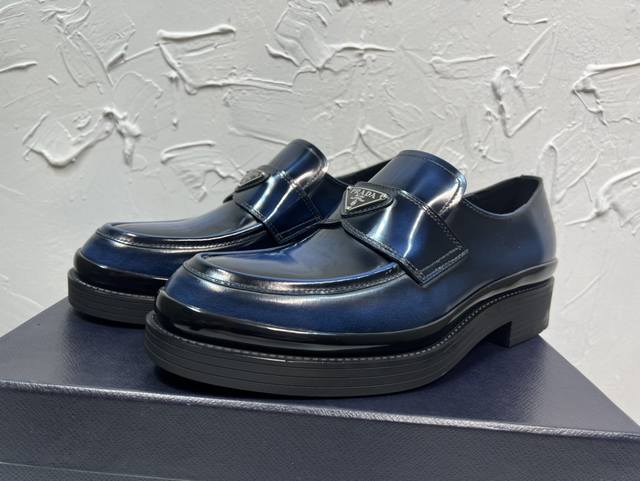 Prada Derby 2025 Spring New Arrival, Prada Distressed Retro Loafers, British Style Business Shoes, Top-Quality Thick-Soled Triangle Logo Derby Shoes, Ken's Style, Rubber Outsole, Imported Edge Beads, Cowhide Lining, Cowhide Insole, Black, Red, and Blue Complete Set, Sizes 39-46