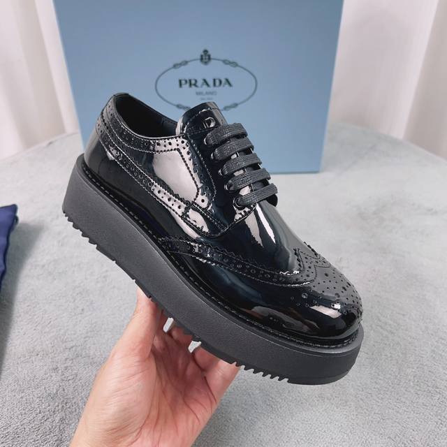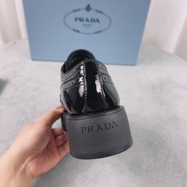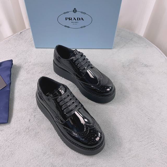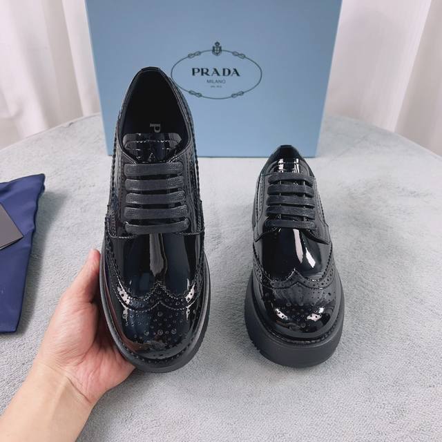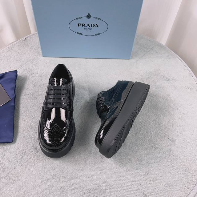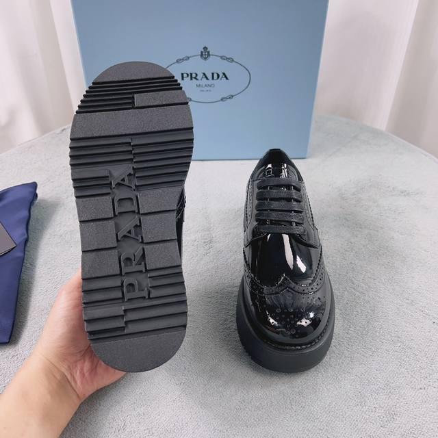 Prada New Loafers Upper: Imported split patent leather Lining: Mixed sheepskin Sole: Platform sole Heel height: 4cm Size: 35-41