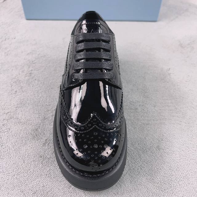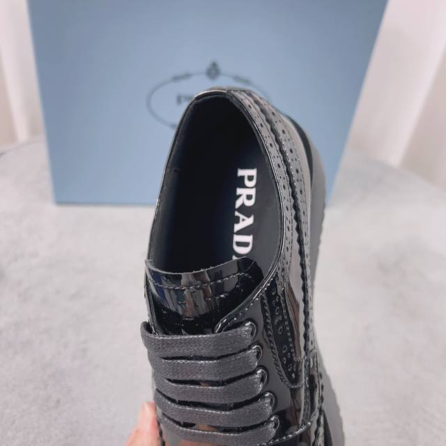 Top-tier version, Prada patent leather lace-up platform loafers. Upper: Enameled