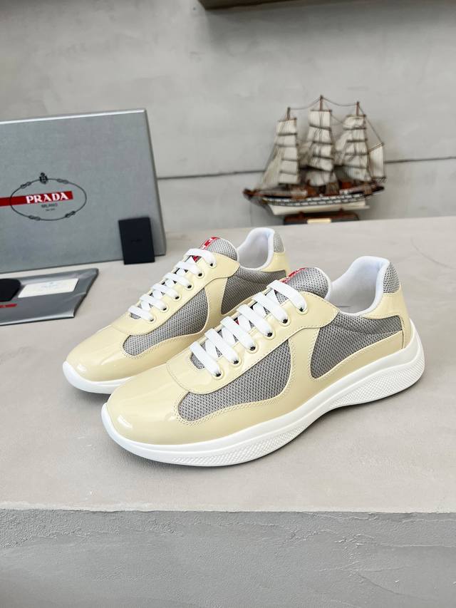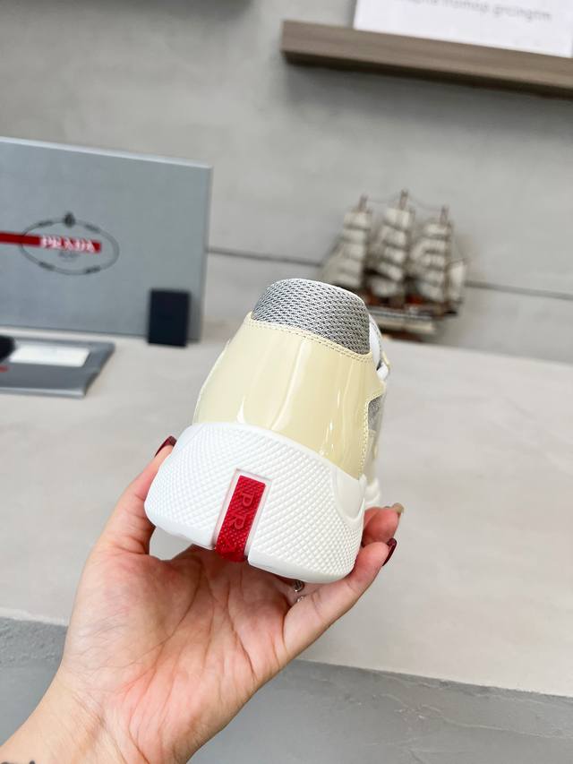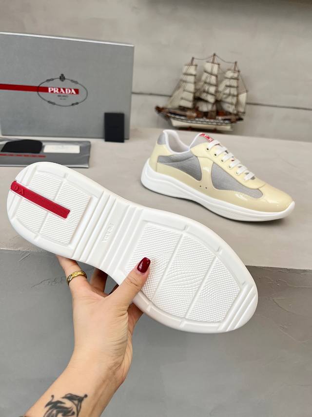Prada top-of-the-line sneakers. Features include an imported flyknit upper with patent leather trim, sheepskin lining, cowhide tread, durable, non-slip, and lightweight outsole. Unisex style. Sizes: 35-47. Custom sizes 45, 46, and 47 are available.