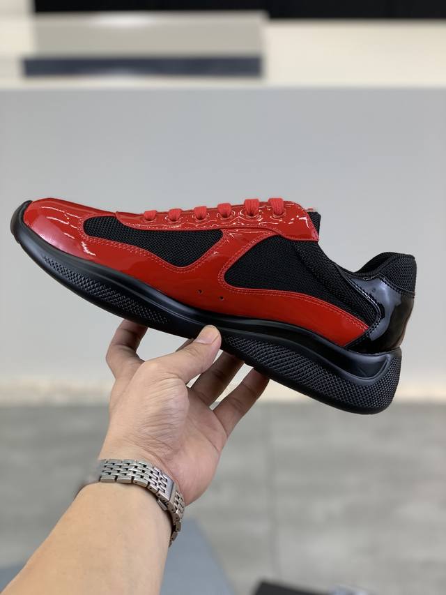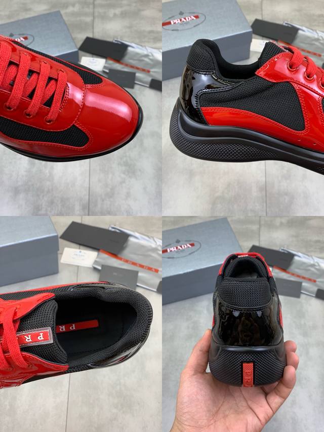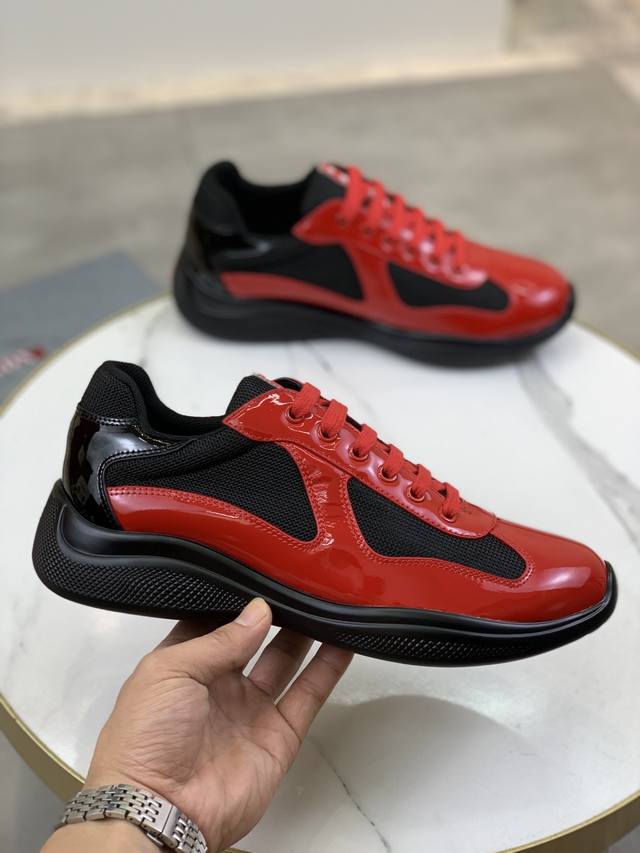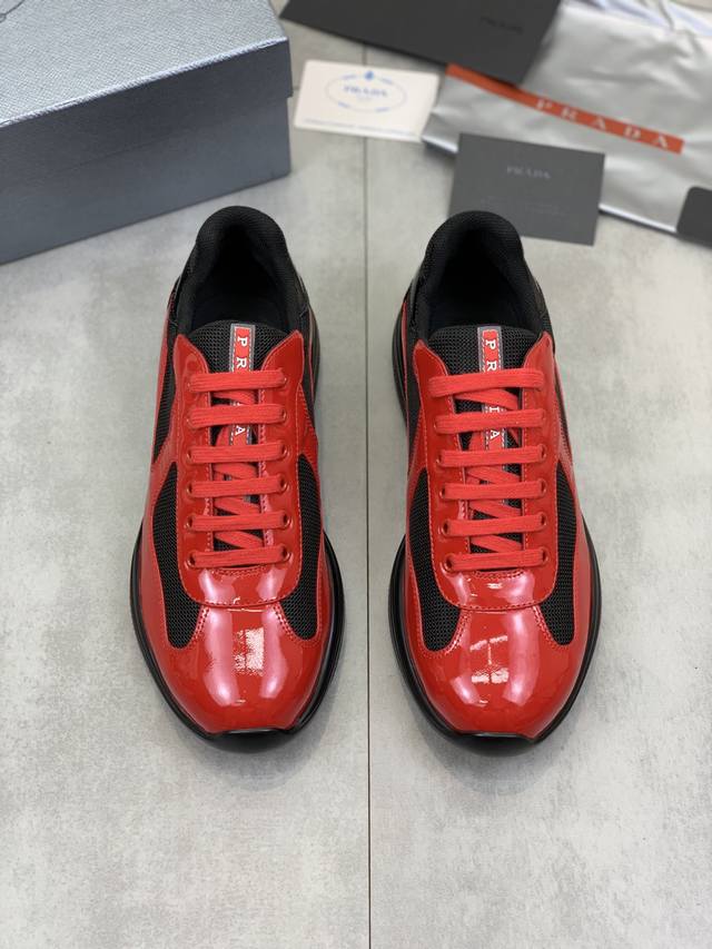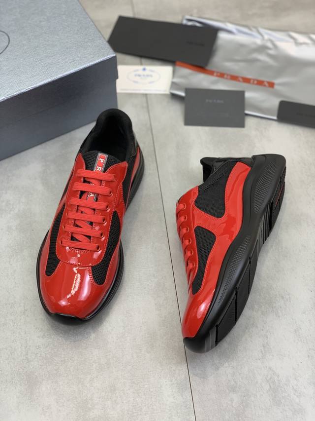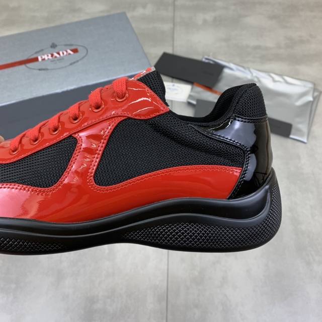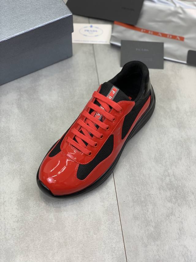 Prada top-of-the-line sneakers. Features include an imported flyknit upper with patent leather trim, sheepskin lining, cowhide tread, durable, non-slip, and lightweight outsole. Unisex style. Sizes: 35-47. Custom sizes 45, 46, and 47 are available.