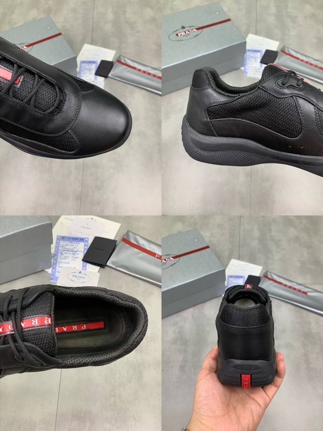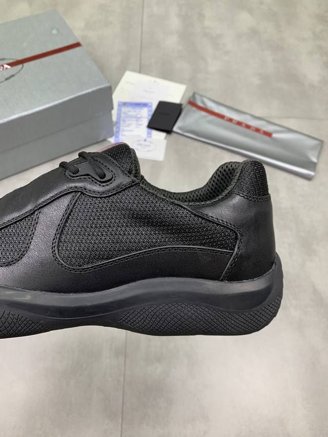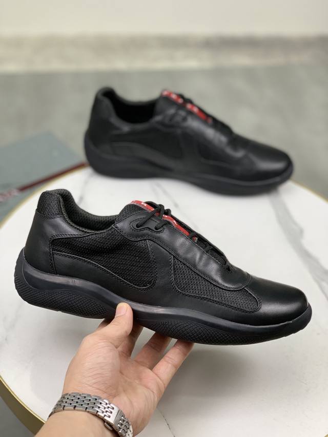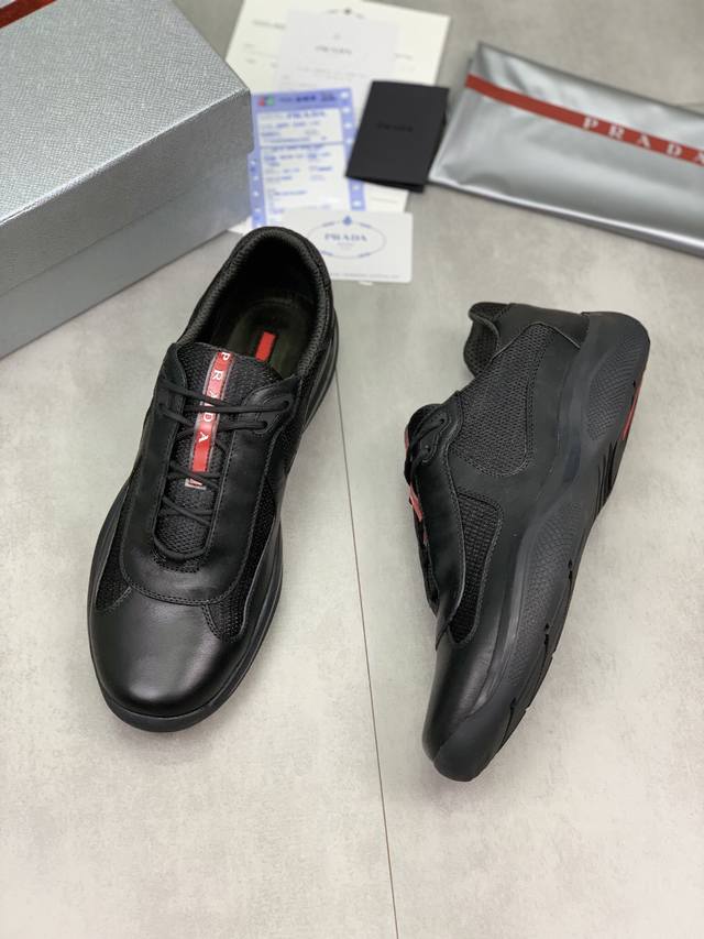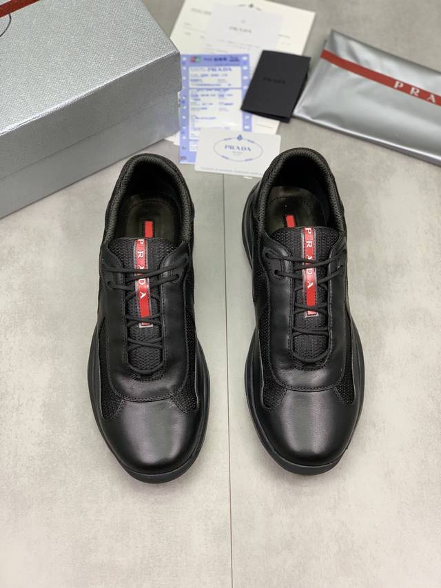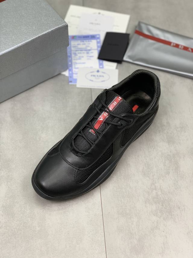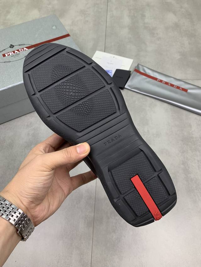 Prada top-of-the-line sneakers. Features include an imported flyknit upper with patent leather trim, sheepskin lining with cowhide gusset, durable, non-slip, and lightweight outsole. Unisex style. Sizes: 35-47, 46.47 custom-made.