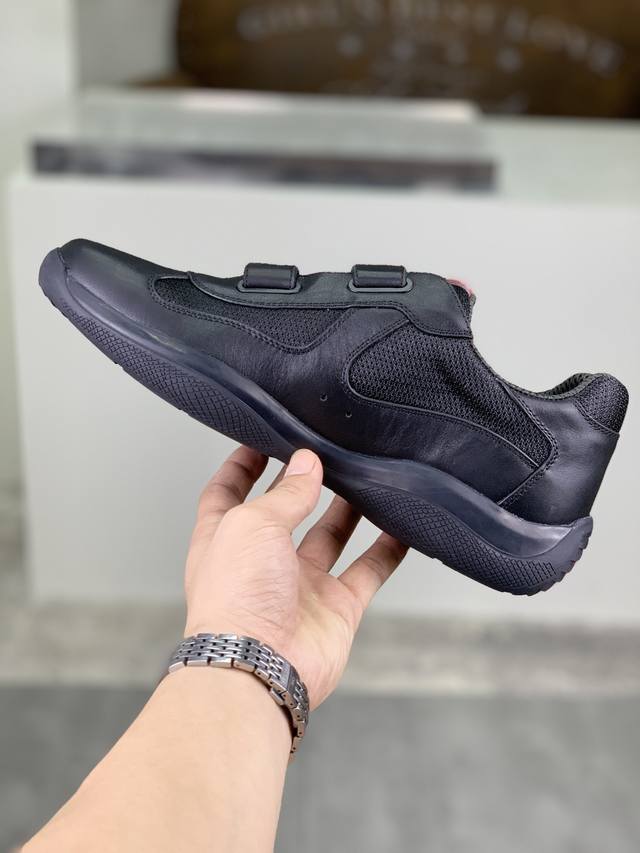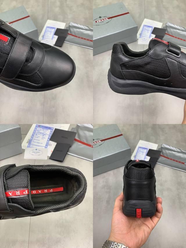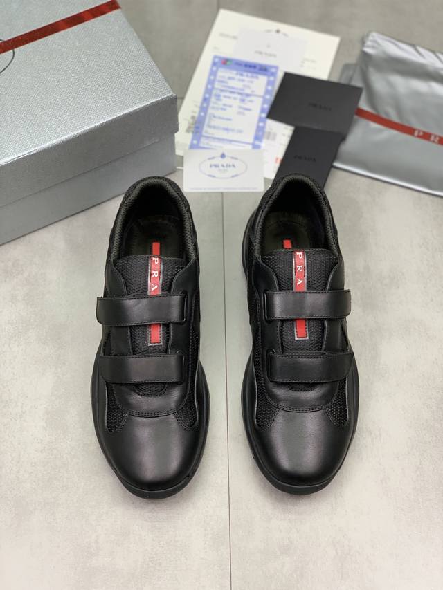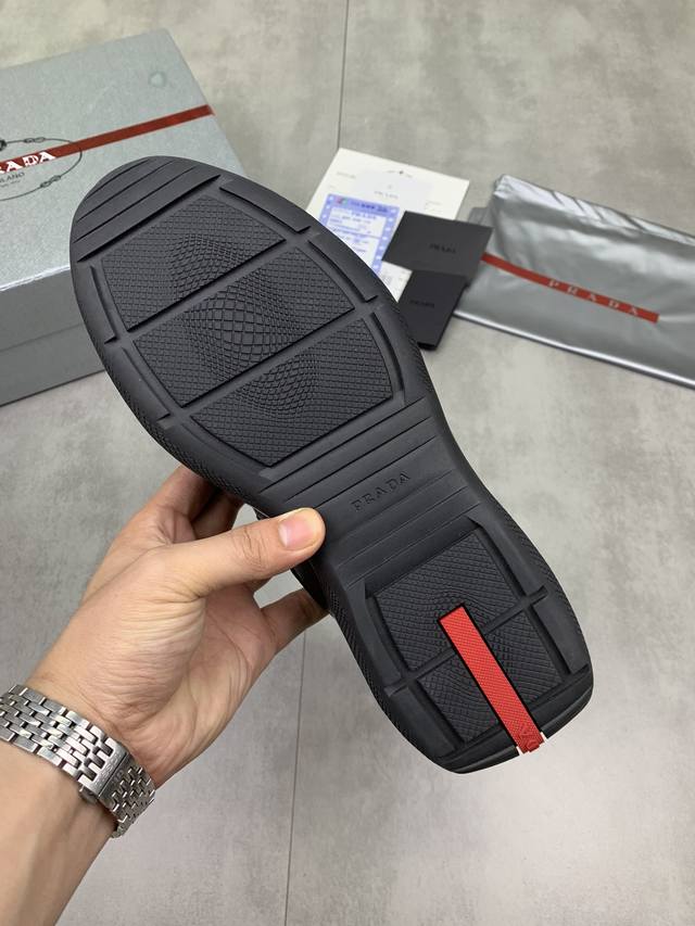 Prada top-of-the-line sneakers. Features include an imported flyknit upper with patent leather trim, sheepskin lining, cowhide tread, durable, non-slip, and lightweight outsole. Unisex style. Sizes: 35-47, 46.47 custom-made.