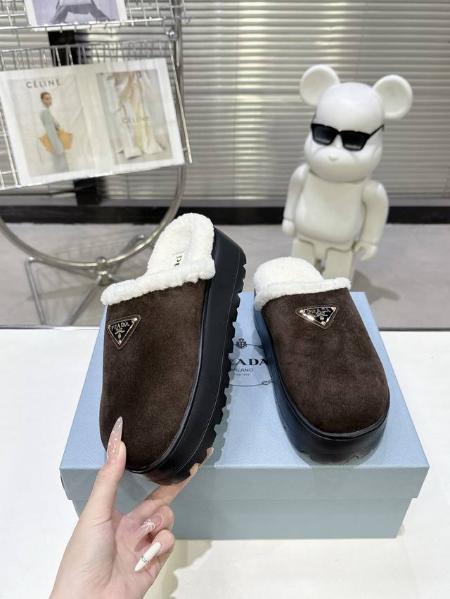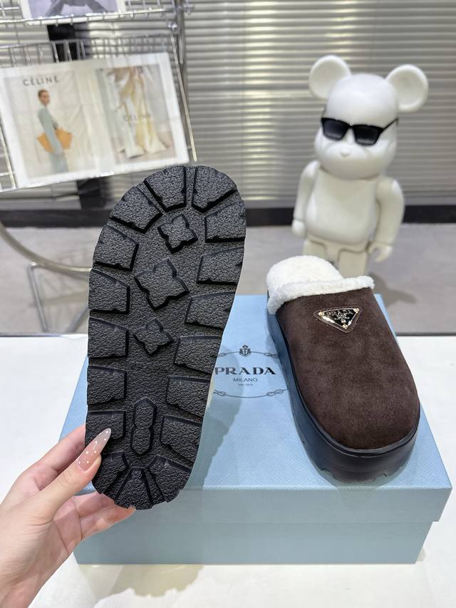 Prada's popular Fall/Winter closed-toe sheepskin slippers. A runway item, suitable for indoor use in winter and outdoor use in early spring. These sheepskin slippers feature an ultra-lightweight rubber Ip foam sole, soft sheepskin quilted pattern echoing the iconic Prada triangle, and an enamel triangular metal logo for added style. Made with imported high-gloss cow suede, imported knitted wool, genuine wool insole, enamel triangular metal logo, 6cm ultra-lightweight rubber foam sole, and studded sole pattern. Sizes 35-40. Suitable for early spring. Recommended pairings: cotton stretch leggings, wool sweater, lightweight down jacket.