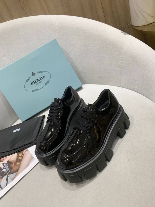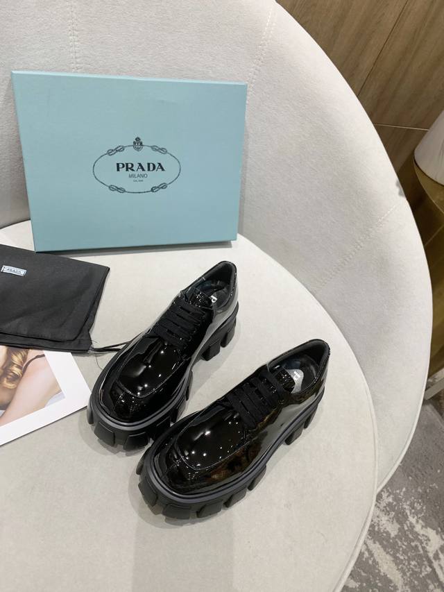 Top-quality Prada Fall/Winter New Black Split-edge Patent Leather Platform Casual Shoes. Adorned by Liu Wen and many other online celebrities, these Prada platform shoes are incredibly popular this year. They offer both height and a casual look, showcasing meticulous attention to detail. Features include: imported split-edge patent leather and soft patent cowhide; silk sheepskin lining; platform sole with logo and non-slip design; exceptionally comfortable and stylish; 6cm heel; sizes: 34-40; comes with boutique packaging! Factory price: [Price not specified]