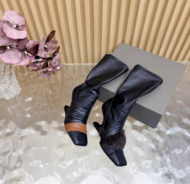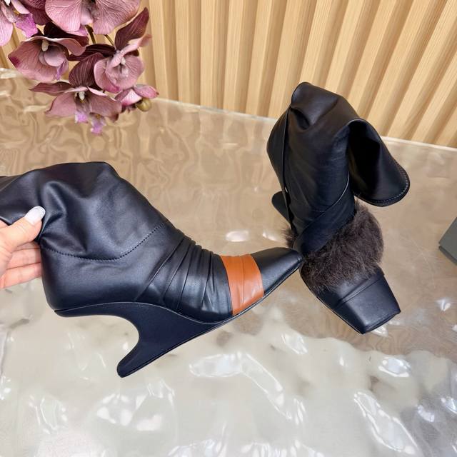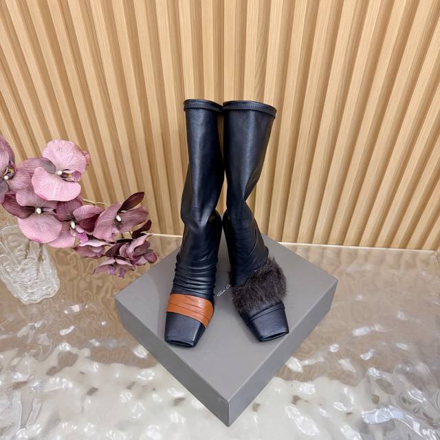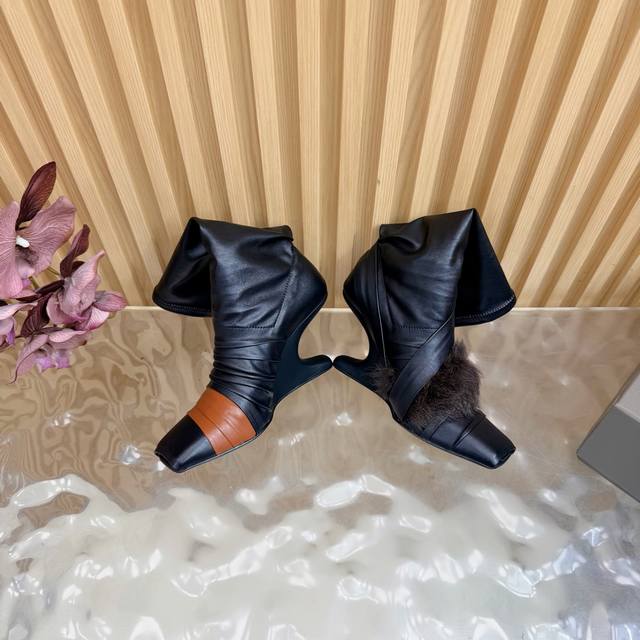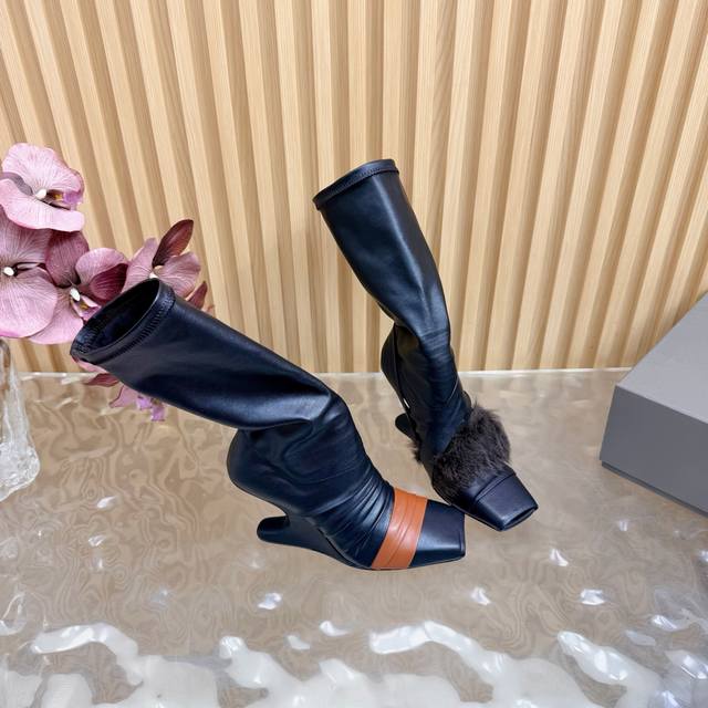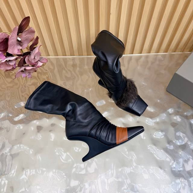 2025 Autumn/Winter New Arrival Rick Owens High-Heeled Elastic Wedge Boots, Available Simultaneously with Fashion Show Ddd Cowhide and Sheepskin Patchwork Brown Sheepskin, Peep Toe Square Toe Design Ddd Fur Trim Ddd Unique Details Ddd Brand New with Box Ddd Sizes 36-41 40.41 Custom Made Ddd