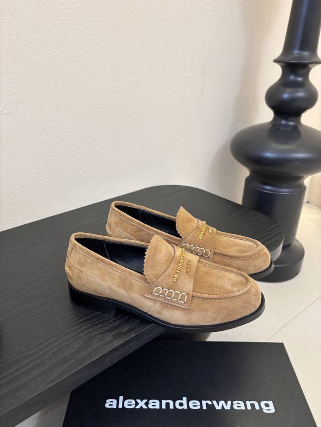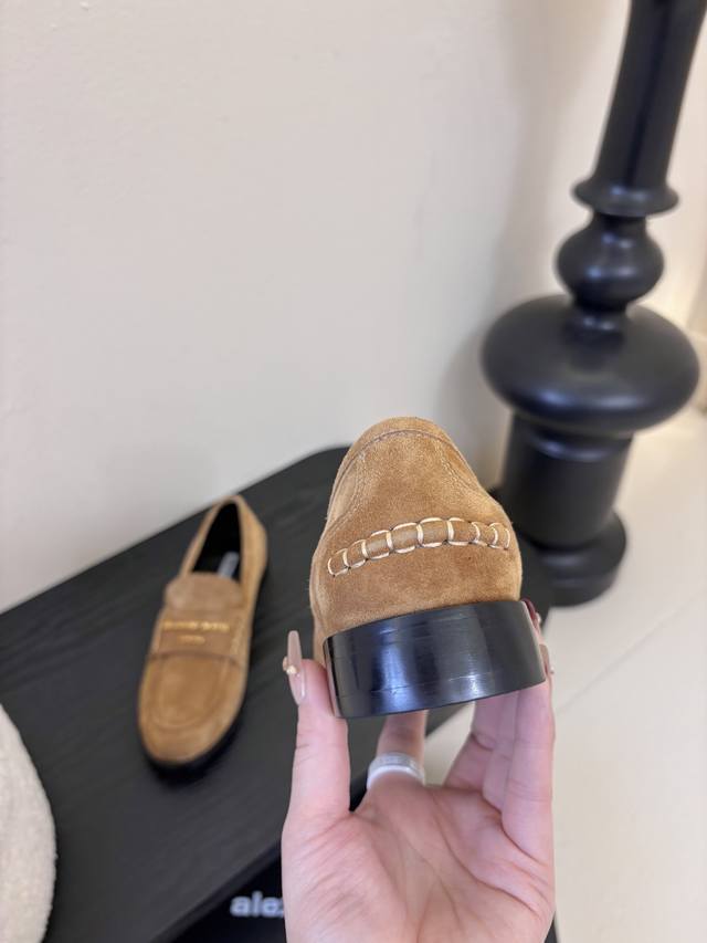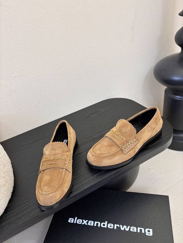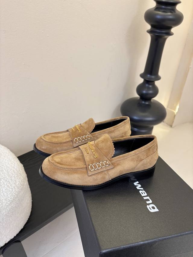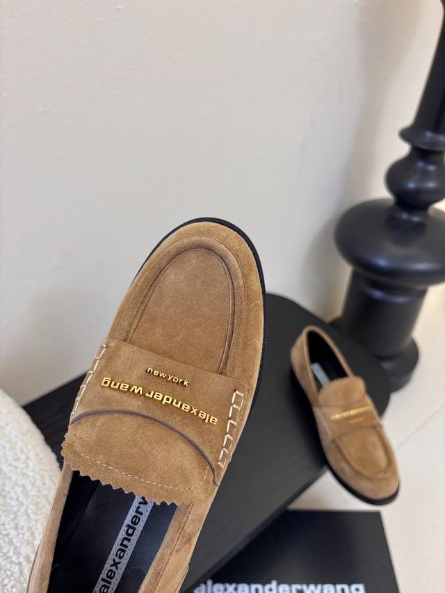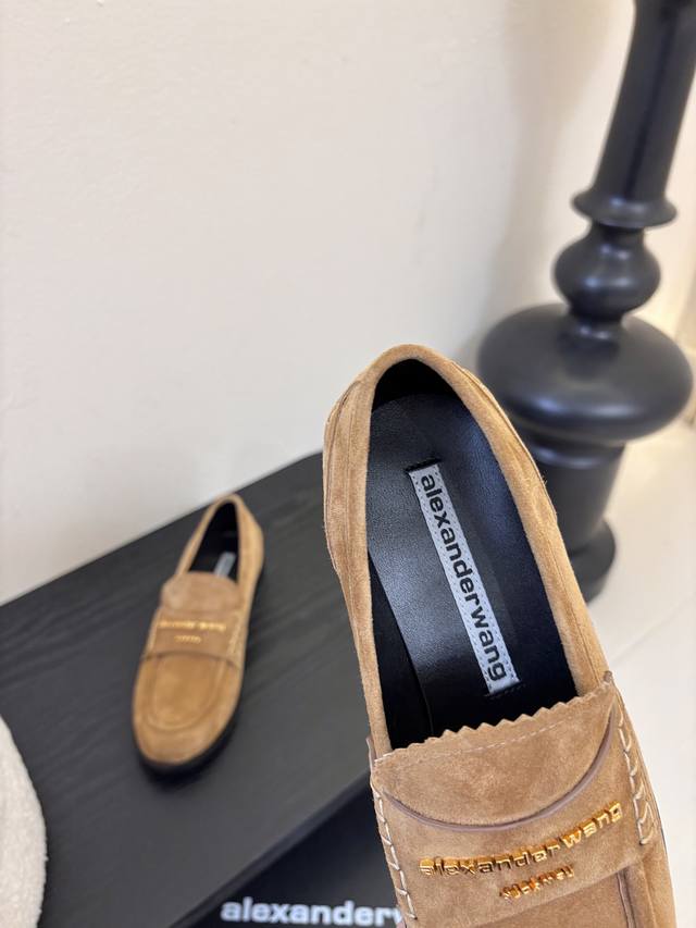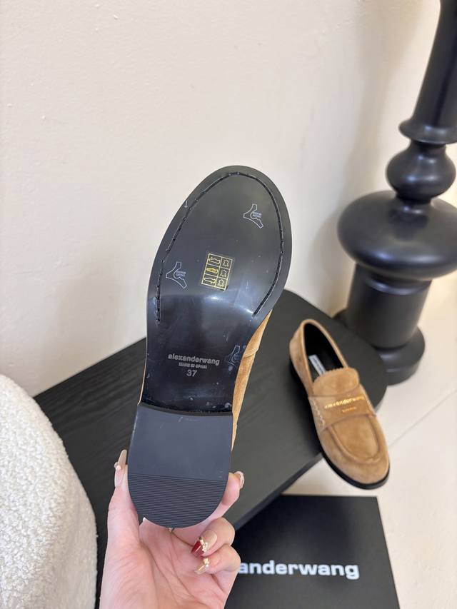 Alexander Wang* 25Ss Autumn/Winter New Round Toe Casual Loafers DDD The shoe features the "Alexander Wang" logo printed on the webbing, a highly recognizable element of the brand. The laceless slip-on design and low-top style are classic loafer silhouettes, combining casual and slightly formal elements. Made of suede, the upper is soft and has a luxurious matte finish. DDD This style embodies "American cool casual," possessing the sophistication of a mid-range luxury brand while retaining Alexander Wang's signature relaxed street style, suitable for various everyday outfits. The low-profile platform sole provides both comfort and a slight height boost, ensuring comfortable wear. DDD Upper: Sheepskin Ddd Lining: Sheepskin Ddd Outsole: Original molded outsole Ddd Height boost: 3cm Ddd Size: 35-40, size 40 is custom-made and non-refundable DDD
