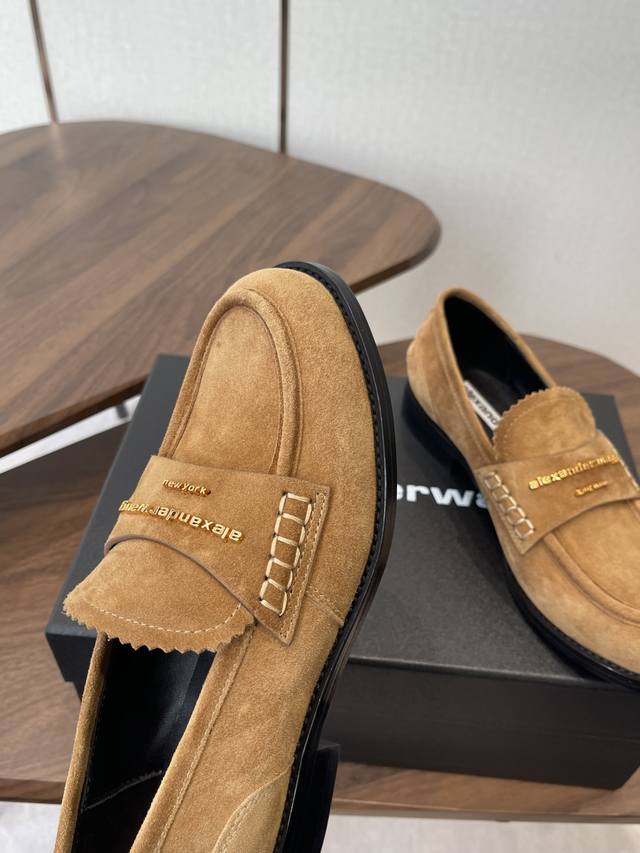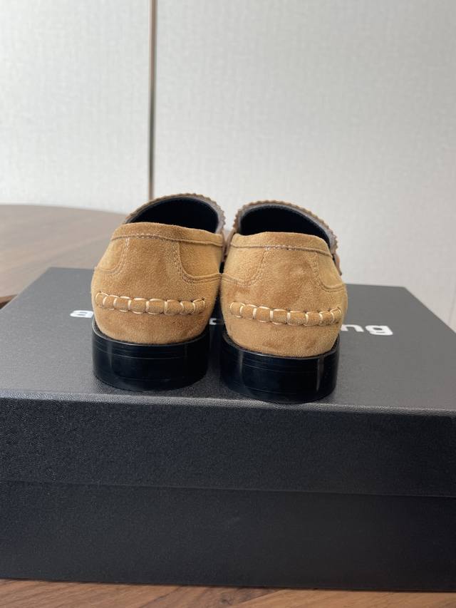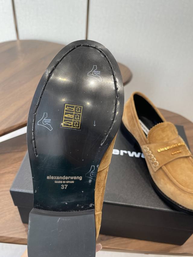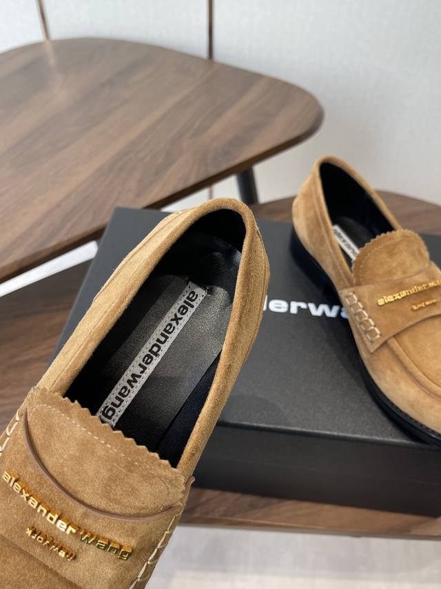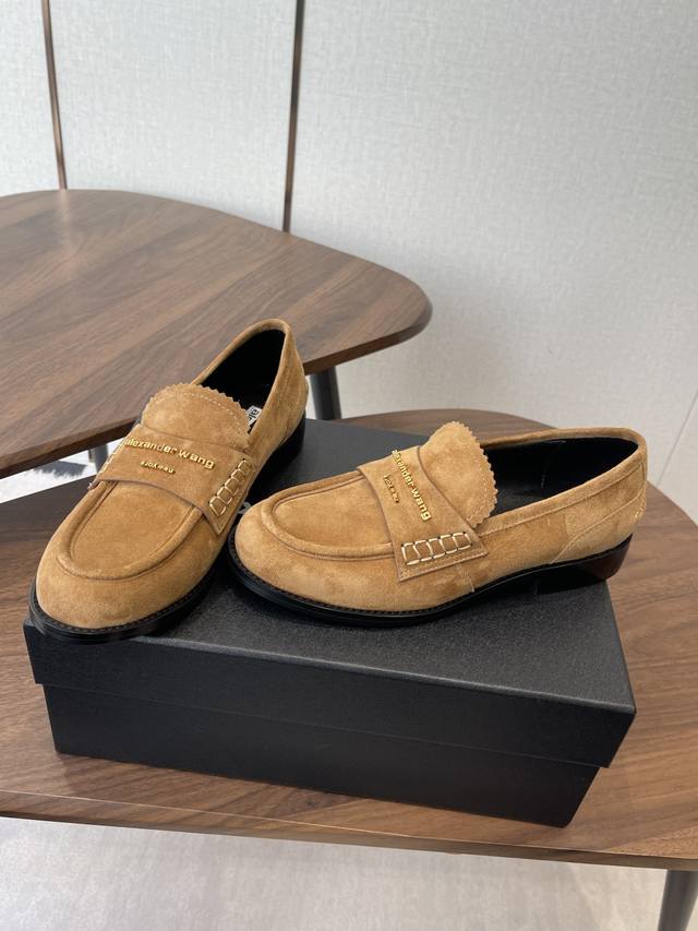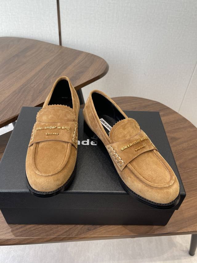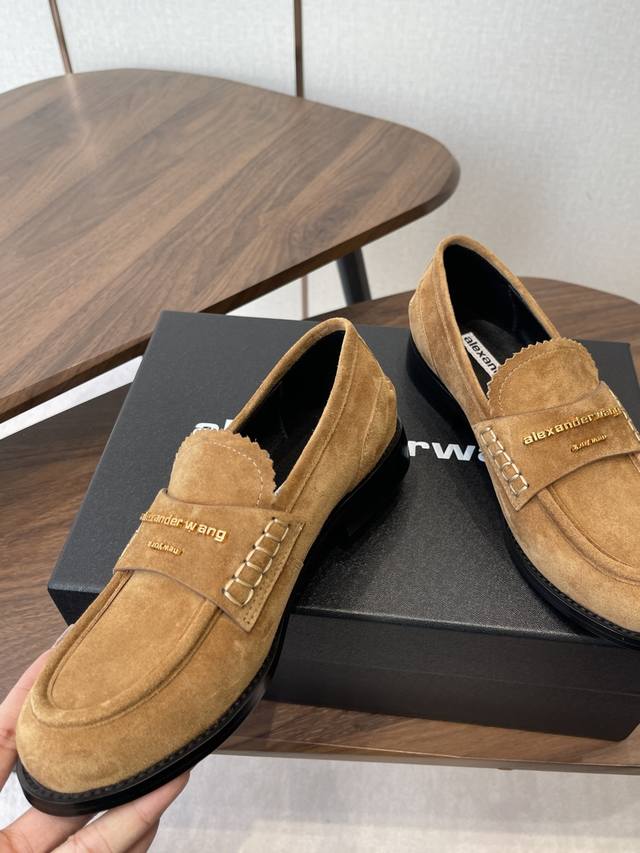 Alexander Wang, the king of loafers. These loafers are an absolute must-have for those with long legs! They make you look taller and slimmer, and the classic black color is incredibly versatile. The high-gloss leather upper paired with the iconic brand metal logo effortlessly creates the illusion of longer legs! Original imported suede and sheepskin upper, Italian genuine leather lining, and Italian leather outsole. Size: #35-40. Size 40 is custom-made and non-refundable.