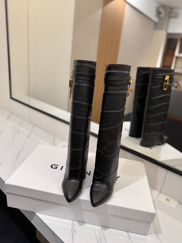 Authentic, Custom-Made Givenchy 2025 New High-Heeled Boots, Top-Quality Version on the Market. The Givenchy buckle is a fashion icon. Original design, super accurate and highly realistic. Excellent fit, slimming, and luxurious. Super comfortable. Upper: Imported cowhide. Lining: Calfskin. Custom-made matching mold with iconic logo buckle. Buckle available in pure silver, pure gold, and a gold and silver mix; please specify your preference in the order notes. Heel: 8.5cm, matching mold. Outsole: Imported genuine leather. Sizes: 35-40 (34.40 41:42). Customizable, non-refundable .