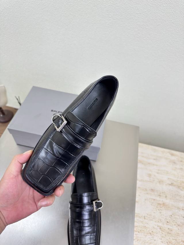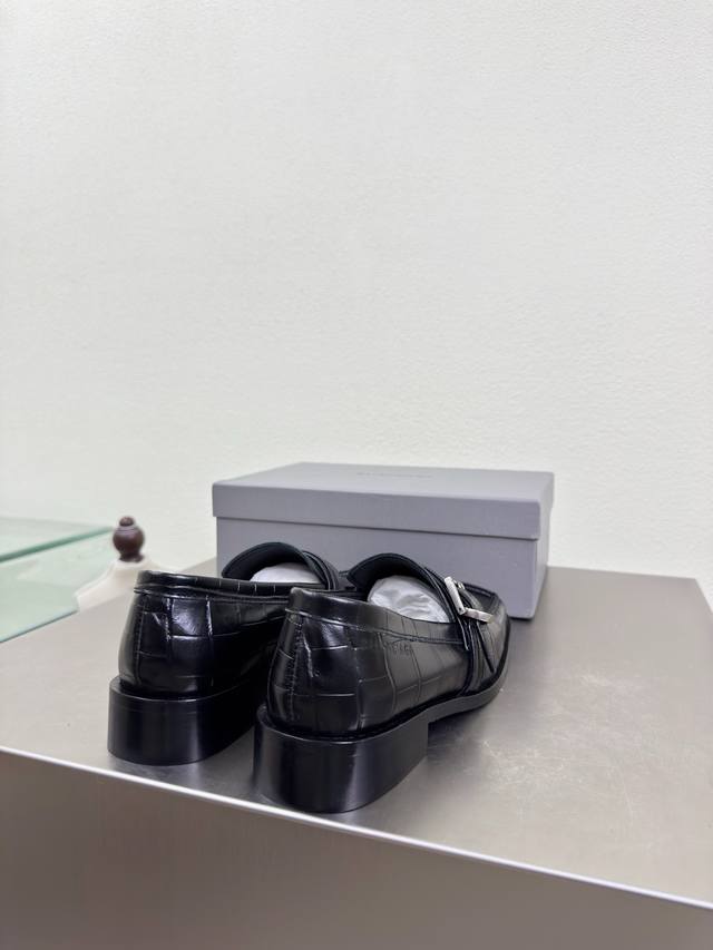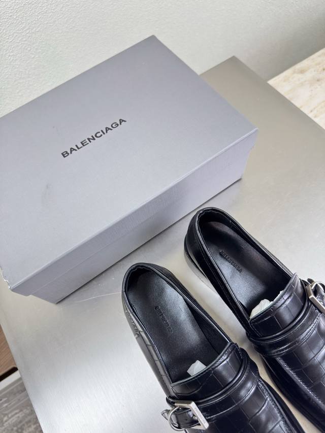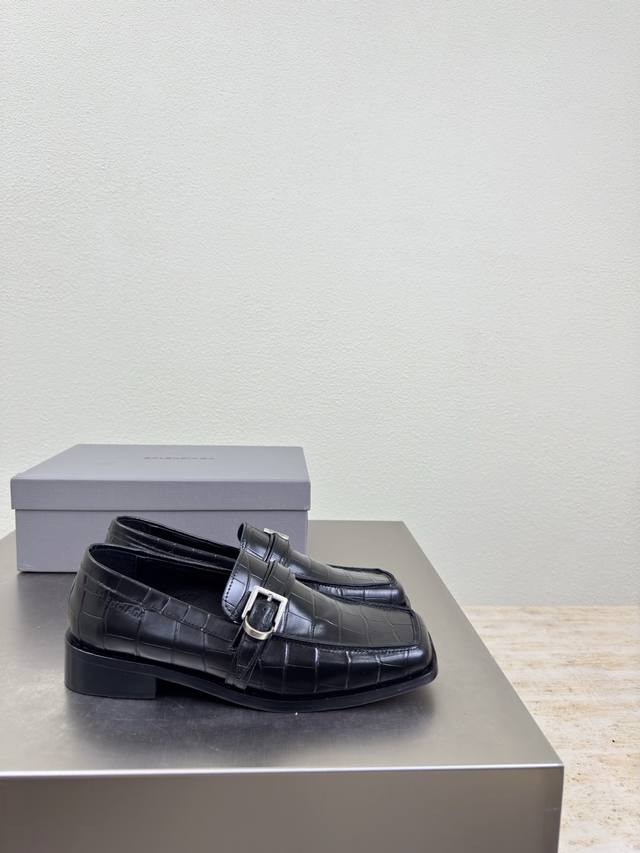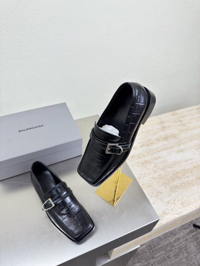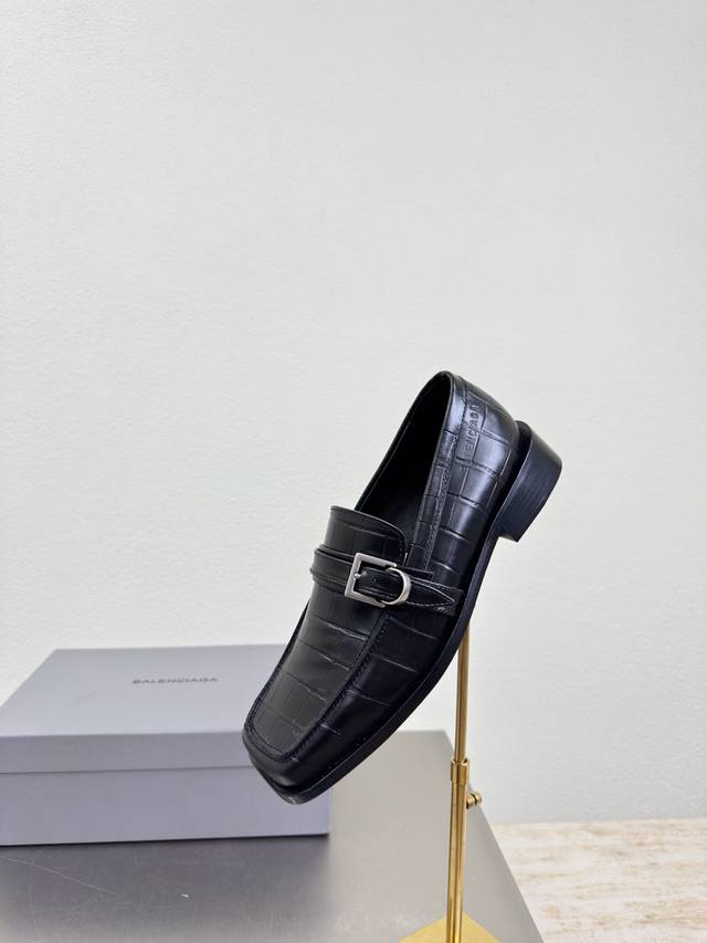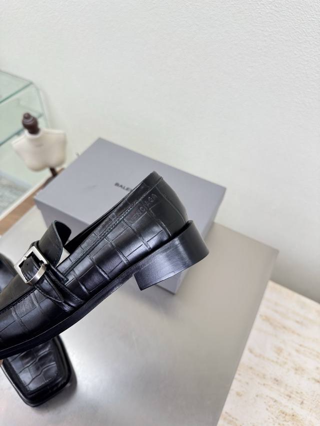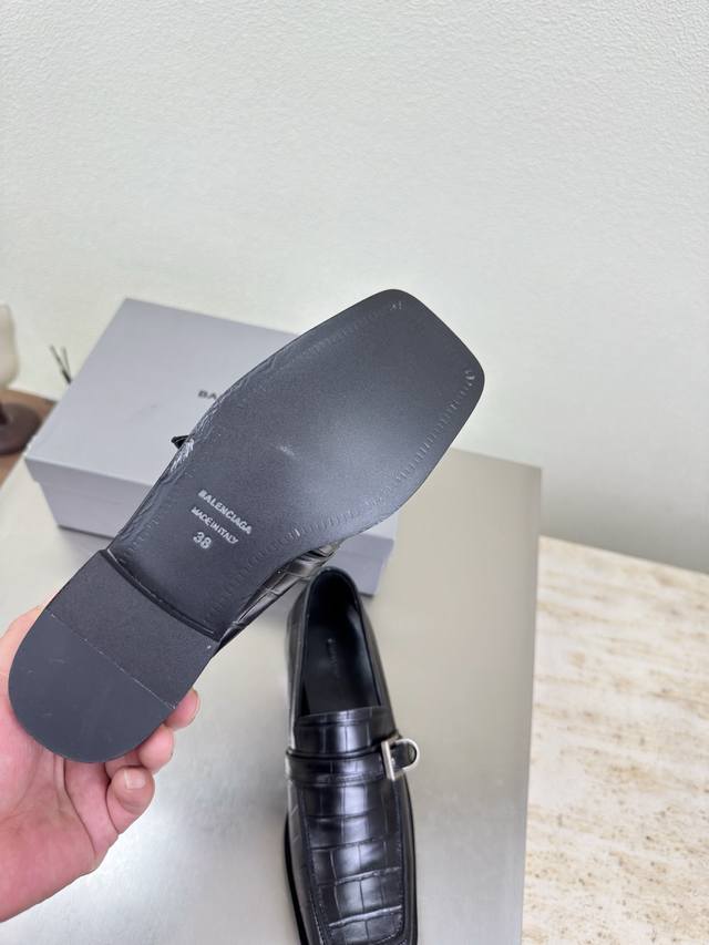 Balenciaga Square Toe Loafers, Haute Couture Series. Features exclusive Balenciaga metal sphere embellishments, black crocodile-embossed cowhide leather upper, lambskin lining, and is a top-tier version with all materials matching the original. Continues Demna's rebellious attitude towards mainstream glamorous fashion. Includes a translucent dyeing process, a large logo, a special heel design with the family logo, and an Italian genuine leather outsole. Sizes 34, 35, 36, 37, 38, 39, 40, and 41. Custom orders are non-refundable and non-exchangeable. Comes with original packaging.