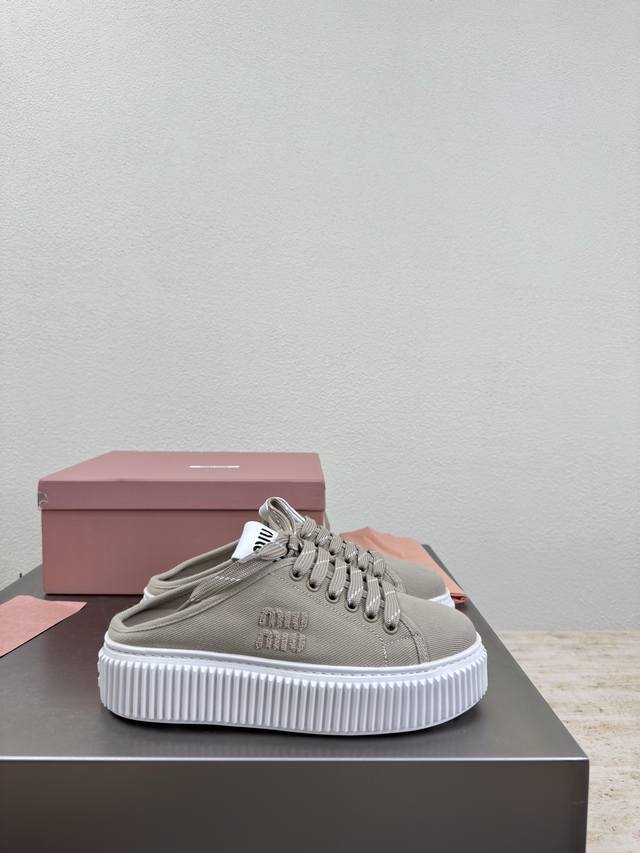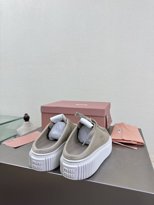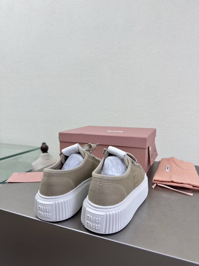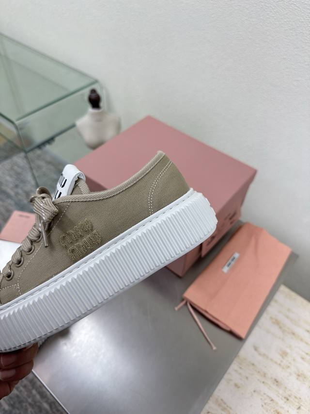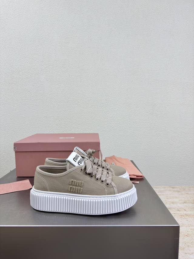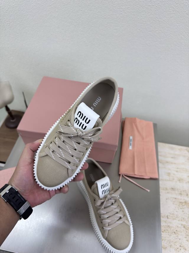 Biscuit-soled sneakers, classic Miu'miu, apricot color, thick sole design, terry cloth embroidered logo on the side, Miu'miu classic and comfortable construction, original molded outsole, high-quality material, original washed canvas lining, 3D stitching, original molded outsole, non-slip and durable, original design, girlish and comfortable, size 35, 36, 37, 38, 39, 40, 40 (custom sizes available), original packaging included.