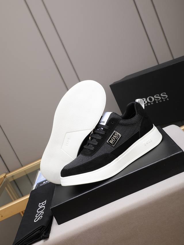 Boss's hottest style features a cowhide upper with embroidered waterproof fabric