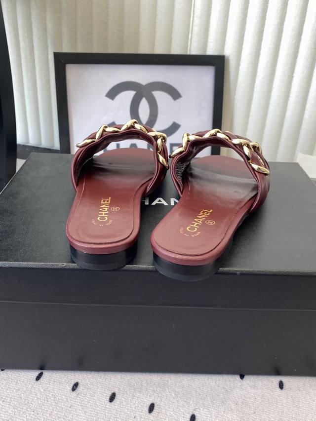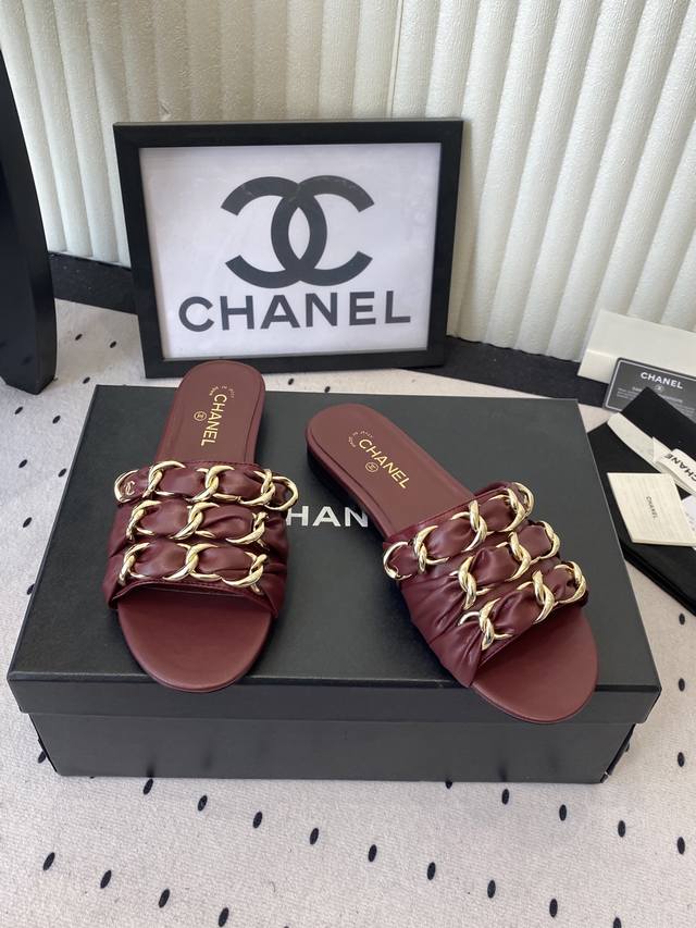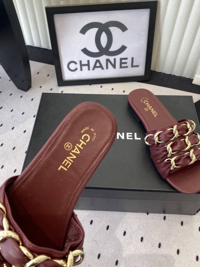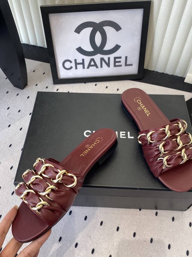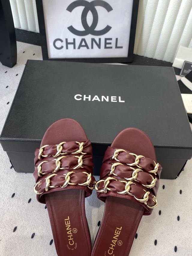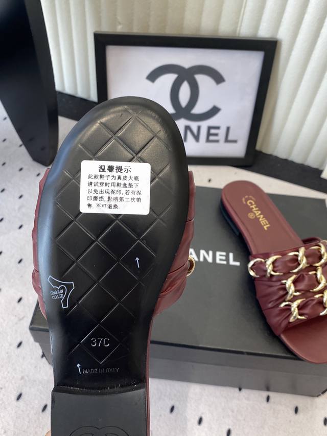 Chanel Early Spring New Chain Slippers. Exquisite and three-dimensional, shimmering with a unique radiance. So gentle and irresistible, they exude a noble and fashionable aura! Upper: Lambskin Lining: Lambskin Heel Height: Flat Sole: Italian genuine leather Sizes: 35-41. Sizes 40 and 41 are custom-made and non-refundable.