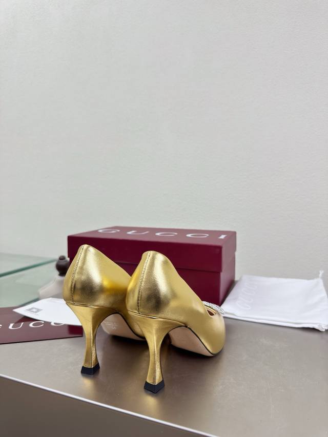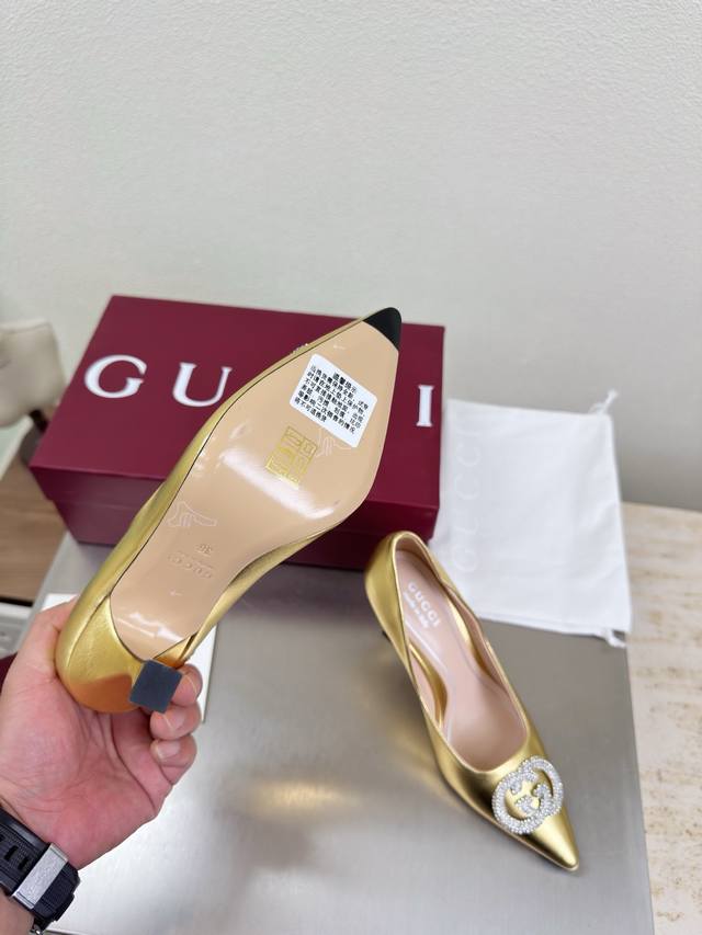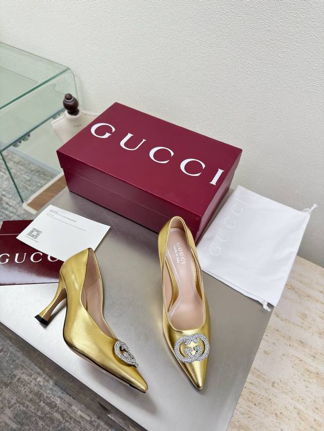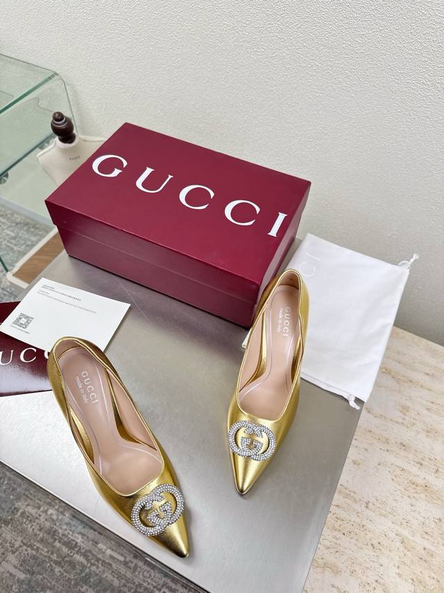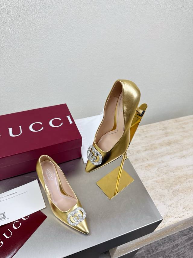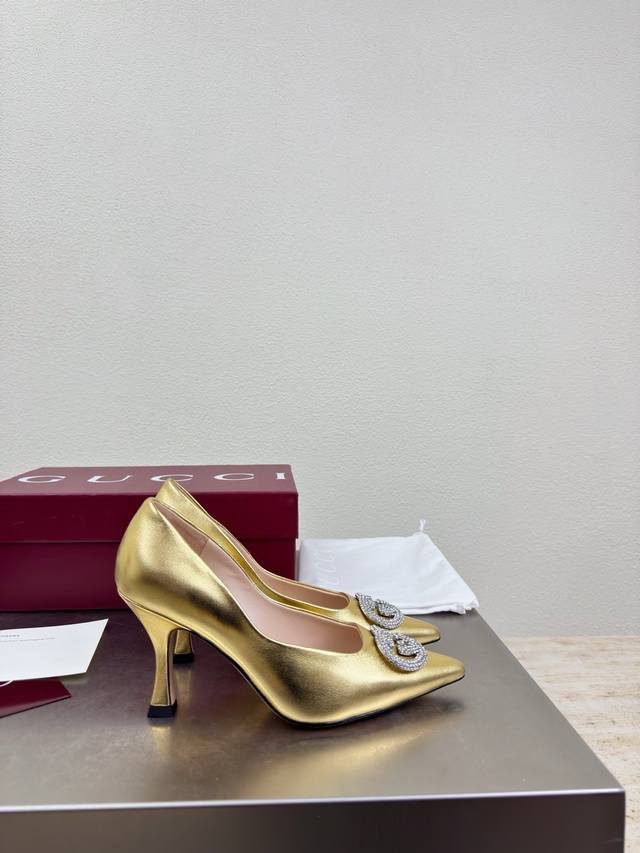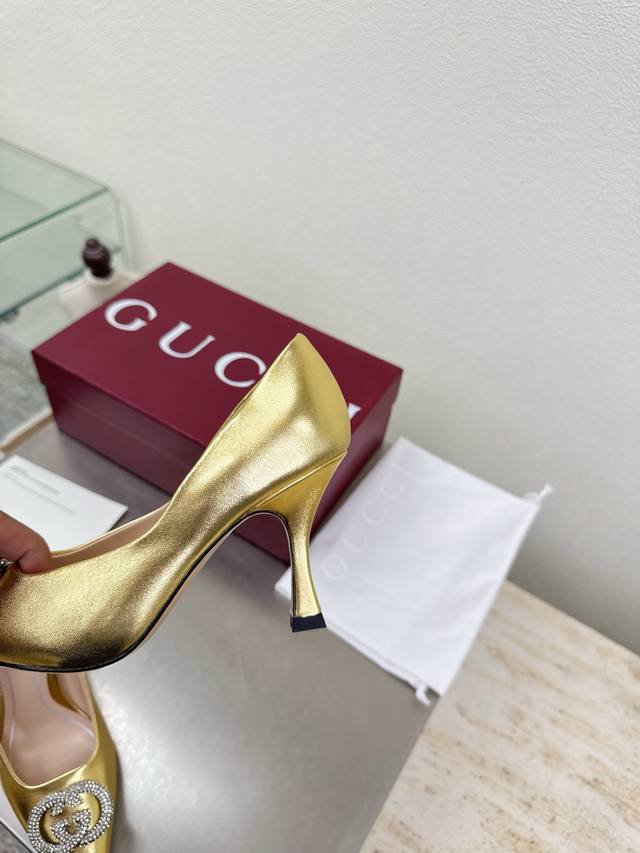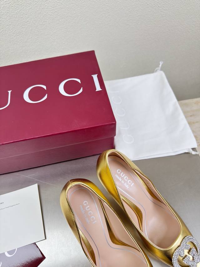 Classic Gucci Double G Rhinestone Buckle Shoes. Features a double G logo, gold metallic lambskin logo, and a stylish brand logo for high recognizability. This high-heeled shoe, a Paris fashion runway piece, showcases a new fashion charm and continues the ultra-high-heel design. It's favored by renowned overseas bloggers and endorsed by millions of fans. It's a bestseller both domestically and internationally, already sold out in China. Top-tier candy-colored versions, each color is absolutely gorgeous. Multiple colors available. Upper: Metallic lambskin; Lining: Imported lambskin; Sole: Original genuine leather outsole . Sizes: 35 36 37 38 39 40 41 42 40 41 42. Packaging: Original Gucci packaging.
