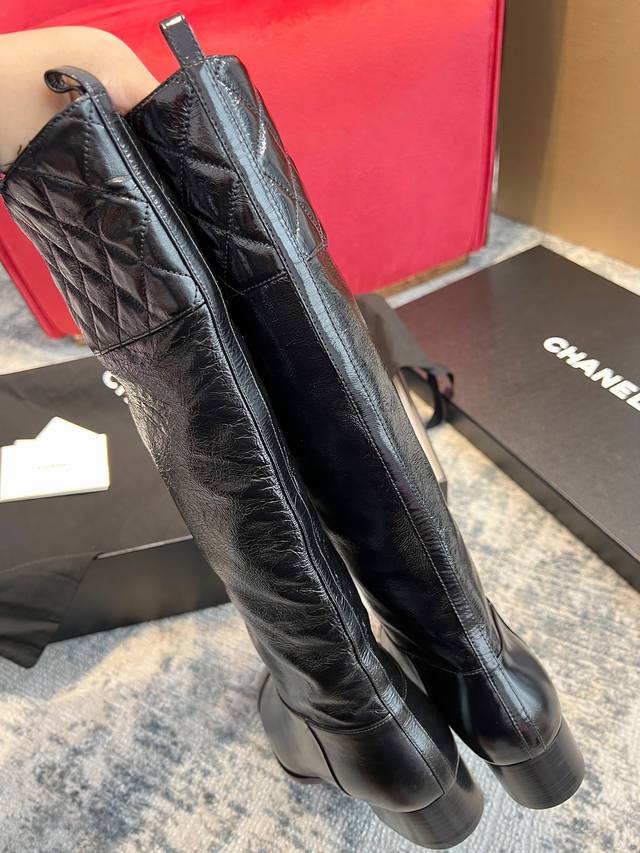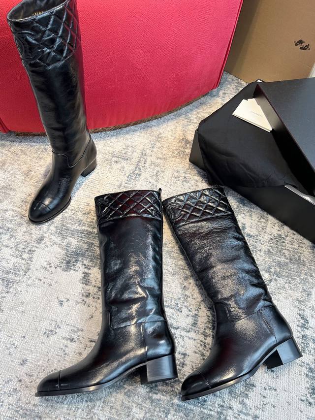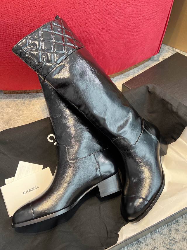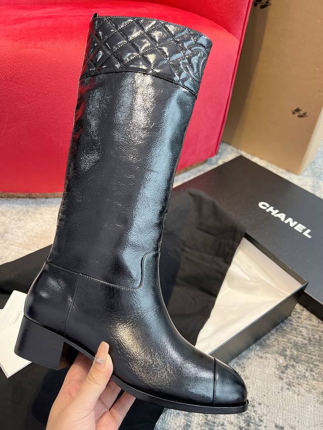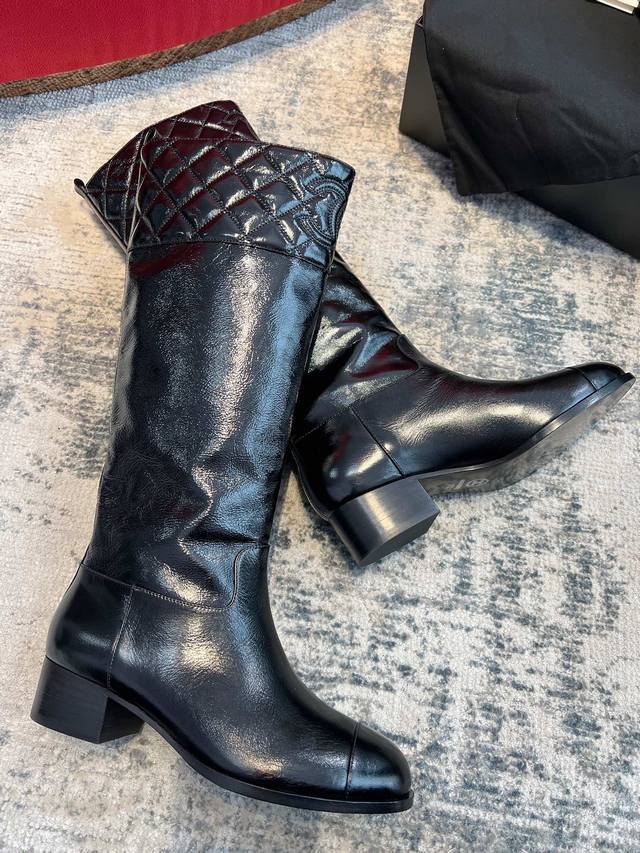 Dongguan-made Chanel 25B new quilted knee-high boots Ddd Chanel 25B new arrival~ Patent leather knee-high boots are amazing, absolutely luxurious, and look good with everything. The slip-on design makes them super convenient to wear with straight-leg pants in autumn and winter, and they're incredibly comfortable. Plus, the leather is very easy to care for! Ddd Upper: Incas Chanel-specific patent leather Ddd Lining: Grade A full-grain mixed sheepskin Ddd Outsole: Grade A Italian original cowhide 4cm heel height Ddd Size: 35