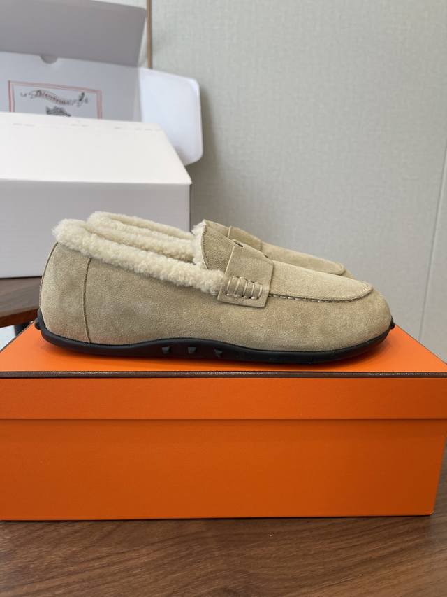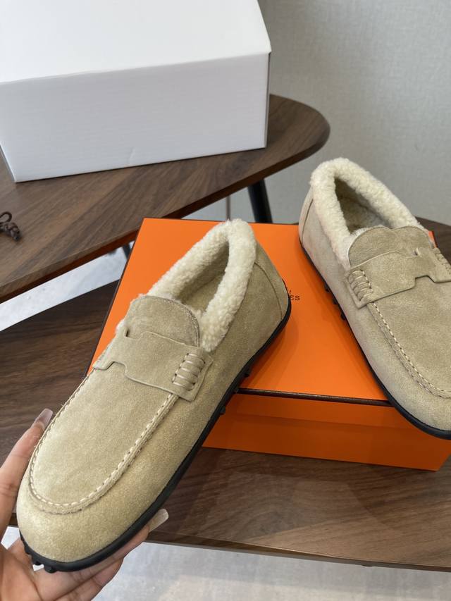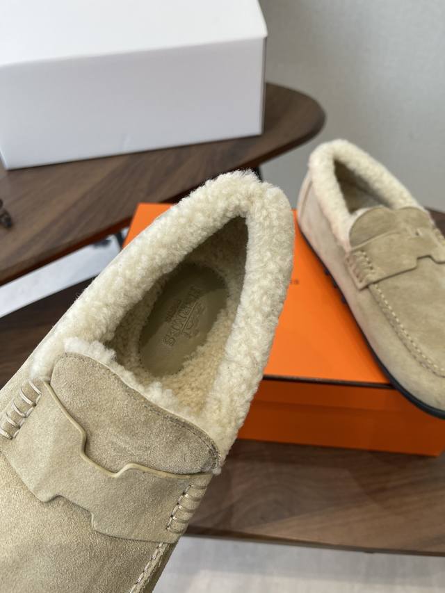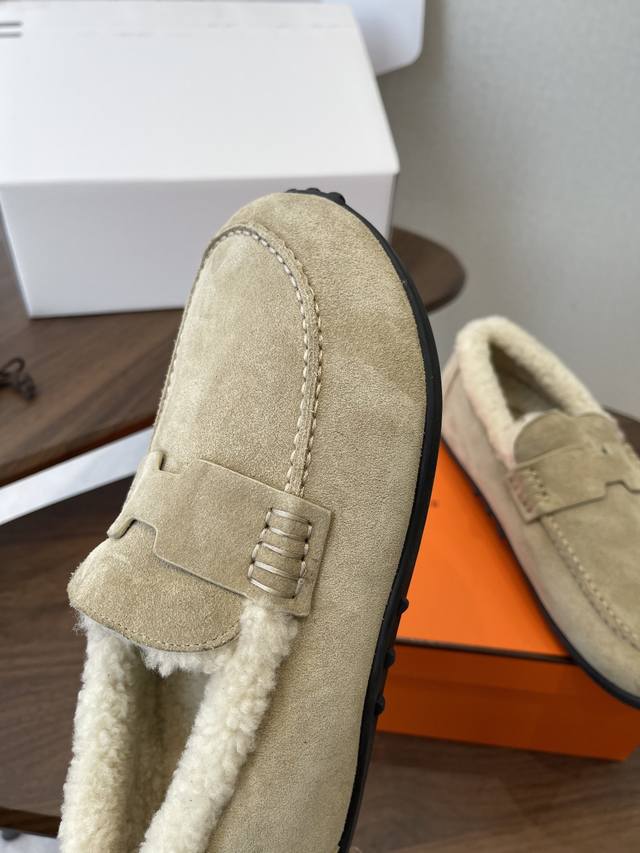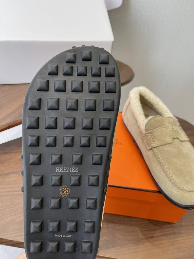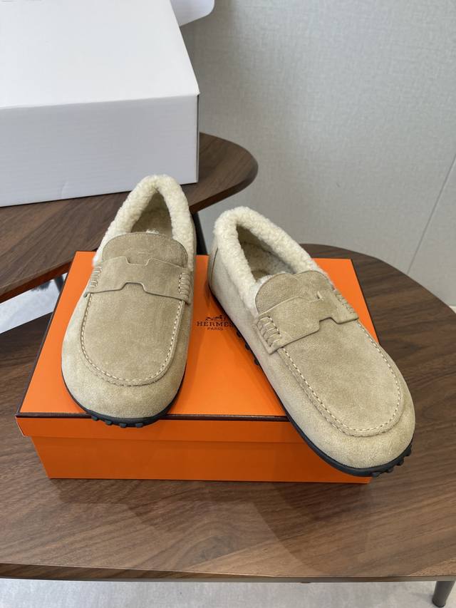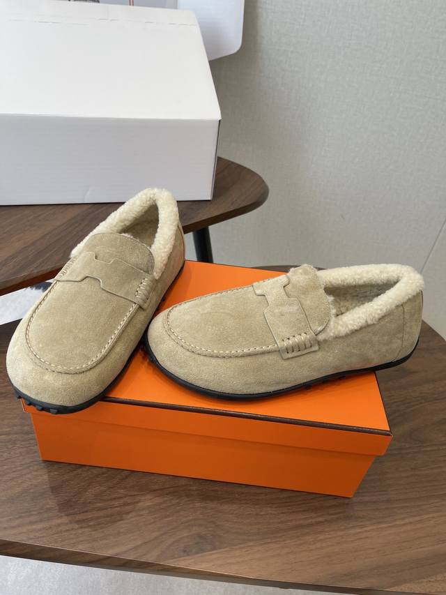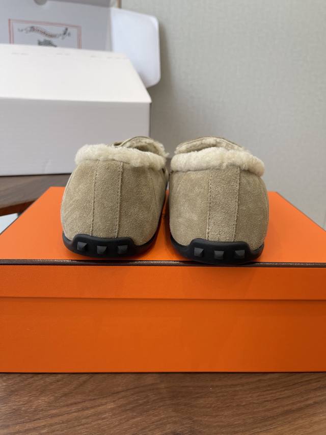 Dongguan-made, official website synchronized box packaging. Hermes latest 2025 autumn/winter closed-toe wool slippers. Super versatile, stylish, and recommended by many celebrities and influencers. A must-have for autumn/winter. Casual, comfortable, and high-end. Upper: Imported sheepskin. Lining: Imported wool. Insole: Bumper-cut mixed sheepskin. Outsole: TPU anti-slip and wear-resistant outsole. Size: 35-41. 40-41 are custom-made and non-refundable.