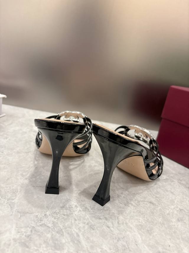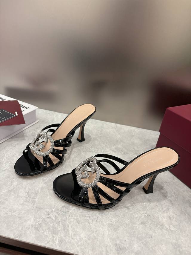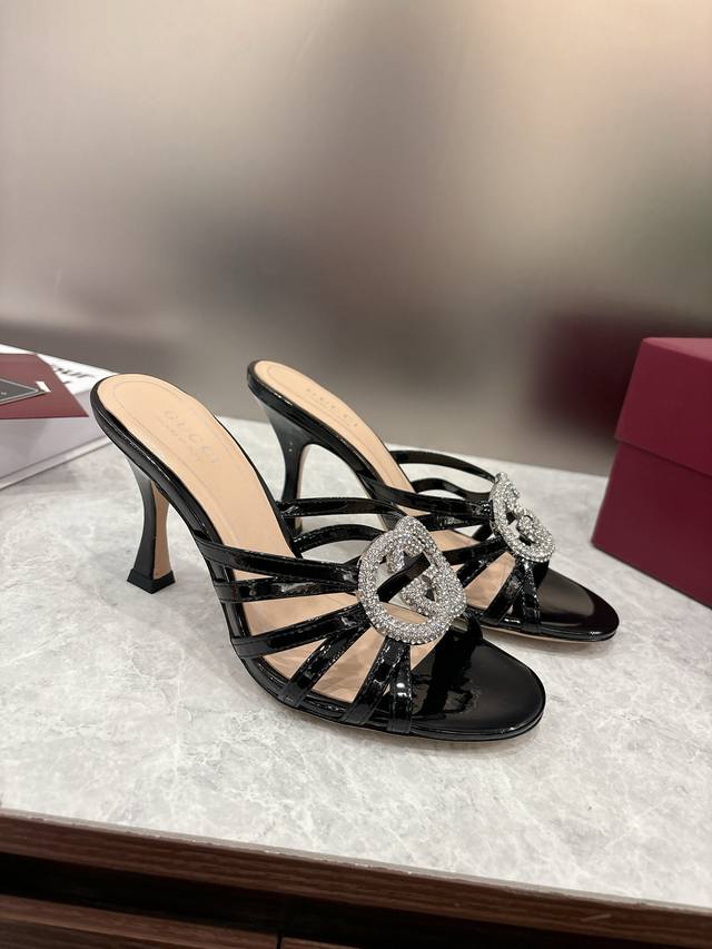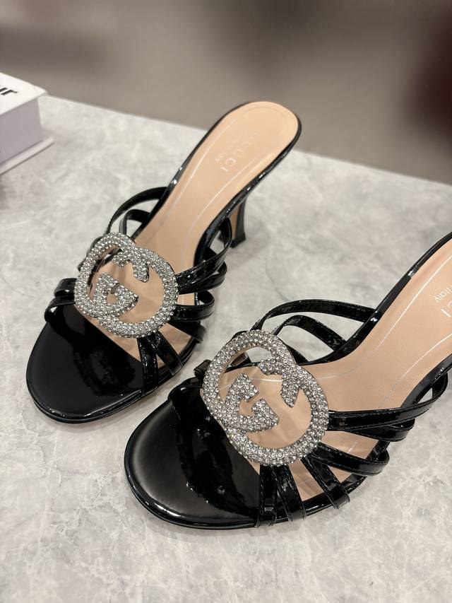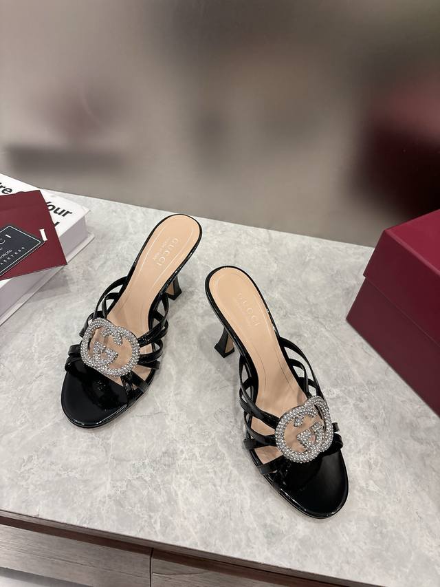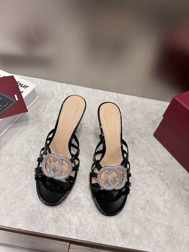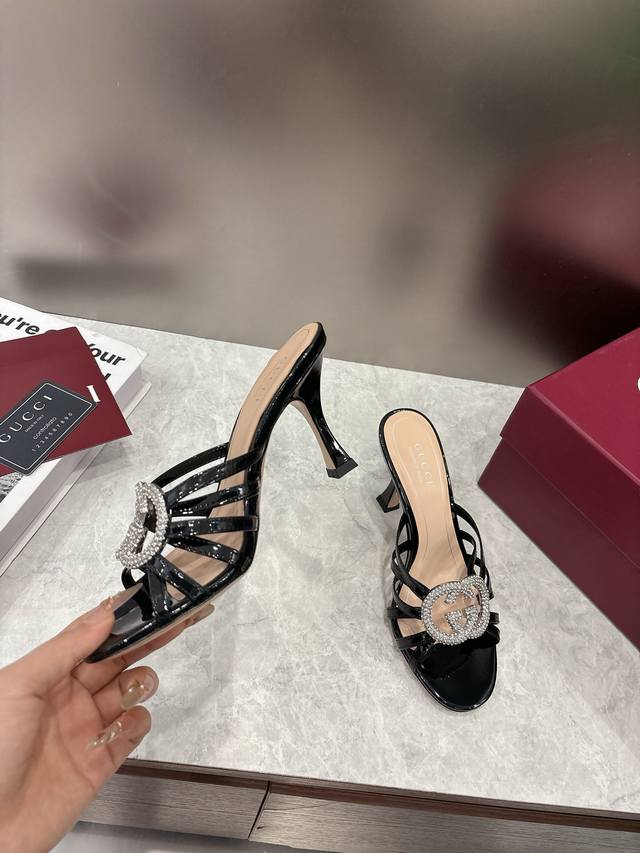 Early Spring High-End Gucci Slippers. Double G buckles with crystal rhinestones add sparkle to the design. Classic design with stiletto heels and straps, perfect for both sophisticated and everyday wear. Upper: Patent leather suede. Lining/Insole: Mixed sheepskin. Sole: Italian leather. Heel Height: 8.5cm. Sizes: 36-42, 42, 41, 40. Custom orders are non-refundable. Factory Price (pp): 330.