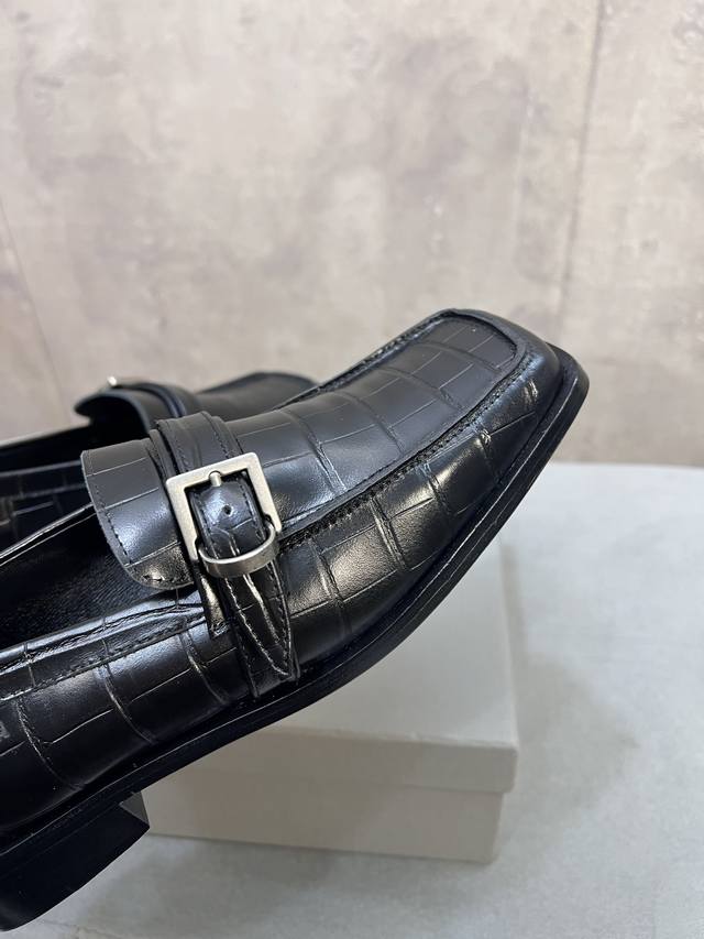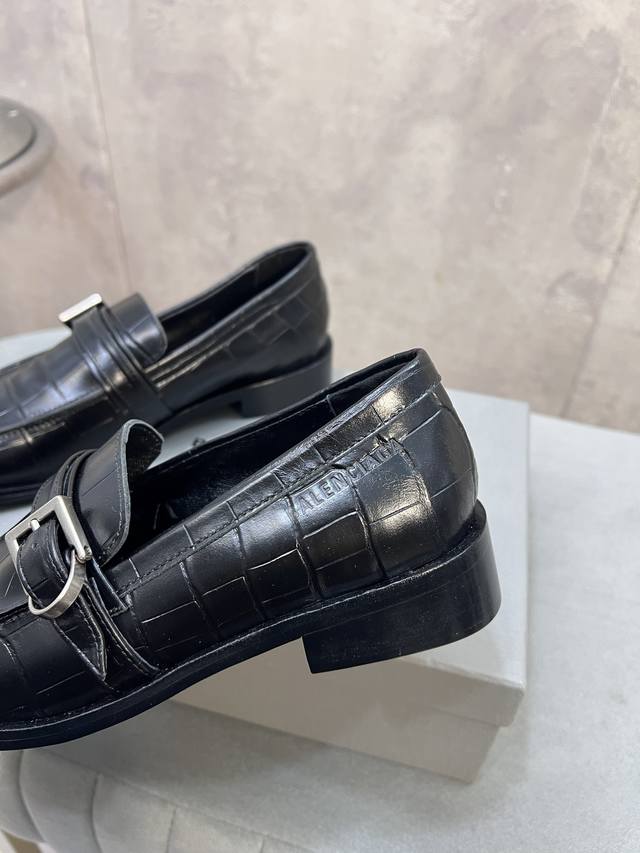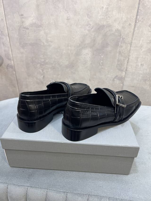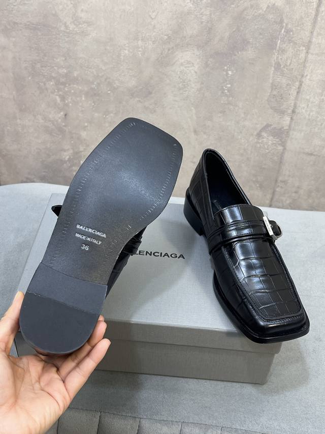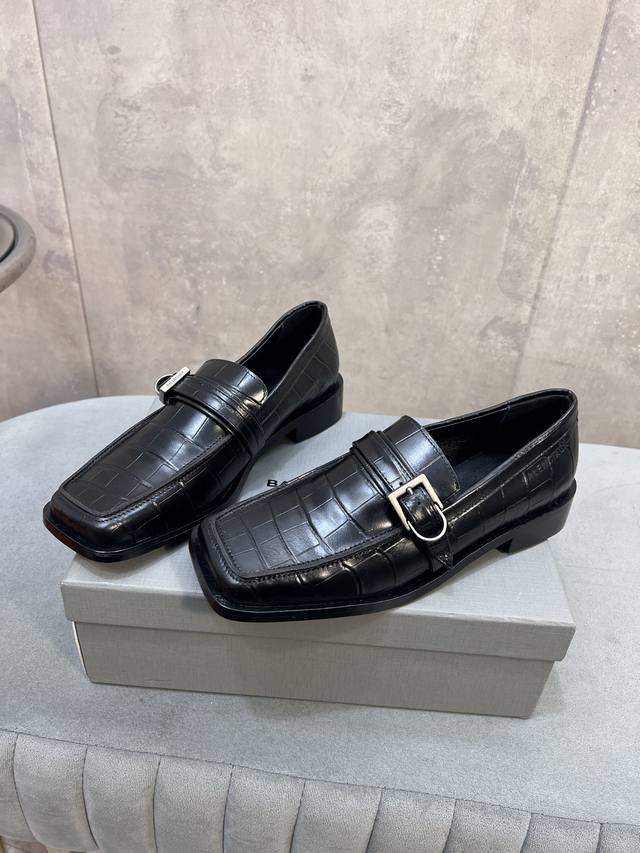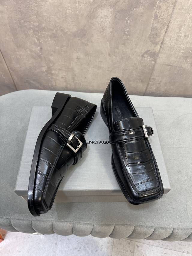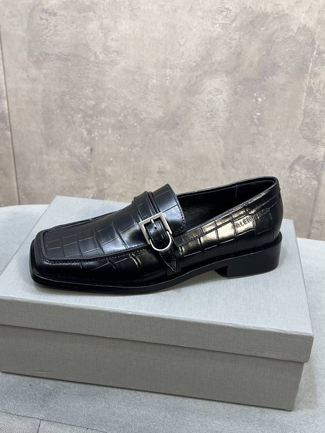 Factory direct. Balenciaga 26Ss early spring new low-heeled square-toe punk style loafers, women's shoes with Balenciaga logo, hardware, and buckle. Mary Jane shoes. Material: Custom imported stone-patterned calfskin upper. Lining: Mixed sheepskin lining. Outsole: Italian genuine leather outsole. Size: 34-41. 34, 40, 41 are custom-made and non-refundable.