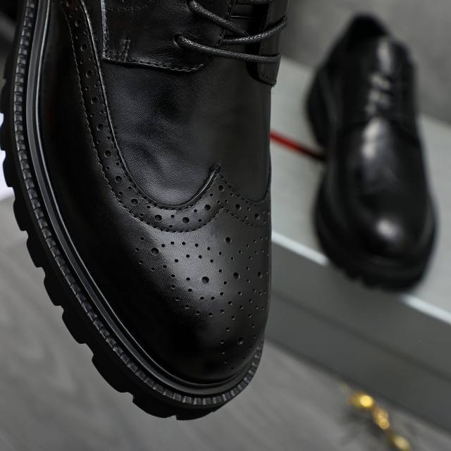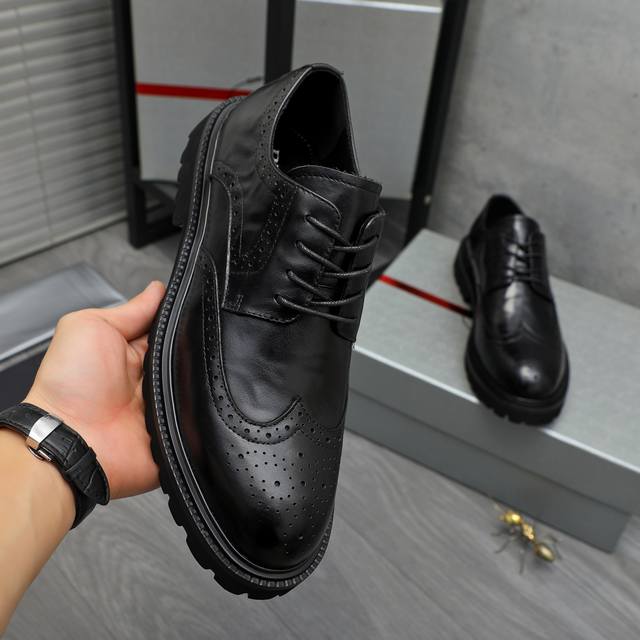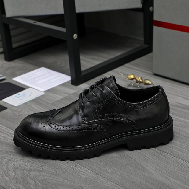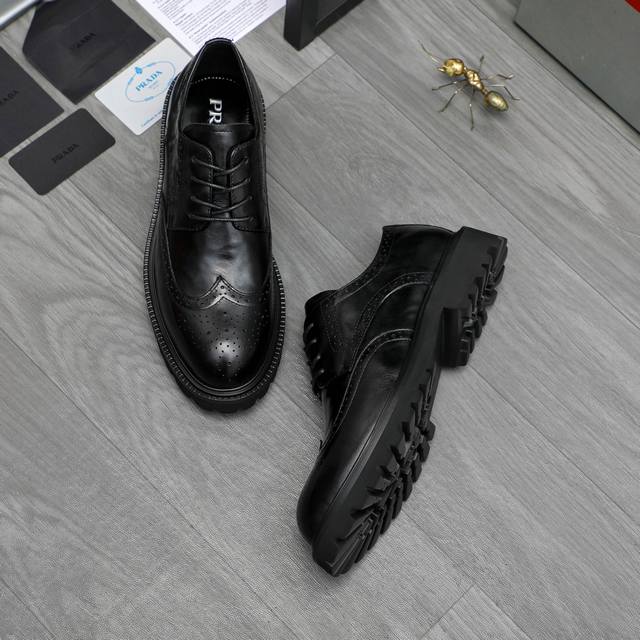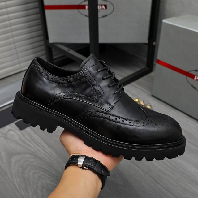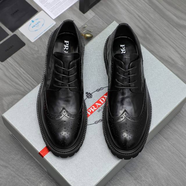 Factory direct price men's clothing, shoes, sportswear, original brand, trademark: Prada business formal leather shoes. Sizes: 38-44, 45. Custom orders are not accepted. Materials: Selected high-quality perforated cowhide upper, cowhide lining, original rubber anti-slip outsole.