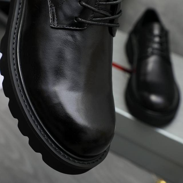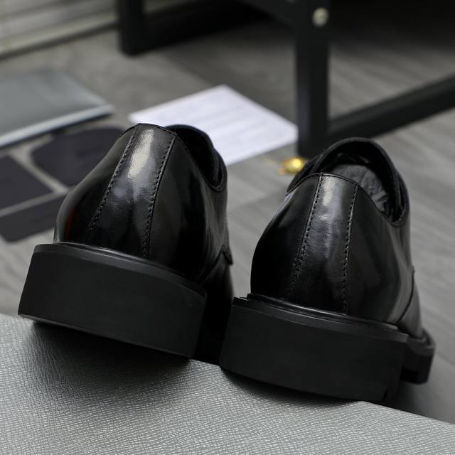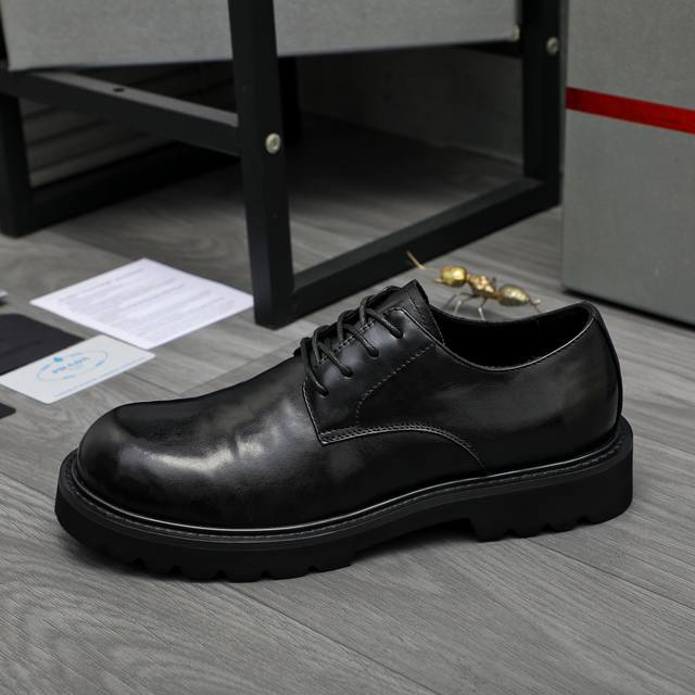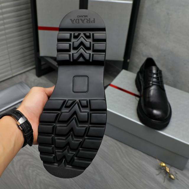 Factory direct price men's clothing, shoes, sportswear, original brand. Trademark: Prada round toe business formal leather shoes. Sizes: 38-44, 45. Custom orders are not accepted. Material: Selected high-quality cowhide upper, cowhide lining, original rubber non-slip outsole.