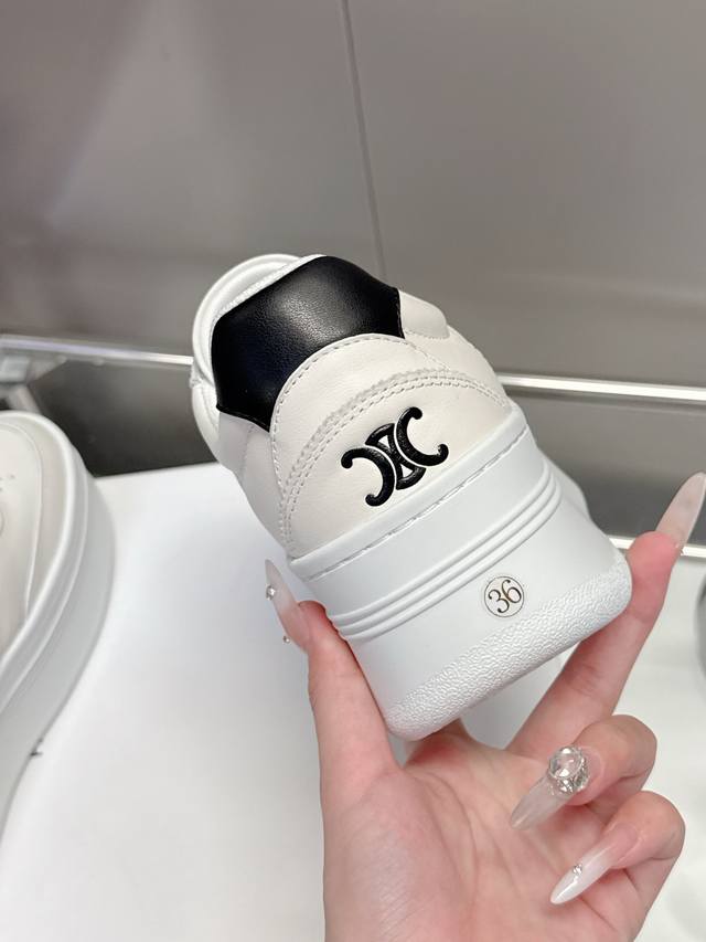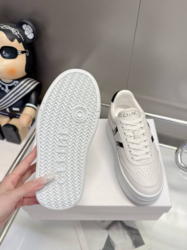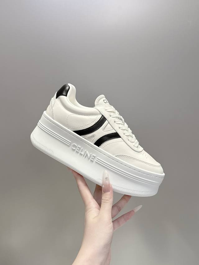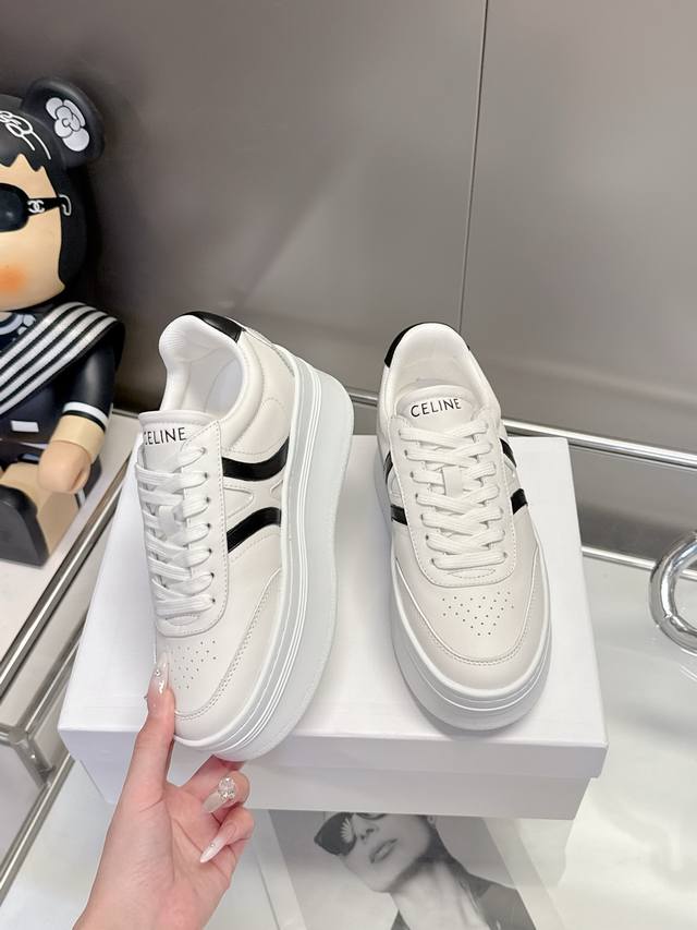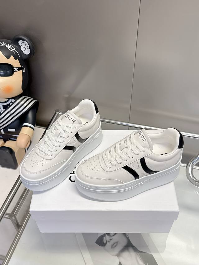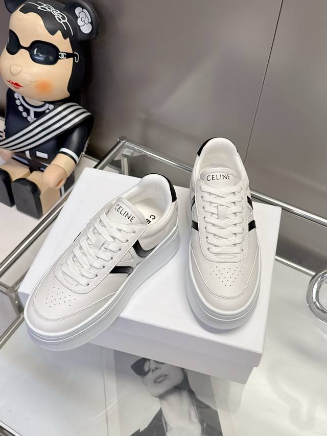 Factory direct price women's clothing, shoes, sportswear, original order. Sizes 35-40, 41 (custom made). Celine 2025 new style 5cm platform classic white sneakers, adorned with simple yet unique colorful lines, exuding a low-key yet sophisticated feel, every detail is exquisite. The 5cm platform design subtly adds height without looking bulky, making walking super stable. Whether paired with a vibrant short skirt or casual jeans, it easily achieves a fashionable look, a sure-fire way to turn heads on the street, a universally flattering choice, a must-have! #CelineNewStyle #PlatformWhiteSneakers #2025FashionItem