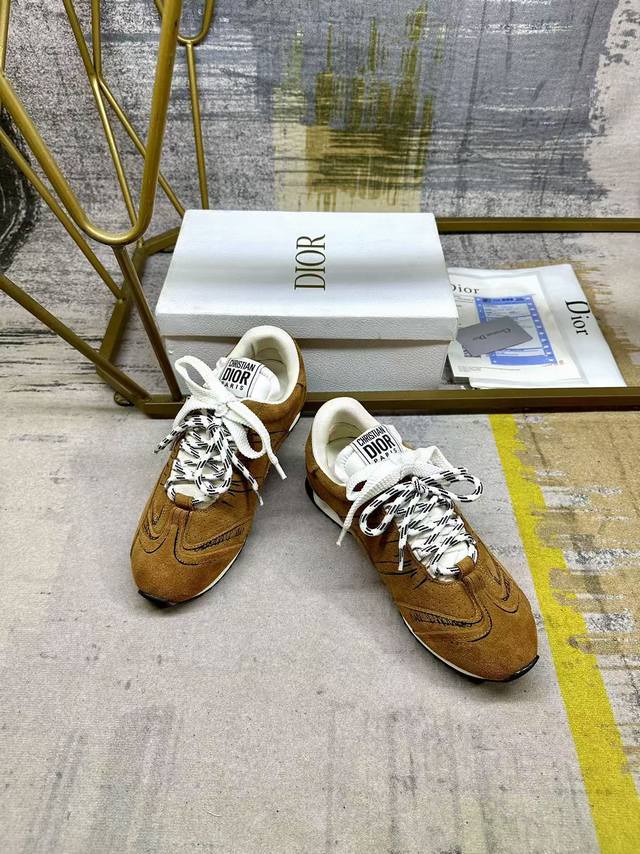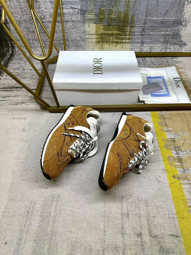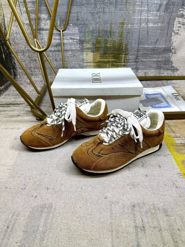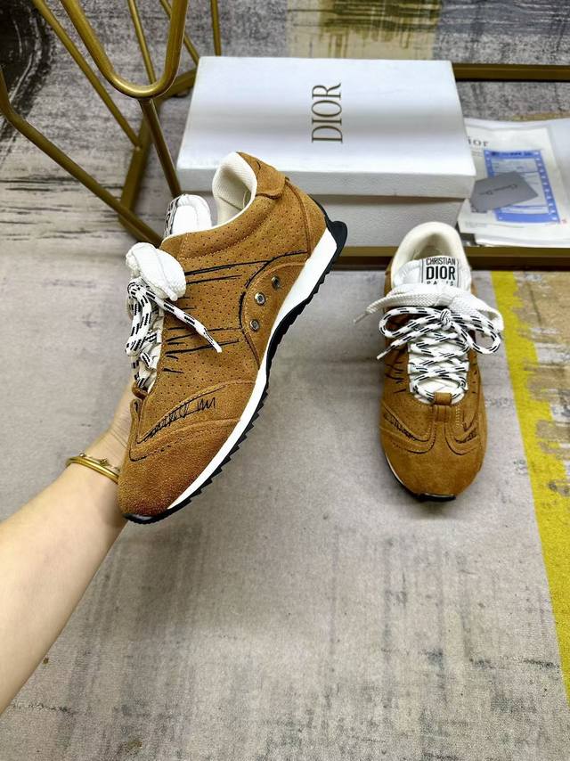 Factory direct price women's shoes and athletic shoes original order. This D-Sketch athletic shoe showcases a classic retro aesthetic, meticulously crafted from brown suede and adorned with prints inspired by the shoemaking process. It features unique two-tone laces. The handwritten logo on the side and the two-tone slim sole add a couture touch to various casual looks. Size: 35-41 DDD