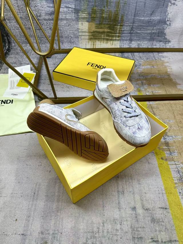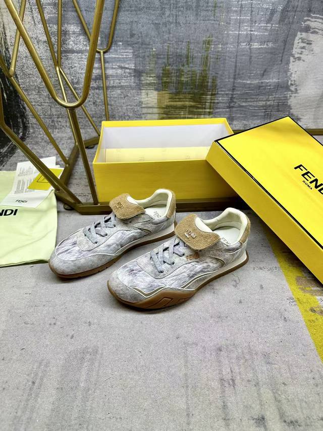 Factory direct price women's sports shoes, original Fendi Wave Pulse lace-up low-top sneakers. High-tech fabric with white graphic print and beige suede inlays. Beige cavalino leather fold-over tongue and heel. Tonal tubular laces. Three-dimensional rubber logo on the side, gold metal Fendi logo on the tongue. Beige rubber running shoe sole with a wraparound edge design on the side, decorated with a diagonal F pattern. Sizes 35-41 (DDD)
