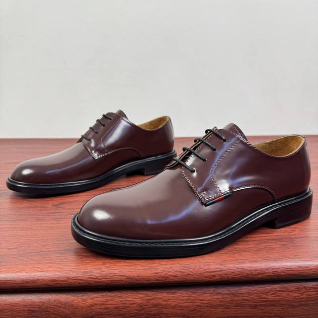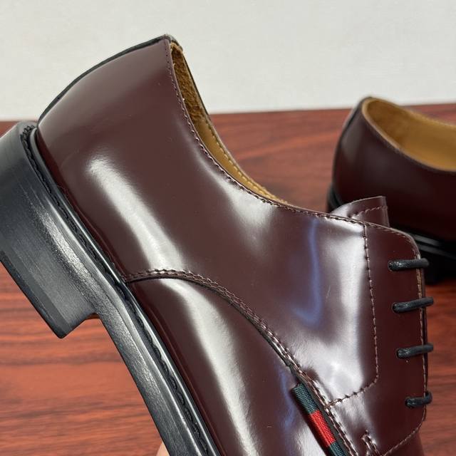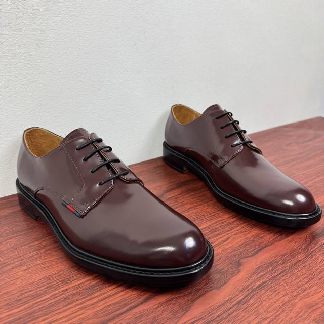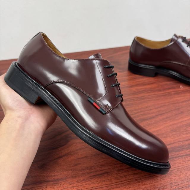 Gucci Autumn New Men's Lace-up Derby Shoes! These lace-up shoes are crafted from smooth, glossy cowhide leather, featuring an elegant and refined silhouette that showcases the brand's classic and elegant style. The European-style last and precise cutting of a single piece of leather create a premium feel with excellent luster and durability. The classic red and green webbing adds a layered design element. The relaxed-fit sneakers feature a natural-dyed calfskin lining with evenly distributed perforations, a soft and comfortable thickened genuine leather outsole, and a composite rubber heel for superior comfort, durability, and slip resistance. A top choice for understated luxury, these shoes are versatile and come with full packaging! Sizes: 39-40-41-42-43-44. Custom sizes available: 38, 45, 46. Item Number: 812142 Burgundy.
