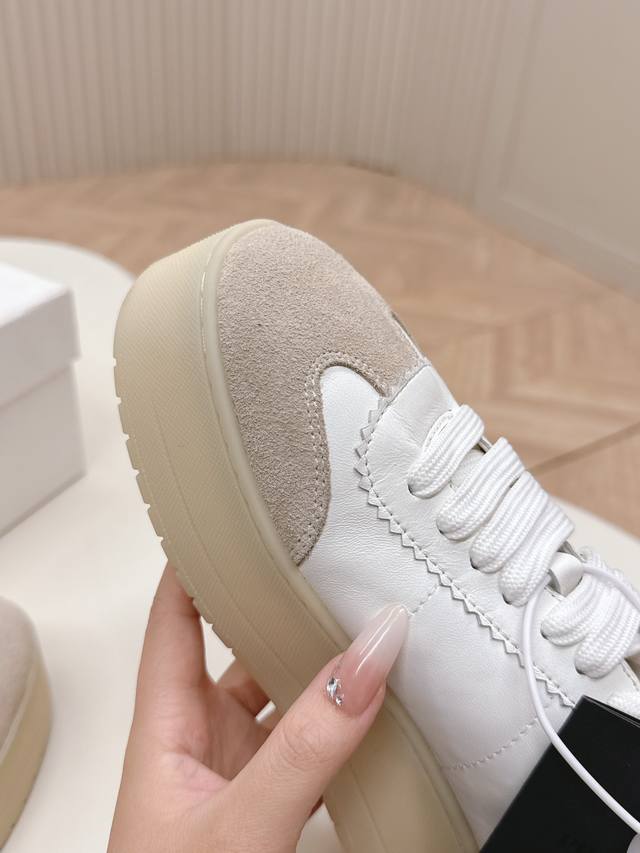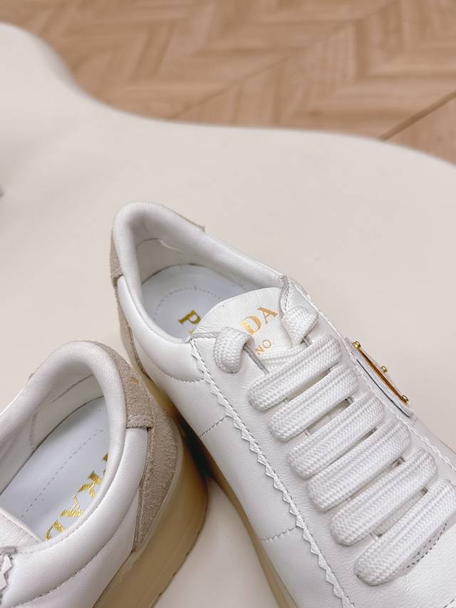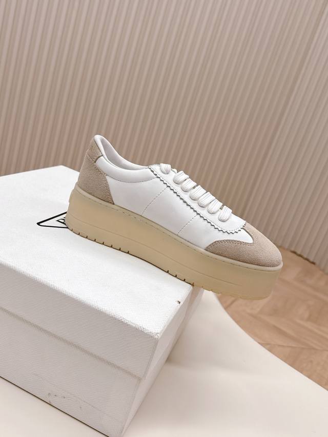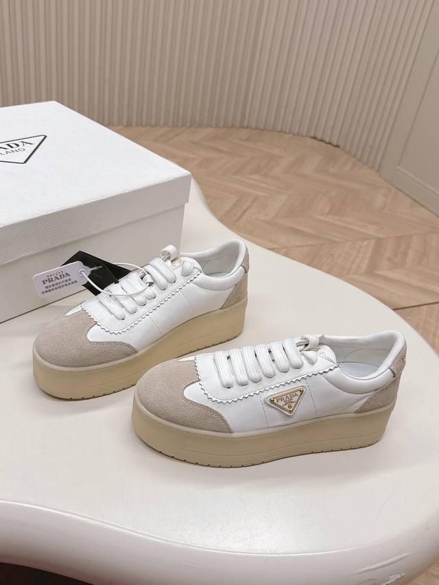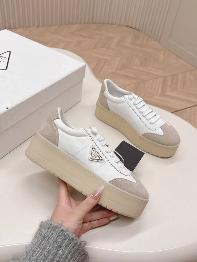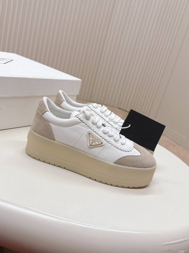 Highest quality Prada 25 new platform casual sneakers. These sneakers continue the timeless silhouette, a new classic item. Crafted from premium leather, they exude style. Lightweight and featuring a triangular buckle logo and a 5cm platform sole, they are suitable for all seasons and can be paired with various casual looks. In an era saturated with various styles, the white sneaker remains a timeless and enduring companion, gradually winning hearts. Material: Cowhide suede; Lining: Sheepskin; Outsole: Original TPU two-tone outsole; Sole thickness: 5cm; Sizes: Women's 35-40.