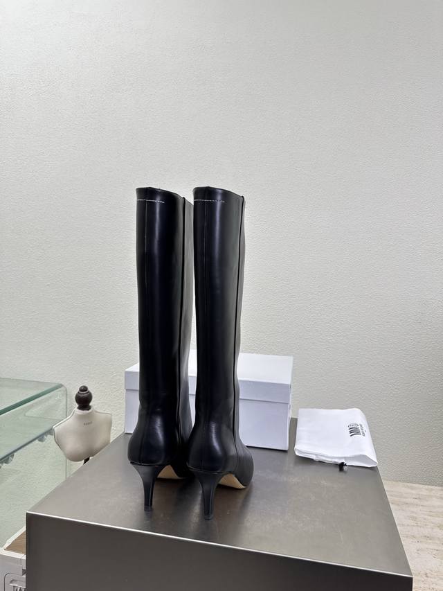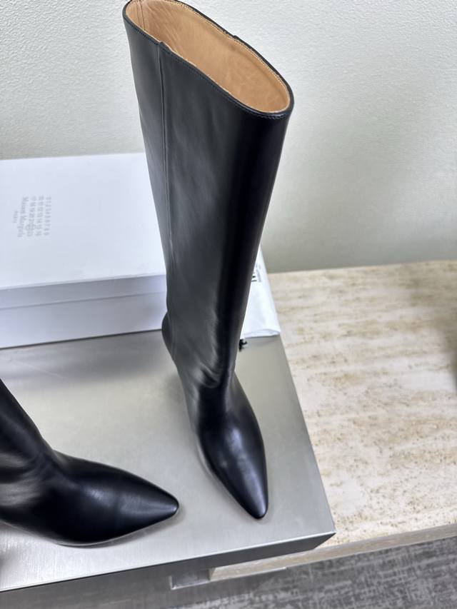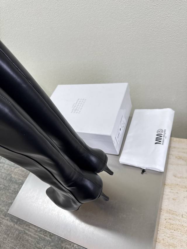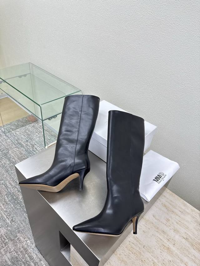 High-heeled pointed-toe slip-on boots, latest model 6, black calfskin, Bengal cowhide lining, Maisonmargiela Mm6, hot arrival! So tempting! Vibrant and colorful, exuding youthful charm! A must-have fashion item, simple yet stylish, a top choice for runners, a must-have for fashion and youthful style, casual and genuine feel. Simple and sophisticated design incorporating the unique Mm6 logo, suitable for everyday wear, casual vacations, and truly versatile. Italian genuine leather outsole with split design. Original materials, guaranteed quality. Please recognize our high-quality products. Sizes 35, 36, 37, 38, 39, 40, and 40 are available.