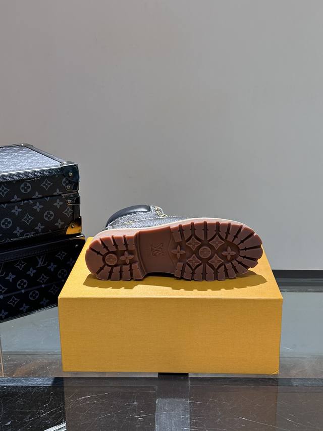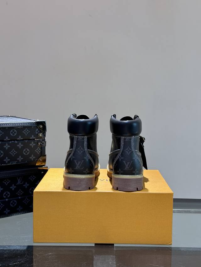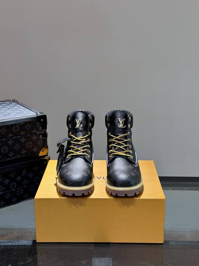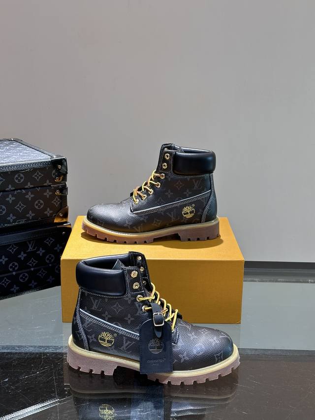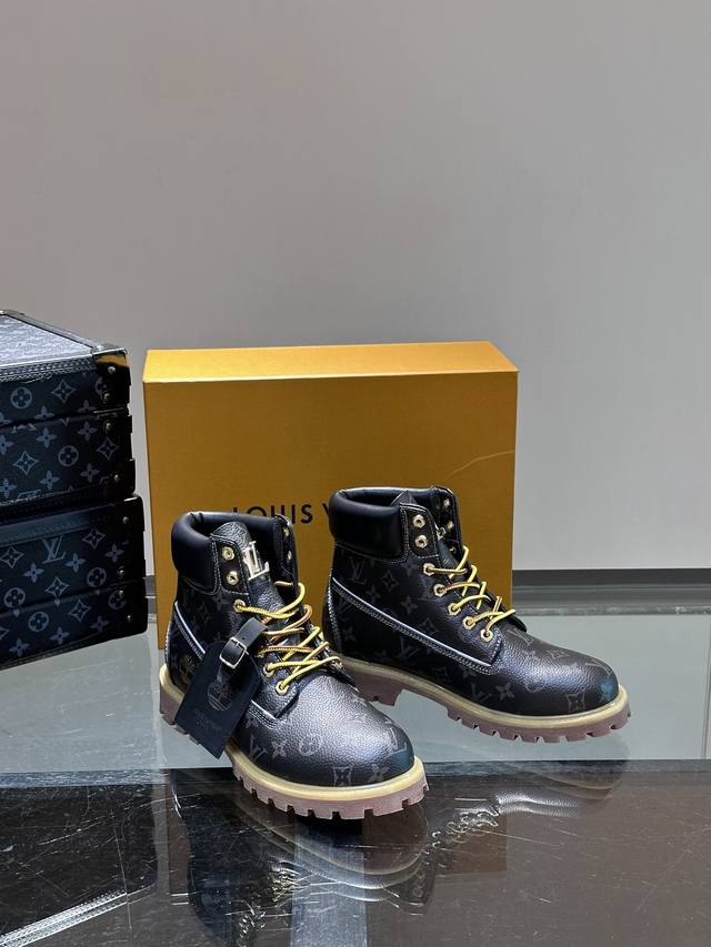L*X Timberland Collaboration Ankle Boots (Monogram Pattern) - Crafted from Monogram-embossed waterproof suede cowhide, these L*X Timberland ankle boots are meticulously reimagined in Italy, showcasing the classic Timberland 6-inch boot silhouette with an American workwear style. Features include a Monogram-embossed tongue, original Timberland laces, and a leather tag displaying the collaboration logo. Comes with exquisite boutique packaging! Sizes: 38-45