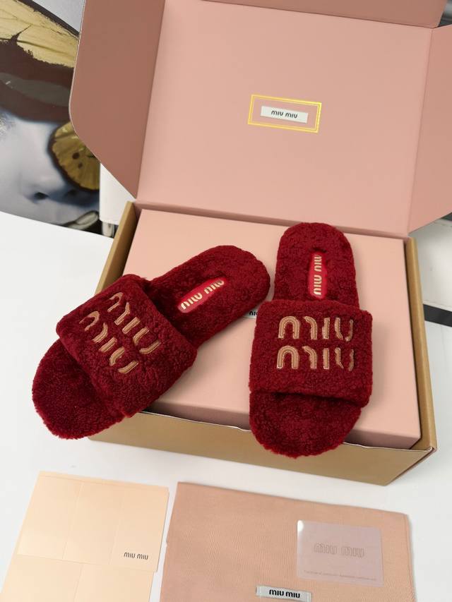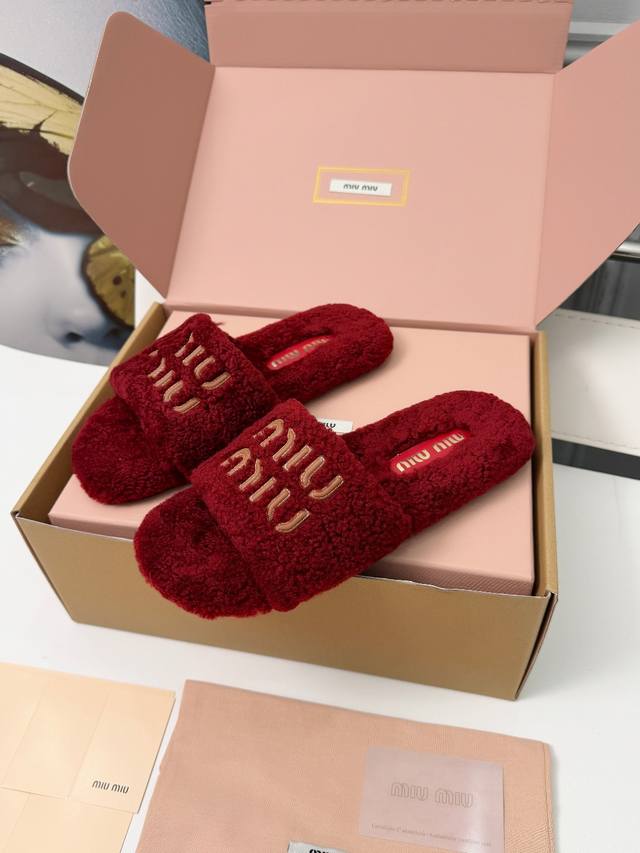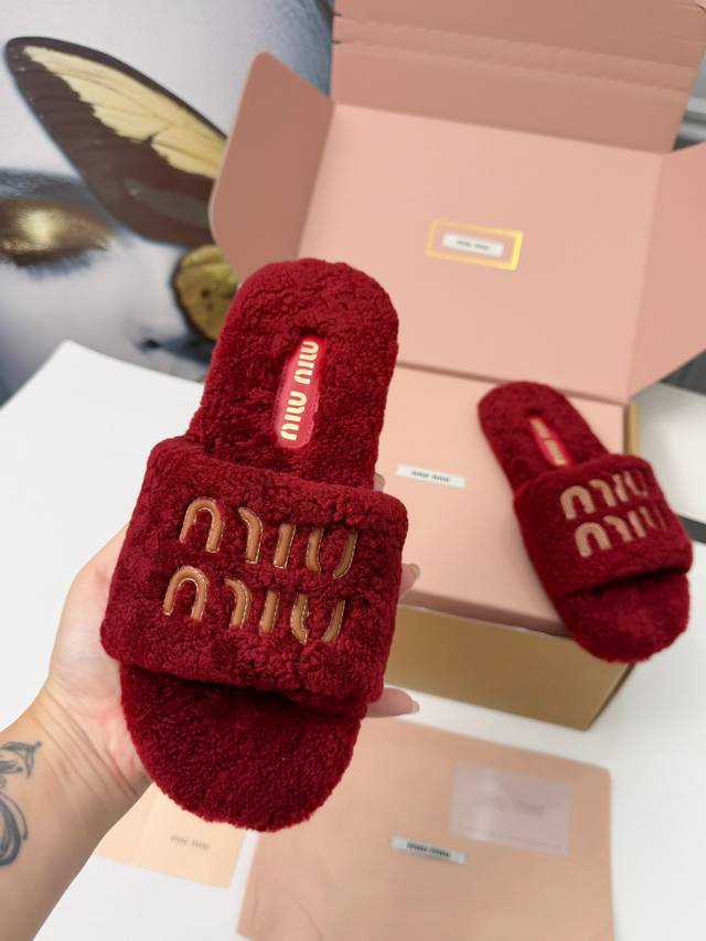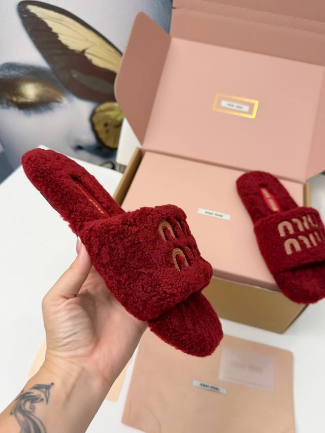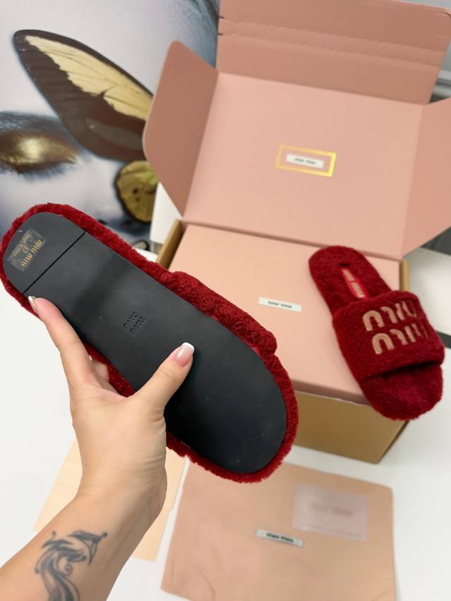 Miumiu flat fluffy slippers. The fluffy material wraps around your feet, making them super warm and soft, like walking on clouds. They won't rub your feet at all. The simple design is versatile and suits any style. They look sophisticated and easily elevate your everyday look. They exude French romance. Suitable for both lounging at home and going out, they're incredibly practical. Sizes: 35-40. Sizes 34 and 41 are custom-made and non-refundable. A box will cost an extra 10 yuan.
