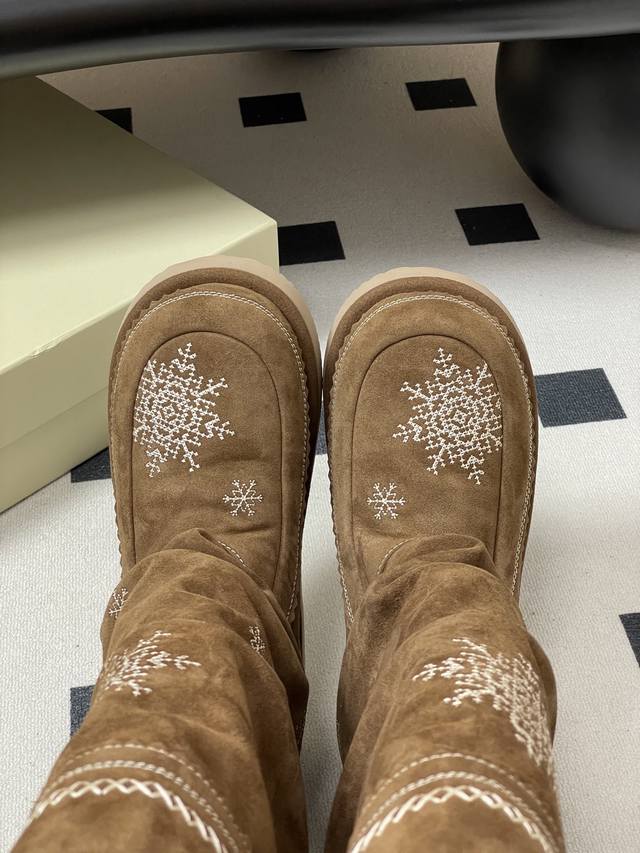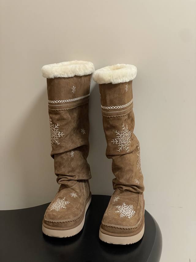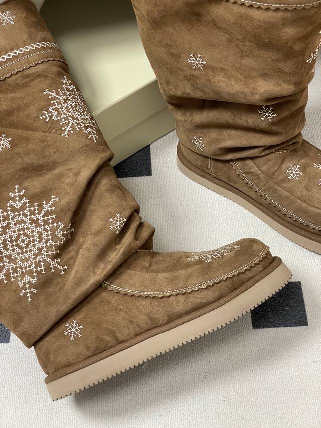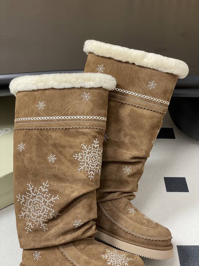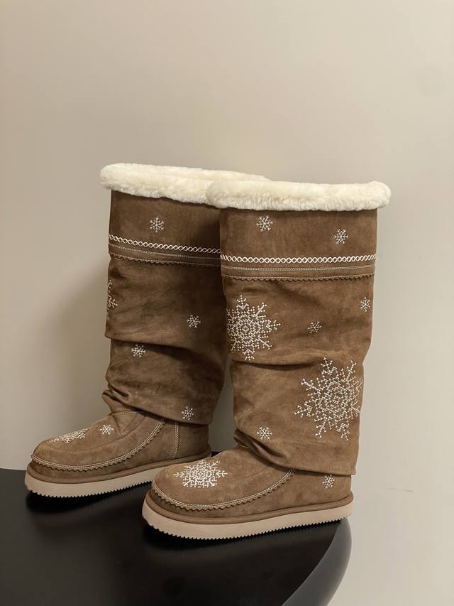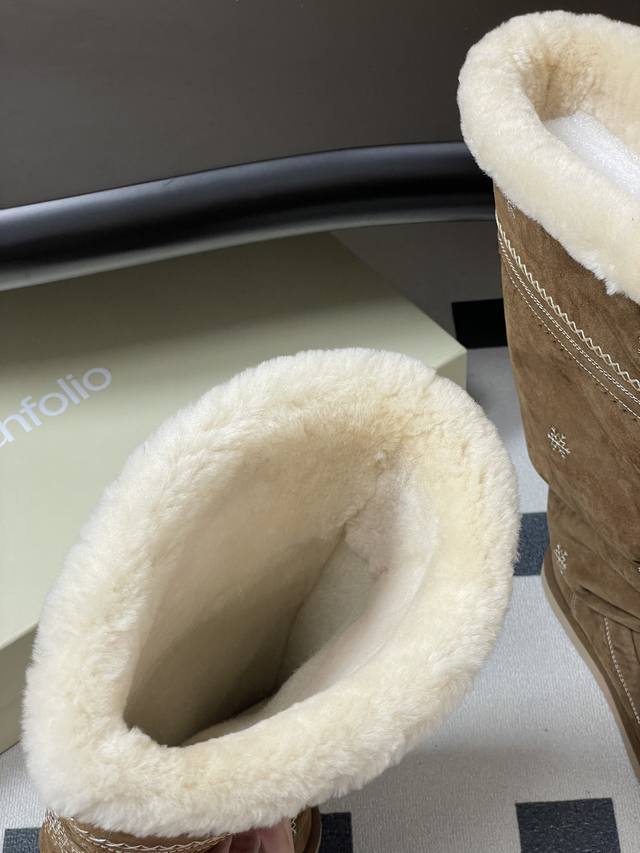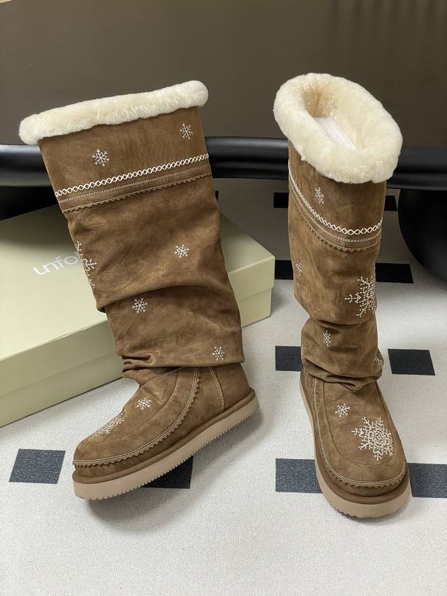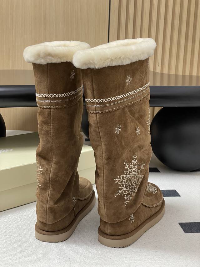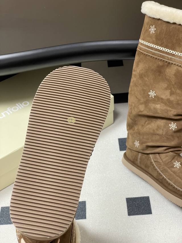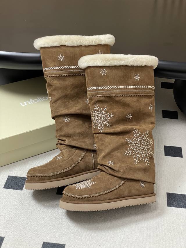 Niche brand Unfolio 25Fw Autumn/Winter New Popular Style Tassel Embroidered Thick-Soled Straight Snow Boots, Warm Wool Knee-High Boots, Ddd Lumi Wool Knee-High Boots. These wool knee-high boots come in light khaki and dark teddy bear colors, soft tones suitable for various winter outfits, easily creating diverse looks. The upper is made of easy-to-clean synthetic leather, adorned with delicate embroidery, echoing the winter imagery in the design inspiration. The lining is made of thick wool blend material, fluffy and heat-locking, continuously protecting feet in low temperatures. The boot shape is rounded and full, accommodating various foot shapes. The boot height reaches below the knee and continues the brand's signature stacked design, enhancing the winter atmosphere while reducing cold air intrusion and improving warmth. The sole is made of 2.5 cm EVA foam material, significantly reducing foot burden and providing pressure-free walking for extended periods. The deep tread design improves ground adhesion, suitable for daily commutes, short outdoor trips, and other scenarios, combining practicality and style. Upper: Cow suede; Lining/Insole: Wool; Outsole: Open-mold rubber outsole; Sizes: 35-39, 40-41 (Made to order, no returns or exchanges).