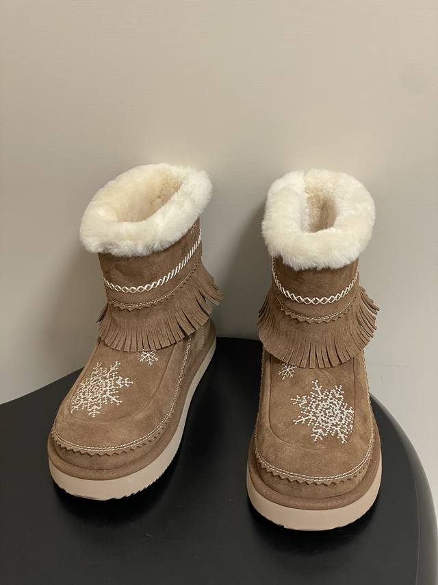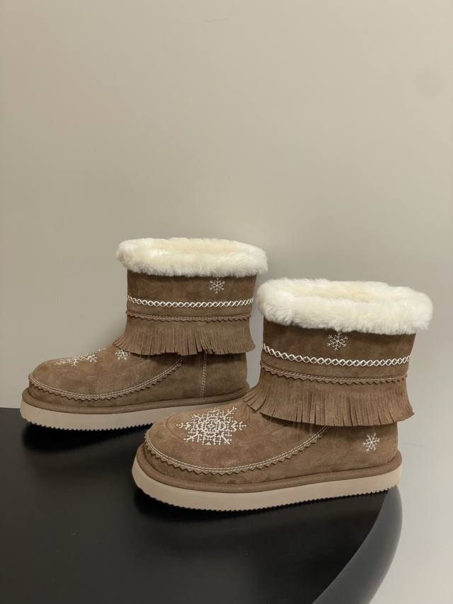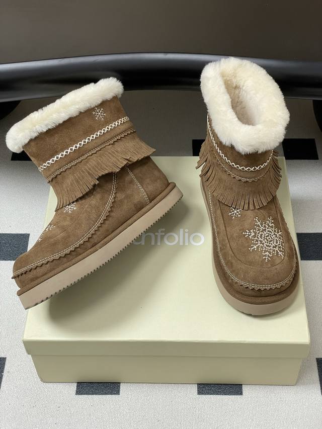 Niche brand Unfolio 25Fw Autumn/Winter New Popular Style Tassel Embroidered Thick-Soled Short Snow Boots, Ddd Lumi Wool Ankle Boots. Available in light khaki and dark teddy bear colors, the soft tones easily complement various winter outfits. The upper is made of suede cowhide, durable and easy to clean, making daily care worry-free. It is also adorned with delicate embroidery, echoing the winter imagery in the design inspiration. The lining is made of thick wool, fluffy and warm, effectively locking in foot warmth in low temperatures. The rounded and full boot shape accommodates various foot shapes, balancing comfort and a sleek look. The sole is made of Ddd 2.5 cm EVA foam, significantly reducing foot burden and preventing fatigue even after long walks. The deep tread design enhances ground grip, making walking more secure in various daily scenarios, meeting the needs of commuting and short trips. Upper: Cow suede; Lining/Insole: Wool; Outsole: Open-mold rubber outsole; Sizes: 35-39, 40-41 (Made to order, no returns or exchanges).